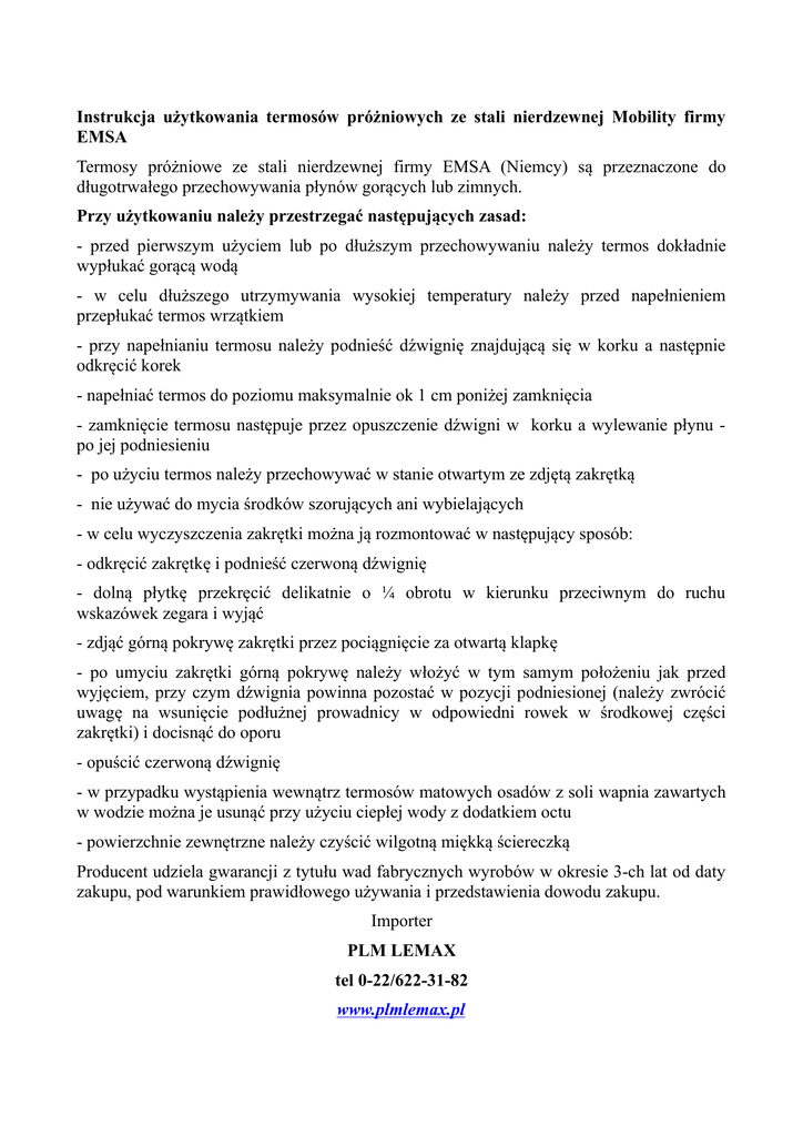 Instrukcja użytkowania termosów próżniowych ze stali nierdzewnej Mobility firmy EMSA Termosy próżniowe ze stali nierdzewnej firmy EMSA (Niemcy) są przeznaczone do długotrwałego przechowywania płynów gorących lub zimnych. Przy użytkowaniu należy przestrzegać następujących zasad: - przed pierwszym użyciem lub po dłuższym przechowywaniu należy termos dokładnie wypłukać gorącą wodą - w celu dłuższego utrzymywania wysokiej temperatury należy przed napełnieniem przepłukać termos wrzątkiem - przy napełnianiu termosu należy podnieść dźwignię znajdującą się w korku a następnie odkręcić korek - napełniać termos do poziomu maksymalnie ok 1 cm poniżej zamknięcia - zamknięcie termosu następuje przez opuszczenie dźwigni w korku a wylewanie płynu po jej podniesieniu - po użyciu termos należy przechowywać w stanie otwartym ze zdjętą zakrętką - nie używać do mycia środków szorujących ani wybielających - w celu wyczyszczenia zakrętki można ją rozmontować w następujący sposób: - odkręcić zakrętkę i podnieść czerwoną dźwignię - dolną płytkę przekręcić delikatnie o ¼ obrotu w kierunku przeciwnym do ruchu wskazówek zegara i wyjąć - zdjąć górną pokrywę zakrętki przez pociągnięcie za otwartą klapkę - po umyciu zakrętki górną pokrywę należy włożyć w tym samym położeniu jak przed wyjęciem, przy czym dźwignia powinna pozostać w pozycji podniesionej (należy zwrócić uwagę na wsunięcie podłużnej prowadnicy w odpowiedni rowek w środkowej części zakrętki) i docisnąć do oporu - opuścić czerwoną dźwignię - w przypadku wystąpienia wewnątrz termosów matowych osadów z soli wapnia zawartych w wodzie można je usunąć przy użyciu ciepłej wody z dodatkiem octu - powierzchnie zewnętrzne należy czyścić wilgotną miękką ściereczką Producent udziela gwarancji z tytułu wad fabrycznych wyrobów w okresie 3-ch lat od daty zakupu, pod warunkiem prawidłowego używania i przedstawienia dowodu zakupu. Importer PLM LEMAX tel 0-22/622-31-82 www.plmlemax.pl