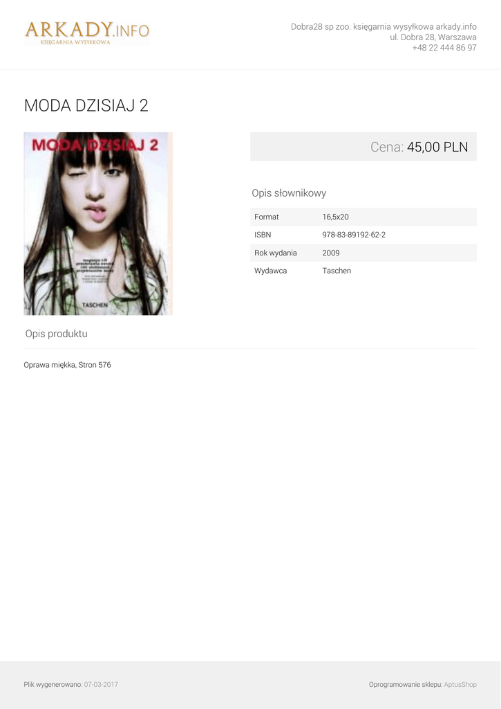 Dobra28 sp zoo. księgarnia wysyłkowa arkady.info ul. Dobra 28, Warszawa +48 22 444 86 97 MODA DZISIAJ 2 Cena: 45,00 PLN Opis słownikowy Format 16,5x20 ISBN 978-83-89192-62-2 Rok wydania 2009 Wydawca Taschen Opis produktu Oprawa miękka, Stron 576 Plik wygenerowano: 07-03-2017 Powered by TCPDF (www.tcpdf.org) Oprogramowanie sklepu: AptusShop