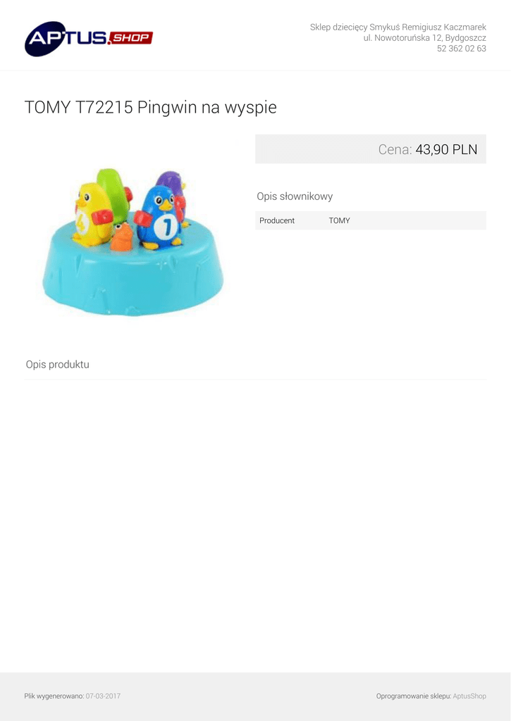 Sklep dziecięcy Smykuś Remigiusz Kaczmarek ul. Nowotoruńska 12, Bydgoszcz 52 362 02 63 TOMY T72215 Pingwin na wyspie Cena: 43,90 PLN Opis słownikowy Producent TOMY Opis produktu Plik wygenerowano: 07-03-2017 Powered by TCPDF (www.tcpdf.org) Oprogramowanie sklepu: AptusShop