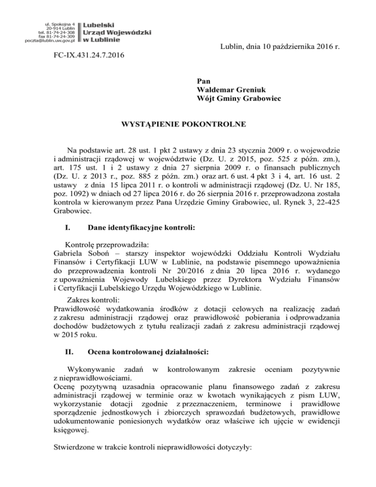Lublin, dnia 10 października 2016 r. FC-IX.431.24.7.2016 Pan Waldemar Greniuk Wójt Gminy Grabowiec WYSTĄPIENIE POKONTROLNE Na podstawie art. 28 ust. 1 pkt 2 ustawy z dnia 23 stycznia 2009 r. o wojewodzie i administracji rządowej w województwie (Dz. U. z 2015, poz. 525 z późn. zm.), art. 175 ust. 1 i 2 ustawy z dnia 27 sierpnia 2009 r. o finansach publicznych (Dz. U. z 2013 r., poz. 885 z późn. zm.) oraz art. 6 ust. 4 pkt 3 i 4, art. 16 ust. 2 ustawy z dnia 15 lipca 2011 r. o kontroli w administracji rządowej (Dz. U. Nr 185, poz. 1092) w dniach od 27 lipca 2016 r. do 26 sierpnia 2016 r. przeprowadzona została kontrola w kierowanym przez Pana Urzędzie Gminy Grabowiec, ul. Rynek 3, 22-425 Grabowiec. I. Dane identyfikacyjne kontroli: Kontrolę przeprowadziła: Gabriela Soboń – starszy inspektor wojewódzki Oddziału Kontroli Wydziału Finansów i Certyfikacji LUW w Lublinie, na podstawie pisemnego upoważnienia do przeprowadzenia kontroli Nr 20/2016 z dnia 20 lipca 2016 r. wydanego z upoważnienia Wojewody Lubelskiego przez Dyrektora Wydziału Finansów i Certyfikacji Lubelskiego Urzędu Wojewódzkiego w Lublinie. Zakres kontroli: Prawidłowość wydatkowania środków z dotacji celowych na realizację zadań z zakresu administracji rządowej oraz prawidłowość pobierania i odprowadzania dochodów budżetowych z tytułu realizacji zadań z zakresu administracji rządowej w 2015 roku. II. Ocena kontrolowanej działalności: Wykonywanie zadań w kontrolowanym zakresie oceniam pozytywnie z nieprawidłowościami. Ocenę pozytywną uzasadnia opracowanie planu finansowego zadań z zakresu administracji rządowej w terminie oraz w kwotach wynikających z pism LUW, wykorzystanie dotacji zgodnie z przeznaczeniem, terminowe i prawidłowe sporządzenie jednostkowych i zbiorczych sprawozdań budżetowych, prawidłowe udokumentowanie poniesionych wydatków oraz właściwe ich ujęcie w ewidencji księgowej. Stwierdzone w trakcie kontroli nieprawidłowości dotyczyły: - nieustalenia planu finansowego zadań z zakresu administracji rządowej w formie zarządzenia, - nieokreślenia w zakresach czynności pracowników ani innej dokumentacji, jaka część etatu związana jest z realizacją zadań zleconych, - podania w rozliczeniu dotacji celowej na zadania z zakresu administracji w dziale 750, rozdziale 75011, paragrafie 2010 innej liczby czynności niż wynikająca z dokumentacji źródłowej, raportów i statystyk, - pobrania dotacji z tytułu realizacji zadań z zakresu administracji rządowej w rozdziale 75011 w nadmiernej wysokości w kwocie 1 194,82 zł, z której kwota 841,85 zł została zwrócona na rachunek LUW, - nieterminowego odprowadzenia dochodów budżetowych pobranych w związku z realizacją zadań z zakresu administracji rządowej w kwocie 2 033,41 zł, stanowiącej 8,62 % dochodów przekazanych z rozdziału 85212. III. Opis ustalonego stanu faktycznego Kierownikiem kontrolowanej jednostki jest Pan Waldemar Greniuk – Wójt Gminy Grabowiec wybrany na to stanowisko w dniu 30 listopada 2014 r. w wyborach bezpośrednich na wójta, burmistrza i prezydenta miasta. [ Kopie zaświadczenia Gminnej Komisji Wyborczej w Grabowcu, aktu nawiązania stosunku pracy z wyboru z dnia 5 grudnia 2014 r. – akta kontroli: str. 23-24] Skarbnikiem Gminy Grabowiec od dnia 1 maja 2002 r. jest Pani Małgorzata Surma powołana na to stanowisko uchwałą Nr XXXII/164/2002 Rady Gminy Grabowiec z dnia 30 kwietnia 2002 r. w sprawie powołania skarbnika gminy. Obowiązki i odpowiedzialność głównego księgowego zostały powierzone skarbnikowi przez wójta gminy w dniu 10 lutego 2003 r. [Kopie ww. uchwały i zakresu obowiązków- akta kontroli: str. 25-27] 1. Plan finansowy zadań z zakresu administracji rządowej. Budżet na rok 2015 Gminy Grabowiec przyjęty został uchwałą Nr III/8/2014 Rady Gminy Grabowiec z dnia 30 grudnia 2014 r. w sprawie uchwały budżetowej na rok 2015. Kwoty przyjętych w budżecie Gminy Grabowiec dochodów z tytułu dotacji celowych na realizację zadań z zakresu administracji rządowej i inne zadania zlecone gminie ustawami oraz wydatki finansowane z tych dotacji są zgodne z wielkościami określonymi w piśmie Lubelskiego Urzędu Wojewódzkiego w Lublinie z dnia 23 października 2014 r. znak FC-I.3110.24.2014. [Kopia pisma- akta kontroli: str. 28-30] Dotacje na zadania z zakresu administracji rządowej przeznaczone zostały na: - administrację publiczną (Dział 750) – kwota 45 590,00 zł, - pomoc społeczną (Dział 852) – kwota 1 152 200,00 zł. Plan finansowy zadań z zakresu administracji rządowej oraz innych zadań zleconych j.s.t. odrębnymi ustawami na rok 2015 został podpisany przez Wójta Gminy Grabowiec dnia 2 stycznia 2015 r., tj. w terminie określonym w art. 249 ust. 1 ustawy z dnia 27 sierpnia 2009 r. o finansach publicznych (Dz. U. z 2013 r. poz. 885 z późn. zm.). Plan finansowy nie został natomiast ustalony zarządzeniem wójta. 2 Wyjaśnienie do powyższego złożył w dniu 17 sierpnia 2016 r. Wójt Gminy Grabowiec, które dołączono do akt kontroli. [Kopia „ Planu finansowego…”, wyjaśnienie Wójta Gminy- akta kontroli: str. 31-35] Plan finansowy zadań z zakresu administracji rządowej na rok 2015 został sporządzony: - w kwotach zgodnych z wielkościami przyjętymi w budżecie gminy i informacją przekazaną przez Wojewodę Lubelskiego, - z zastosowaniem prawidłowej klasyfikacji budżetowej dochodów z tytułu dotacji celowych i wydatków finansowanych z tych dotacji, - z zastosowaniem prawidłowej klasyfikacji dochodów związanych z realizacją zadań z zakresu administracji rządowej, które podlegają przekazaniu do budżetu państwa, wskazującej na źródło powstania dochodów. Kwoty dotacji celowych na realizację zadań zleconych z zakresu administracji rządowej w trakcie 2015 r. i wielkość ponoszonych na ten cel wydatków w budżecie Gminy Grabowiec zostały zwiększone o kwotę 795 742,33 zł, tj. o 39,92 % w tym