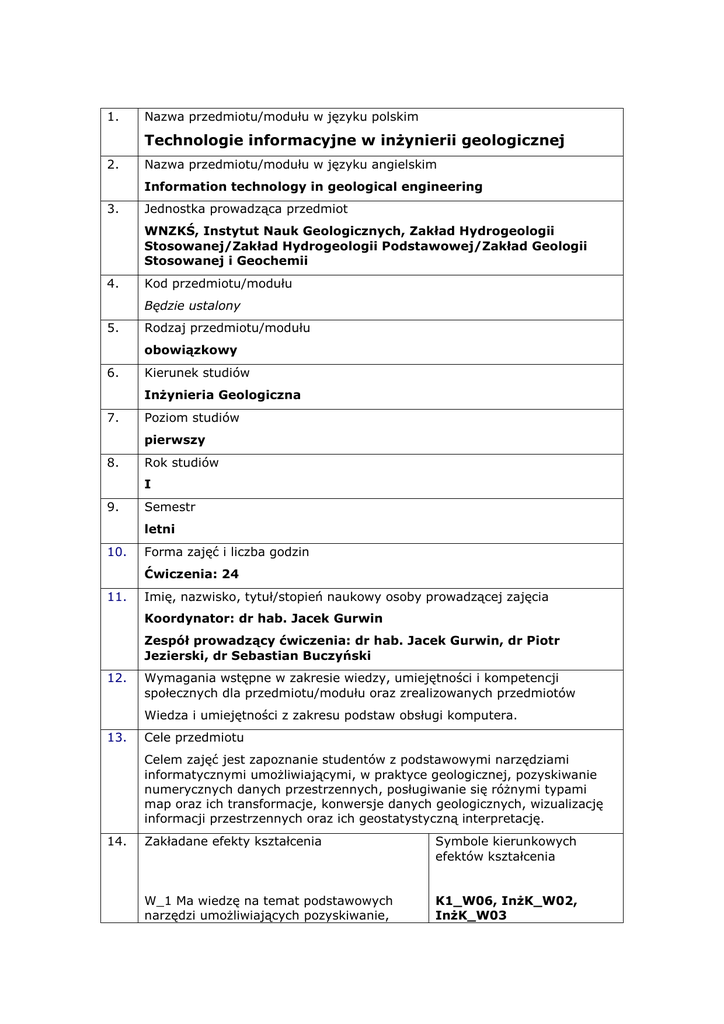 1. Nazwa przedmiotu/modułu w języku polskim Technologie informacyjne w inżynierii geologicznej 2. Nazwa przedmiotu/modułu w języku angielskim Information technology in geological engineering 3. Jednostka prowadząca przedmiot WNZKŚ, Instytut Nauk Geologicznych, Zakład Hydrogeologii Stosowanej/Zakład Hydrogeologii Podstawowej/Zakład Geologii Stosowanej i Geochemii 4. Kod przedmiotu/modułu Będzie ustalony 5. Rodzaj przedmiotu/modułu obowiązkowy 6. Kierunek studiów Inżynieria Geologiczna 7. Poziom studiów pierwszy 8. Rok studiów I 9. Semestr letni 10. Forma zajęć i liczba godzin Ćwiczenia: 24 11. Imię, nazwisko, tytuł/stopień naukowy osoby prowadzącej zajęcia Koordynator: dr hab. Jacek Gurwin Zespół prowadzący ćwiczenia: dr hab. Jacek Gurwin, dr Piotr Jezierski, dr Sebastian Buczyński 12. Wymagania wstępne w zakresie wiedzy, umiejętności i kompetencji społecznych dla przedmiotu/modułu oraz zrealizowanych przedmiotów Wiedza i umiejętności z zakresu podstaw obsługi komputera. 13. Cele przedmiotu Celem zajęć jest zapoznanie studentów z podstawowymi narzędziami informatycznymi umożliwiającymi, w praktyce geologicznej, pozyskiwanie numerycznych danych przestrzennych, posługiwanie się różnymi typami map oraz ich transformacje, konwersje danych geologicznych, wizualizację informacji przestrzennych oraz ich geostatystyczną interpretację. 14. Zakładane efekty kształcenia Symbole kierunkowych efektów kształcenia W_1 Ma wiedzę na temat podstawowych narzędzi umożliwiających pozyskiwanie, K1_W06, InżK_W02, InżK_W03 selekcję oraz przetwarzanie geologicznej i środowiskowej informacji przestrzennej 15. W_2 Ma wiedzę na temat roli mapy jako narzędzia wykorzystywanego w inżynierskich pracach geologicznych; zna rodzaje i typy map oraz ich strukturę i budowę K1_W06, InżK_W03 U_1 Potrafi pozyskiwać podstawowe informacje przestrzenne z różnych źródeł K1_U10, U_2 Potrafi identyfikować, selekcjonować, przekształcać i rejestrować wybrane mapy oraz elementy map różnego typu K1_U08, InżK_U03 U_3 Potrafi wizualizować w postaci warstw informacyjnych dane geologiczne i środowiskowe K1_U08, InżK_U03 U_4 Potrafi wykorzystać wybrane kody numeryczne do analizy i interpretacji geostatystycznej podstawowych danych geologicznych i środowiskowych K1_U07, K1_U08, InżK_U03 K_1 Ma świadomość roli narzędzi geoinformatycznych w opisie, interpretacji i zarządzaniu środowiskiem geologicznym i wykazuje potrzebę stałego poszerzania swojej wiedzy w tym zakresie Treści programowe K1_K06, InżK_K01 Ćwiczenia: Cechy i rodzaje informacji przestrzennych. Pozyskiwanie informacji przestrzennych. Podstawowe kody i programy wykorzystywane do wizualizacji, przetwarzania i interpretacji informacji przestrzennych. Mapy i ich typy (rastrowe, hybrydowe, wektorowe). Warstwy, obiekty, atrybuty map. Układy odniesienia, układy współrzędnych i transformacje pomiędzy układami, geokodowanie, skale map. Przetwarzanie map (skanowanie, wektoryzacja, digitalizacja). Modele i konwersja danych. Kalibracja map. Rejestracja map. Tworzenie podstawowych map 2D oraz wizualizacji 3D. Geostatystyczne modele zmienności informacji przestrzennej i ich interpretacja 16. Zalecana literatura Literatura podstawowa: Bielecka E., 2006, Systemy informacji geograficznej. Teoria i zastosowania. Wydawnictwo PJWSTK, Warszawa. Felcenloben D., 2001, Geoinformacja. Wprowadzenie do systemów organizacji danych i wiedzy. Wydawnictwo Gall, Katowice. Kaczmarek L., Medyńsk-Gulij B. 2007, Źródła i metody pozyskiwania danych w badaniach środowiska przyrodniczego. Bogucki Wydawnictwo Naukowe, Poznań. Gaździcki J., 1975, Informatyka w geodezji i kartografii. PPWK, Warszawa. Literatura uzupełniająca: 17. Kokesz, Z, Nieć, M., 1992: Metody geostatystyczne w rozpoznawaniu i dokumentowaniu złóż oraz w ochronie środowiska. Studia i Rozprawy CPPGSMiE PAN nr 19, Kraków, 1-51. Namysłowska-Wilczyńska, B., 2006: Geostatystyka. Teoria i zastosowania. Oficyna Wydawnicza Politechniki Wrocławskiej, Wrocława, 1-356. Urbański J., 1997, Zrozumieć GIS. Wydawnictwo Naukowe PWN, Warszawa, 144. Zawadzki J., 2011, Metody geostatystyczne dla kierunków przyrodniczych i technicznych. Oficyna Wydawnicza Politechniki Warszawskiej, Warszawa. Forma zaliczenia poszczególnych komponentów przedmiotu/modułu, sposób sprawdzenia osiągnięcia zamierzonych efektów kształcenia: Ćwiczenia: Sprawozdanie pisemne - ocena na podstawie 3-4 opracowań z wykonanych zadań. Wynik pozytywny - uzyskanie co najmniej 50% punktów. W_1, W_2, U_1, U_2, U_3, U_4, K_1 18. Język wykładowy polski 19. Obciążenie pracą studenta: Forma aktywności studenta Średnia liczba godzin na zrealizowanie aktywności Godziny zajęć (wg planu studiów) z nauczycielem: - ćwiczenia: 24 24 Praca własna studenta np.: - przygotowanie do zajęć: 10 - opracowanie wyników: 10 35 - czytanie wskazanej literatury: 5 - napisanie raportu z zajęć: 10 Suma godzin Liczba punktów ECTS 59 3