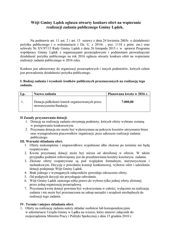 Wójt Gminy Lądek ogłasza otwarty konkurs ofert na wspieranie realizacji zadania publicznego Gminy Lądek. Na podstawie art. 11 ust. 2 i art. 13 ustawy z dnia 24 kwietnia 2003r. o działalności pożytku publicznego i o wolontariacie ( Dz. U. z 2014r. , poz. 1118 z póżn. zm.) oraz uchwały Nr XV/97/15 Rady Gminy Lądek z dnia 26 listopada 2015 r. w sprawie Programu współpracy Gminy Lądek z organizacjami pozarządowymi i podmiotami prowadzącymi działalność pożytku publicznego na rok 2016 ogłasza otwarty konkurs ofert na wspieranie realizacji zadania publicznego w 2016 roku. Konkurs jest adresowany do organizacji pozarządowych i innych podmiotów, których celem jest prowadzenie działalności pożytku publicznego. I. Rodzaj zadania i wysokość środków publicznych przeznaczonych na realizację tego zadania. Lp. Nazwa zadania 1. Dotacja półkolonii letnich organizowanych przez stowarzyszenie/fundacje. Planowana kwota w 2016 r. 7.000,00 II Zasady przyznawania dotacji. 1. Dotację na realizację zadania otrzymują podmioty, których oferty wybrane zostaną w postępowaniu konkursowym. 2. Przyznana dotacja nie może być wykorzystana na pokrycie kosztów utrzymania biura oraz wynagrodzenia pracowników organizacji, poza zakresem realizacji zadania publicznego. III. Warunki składania ofert. 1. Oferty niekompletne i nieprawidłowo wypełnione albo złożone po terminie nie będą rozpatrywane. 2. Kwota przyznanej dotacji może być niższa od określonej w ofercie. W takim przypadku podmiot zobowiązany jest do przedstawienia korekty kosztorysu zadania. 3. Złożone oferty rozpatrywane są pod względem formalnym, merytorycznym i rachunkowym. Decyzję o powołaniu komisji konkursowej, wyborze ofert i udzieleniu dotacji podejmuje Wójt Gminy Lądek. 4. Brak jednego z wymaganych załączników powoduje odrzucenie oferty. 5. Od podjętych decyzji nie przysługuje odwołanie. 6. Wójt Gminy Lądek zastrzega sobie prawo do wyboru tylko jednej oferty złożonej przez jedną organizację pozarządową. 7. Przyznana kwota dotacji powinna być wykorzystana w całości, wyłącznie na realizację zadania i nie może być przeznaczona na zakup narzędzi i urządzeń niezbędnych do realizacji tego zadania. IV. Termin i miejsce składania ofert. 1. Oferty na realizację zadania należy składać osobiście lub korespondencyjnie w sekretariacie Urzędu Gminy w Lądku na wzorze, który stanowi załącznik do rozporządzenia Ministra Pracy i Polityki Społecznej z dnia 15 grudnia 2010 r. w sprawie wzoru oferty i ramowego wzoru umowy dotyczących realizacji zadania publicznego oraz wzoru sprawozdania z wykonania tego zadania /Dz. U. z 2011 roku, Nr 6, poz.25 /. Ofertę należy składać w zaklejonej i opieczętowanej kopercie podając nazwę zadania, z dopiskiem „Konkurs Ofert” w terminie 21 dni od daty ukazania się ogłoszenia (decyduje data wpływu). 2. Termin składania ofert upływa 17.05.2016r. do godziny 15.15. 3. Nie będą przyjmowane oferty przesłane drogą elektroniczną lub faksem. V. Tryb i kryteria stosowane przy wyborze oferty oraz termin dokonania wyboru oferty. Ofertę należy sporządzić na formularzu według wzoru stanowiącego załącznik do Rozporządzenia Ministra Pracy i Polityki Społecznej z dnia 15 grudnia 2010 roku w sprawie wzoru oferty i ramowego wzoru umowy dotyczących realizacji zadania publicznego oraz wzoru sprawozdania z wykonania tego zadania /Dz. U. z 2011 roku, Nr 6, poz.25) określając: 1. Szczegółowy zakres rzeczowy proponowanego do realizacji zadania zawierający opis planowanego działania, 2. Termin i miejsce realizacji zadania, 3. Kalkulację przewidywanych kosztów realizacji zadania z określeniem liczby uczestników, 4.Informację o posiadanych zasobach rzeczowych i kadrowych – wskazujących na możliwość wykonania zadania, 5. Informację o wysokości środków finansowych własnych albo pozyskanych na realizację zadania, 6. Informacje o wcześniejszej działalności podmiotu składającego ofertę w zakresie, którego dotyczy zadanie, 7. Inne informacje wymagane zgodnie z ogłoszeniem o otwartym konkursie ofert. 8. Rozpatrywane będą wyłącznie oferty, w których wkład własny podmiotu w realizację zadania wynosi min. 10% kosztów całkowitych ( wkład poza finansowy może być przeliczony jako wkład finansowy i wykazany jako środki finansowe własne przy realizacji zadania ). 9. Oferty złożone na niewłaściwych drukach, niekompletne lub złożone po terminie zostaną odrzucone z przyczyn formalnych. 10. Przy wyborze ofert pod uwagę brane będą następujące kryteria: - zgodność merytoryczna oferty z celami statutowymi podmiotu, - zasoby materialne i kadrowe oferenta zapewniające prawidłową realizację zadania, - kompletność oferty, - adekwatność programu w odniesieniu do potrzeb grupy docelowej, - adekwatność kosztów realizacji zadania w odniesieniu do zakresu rzeczowego zadania, - rekomendacje, - rzetelne i terminowe wykonywanie innych zadań zleconych, - dotychczasowe doświadczenie oferenta przy realizacji podobnych zadań, - możliwości organizacyjne, materialne i kadrowe niezbędne do realizacji zadania, - kwalifikacje i kompetencje osób realizujących projekt. 11. Wyniki otwartego konkursu zostaną ogłoszone do dnia 18.05.2016r. i dostępne będą na tablicy ogłoszeń Urzędu Gminy Lądek, Biuletynie Informacji Publicznej www.bip.gmina-ladek.pl oraz na stronie internetowej gminy; www.gminaladek.pl VI. Wymagane dokumenty. 1. Wypełniony wniosek oferty konkursowej (zgodny z rozporządzeniem Ministra Pracy i Polityki Społecznej z dnia 15 grudnia 2010 r. w sprawie wzoru oferty i ramowego wzoru umowy dotyczących realizacji zadania publicznego oraz wzoru sprawozdania z wykonania tego zadania) wraz z wykazem ponumerowanych załączników. 2. Statut organizacji. 3. Aktualny wyciąg z rejestru. 4. Sprawozdanie finansowe i merytoryczne z działania podmiotu za ubiegły rok. 5. Kserokopie kwalifikacji kadry