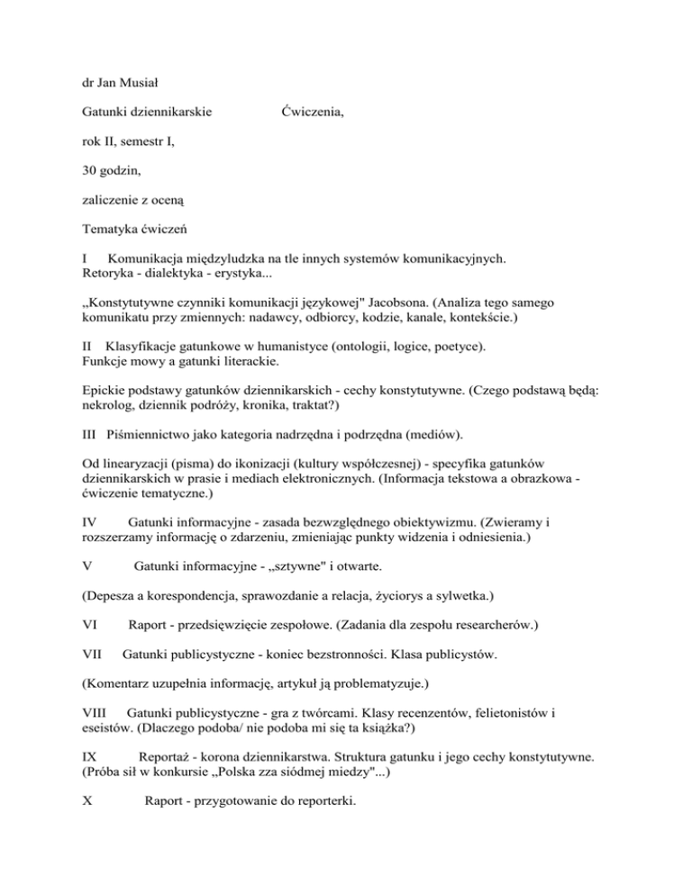dr Jan Musiał Gatunki dziennikarskie Ćwiczenia, rok II, semestr I, 30 godzin, zaliczenie z oceną Tematyka ćwiczeń I Komunikacja międzyludzka na tle innych systemów komunikacyjnych. Retoryka - dialektyka - erystyka... „Konstytutywne czynniki komunikacji językowej" Jacobsona. (Analiza tego samego komunikatu przy zmiennych: nadawcy, odbiorcy, kodzie, kanale, kontekście.) II Klasyfikacje gatunkowe w humanistyce (ontologii, logice, poetyce). Funkcje mowy a gatunki literackie. Epickie podstawy gatunków dziennikarskich - cechy konstytutywne. (Czego podstawą będą: nekrolog, dziennik podróŜy, kronika, traktat?) III Piśmiennictwo jako kategoria nadrzędna i podrzędna (mediów). Od linearyzacji (pisma) do ikonizacji (kultury współczesnej) - specyfika gatunków dziennikarskich w prasie i mediach elektronicznych. (Informacja tekstowa a obrazkowa ćwiczenie tematyczne.) IV Gatunki informacyjne - zasada bezwzględnego obiektywizmu. (Zwieramy i rozszerzamy informację o zdarzeniu, zmieniając punkty widzenia i odniesienia.) V Gatunki informacyjne - „sztywne" i otwarte. (Depesza a korespondencja, sprawozdanie a relacja, Ŝyciorys a sylwetka.) VI VII Raport - przedsięwzięcie zespołowe. (Zadania dla zespołu researcherów.) Gatunki publicystyczne - koniec bezstronności. Klasa publicystów. (Komentarz uzupełnia informację, artykuł ją problematyzuje.) VIII Gatunki publicystyczne - gra z twórcami. Klasy recenzentów, felietonistów i eseistów. (Dlaczego podoba/ nie podoba mi się ta ksiąŜka?) IX ReportaŜ - korona dziennikarstwa. Struktura gatunku i jego cechy konstytutywne. (Próba sił w konkursie „Polska zza siódmej miedzy"...) X Raport - przygotowanie do reporterki. (Analiza materiałów do raportu pod kątem ich rozwojowej przydatności do reportaŜu.) XI Sprostowanie i polemika - formy marginalne czy nadgatunkowe? (Równoprawne wchodzenie we współczesne debaty.) XII Gatunki pograniczne - wywiad i jego wielokrotności (dyskusja, debata). Typy wywiadów: informacyjny, publicystyczny, portretowy. (Strukturalna analiza wywiadów przeprowadzonych przy sporządzaniu raportu.) XIII Hipertekst - hybryda gatunkowa. (Wyszukiwanie w internecie przykładów hipertekstów i analiza pod kątem ich hybrydyczności.) XIV Dokumentacja prasowa - fundament gatunkowej sprawności dziennikarza (W rolach dziennikarzy: sądowego, sejmowego, sportowego - z czym do tematu.) Literatura S. Dąbrowski, Zagadnienie określeń i wyznaczników literackości [w:] Problemy teorii literatury, Wrocław 1976. M. Głowiński, Nowomowa po polsku, Warszawa 1991. W. Furman, A. Koliszewski, K. Wolny, Gatunki dziennikarskie, Rzeszów 2000. S. Kisielewski, 100 razy głową w ściany [w:] Pisma wybrane, Warszawa 1997. A. Magdoń, Reporter i jego warsztat, Kraków 2000. W. Pisarek, Nowa retoryka dziennikarska, Kraków 2002. A. Schopenhauer, Ery styka czyli sztuka prowadzenia sporów, Kraków 1973. Spór o Polską 1989-1999. Wybór tekstów prasowych, opr. P. Śpiewak, Warszawa 2000. A. Strońska, Dopóki milczy Ukraina, Warszawa 1998. J. Tuszyński, Paradoks o słowie i dźwięku, Toruń 2002. M. Wańkowicz, Dzieje rodziny Korzeniewskich [w:] Dzieła emigracyjne, t. 3, Warszawa 1991. B. Witosz, Gatunek - sporny problem współczesnej refleksji tekstologicznej [w:] Sporne i bezsporne problemy współczesnej wiedzy o literaturze, Warszawa 2002. K. Wolny-Zmorzyński, Mistrzowie reportaŜu, Rzeszów 2001.