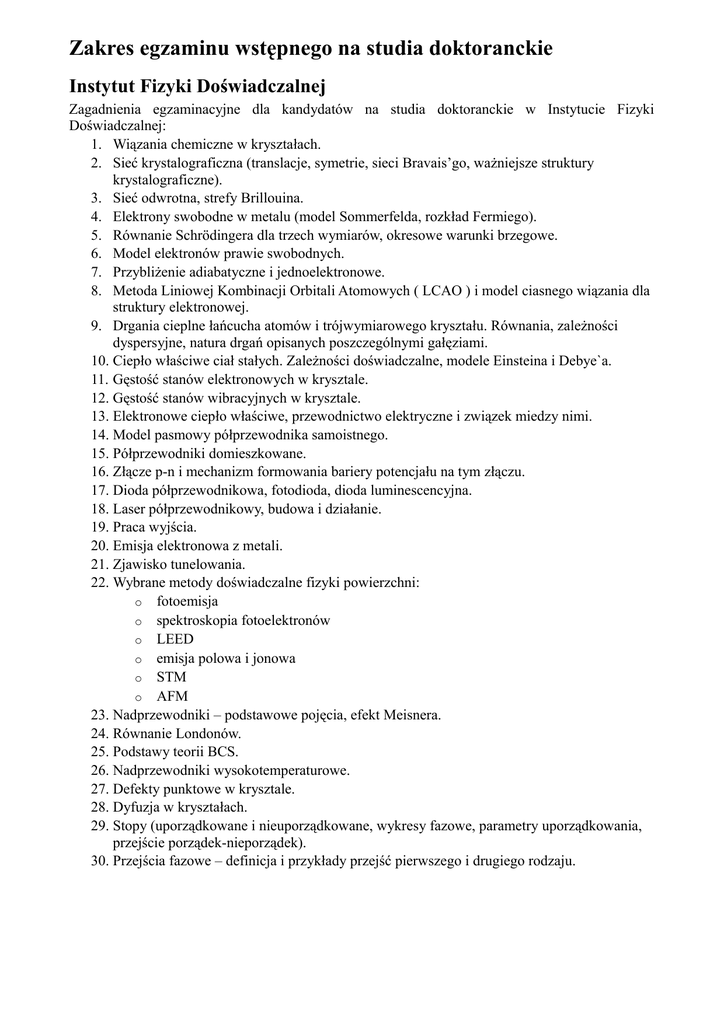 Zakres egzaminu wstępnego na studia doktoranckie Instytut Fizyki Doświadczalnej Zagadnienia egzaminacyjne dla kandydatów na studia doktoranckie w Instytucie Fizyki Doświadczalnej: 1. Wiązania chemiczne w kryształach. 2. Sieć krystalograficzna (translacje, symetrie, sieci Bravais’go, ważniejsze struktury krystalograficzne). 3. Sieć odwrotna, strefy Brillouina. 4. Elektrony swobodne w metalu (model Sommerfelda, rozkład Fermiego). 5. Równanie Schrödingera dla trzech wymiarów, okresowe warunki brzegowe. 6. Model elektronów prawie swobodnych. 7. Przybliżenie adiabatyczne i jednoelektronowe. 8. Metoda Liniowej Kombinacji Orbitali Atomowych ( LCAO ) i model ciasnego wiązania dla struktury elektronowej. 9. Drgania cieplne łańcucha atomów i trójwymiarowego kryształu. Równania, zależności dyspersyjne, natura drgań opisanych poszczególnymi gałęziami. 10. Ciepło właściwe ciał stałych. Zależności doświadczalne, modele Einsteina i Debye`a. 11. Gęstość stanów elektronowych w krysztale. 12. Gęstość stanów wibracyjnych w krysztale. 13. Elektronowe ciepło właściwe, przewodnictwo elektryczne i związek miedzy nimi. 14. Model pasmowy półprzewodnika samoistnego. 15. Półprzewodniki domieszkowane. 16. Złącze p-n i mechanizm formowania bariery potencjału na tym złączu. 17. Dioda półprzewodnikowa, fotodioda, dioda luminescencyjna. 18. Laser półprzewodnikowy, budowa i działanie. 19. Praca wyjścia. 20. Emisja elektronowa z metali. 21. Zjawisko tunelowania. 22. Wybrane metody doświadczalne fizyki powierzchni: o fotoemisja o spektroskopia fotoelektronów o LEED o emisja polowa i jonowa o STM o AFM 23. Nadprzewodniki – podstawowe pojęcia, efekt Meisnera. 24. Równanie Londonów. 25. Podstawy teorii BCS. 26. Nadprzewodniki wysokotemperaturowe. 27. Defekty punktowe w krysztale. 28. Dyfuzja w kryształach. 29. Stopy (uporządkowane i nieuporządkowane, wykresy fazowe, parametry uporządkowania, przejście porządek-nieporządek). 30. Przejścia fazowe – definicja i przykłady przejść pierwszego i drugiego rodzaju. Sugerowana literatura H. Ibach, H. Lüth: Fizyka ciała stałego C. Kittel: Wstęp do fizyki ciała stałego A. Oleś: Metody eksperymentalne fizyki ciała stałego Instytut Fizyki Teoretycznej Każdego kandydata obowiązuje znajomość podstaw mechaniki kwantowej. Oprócz tego kandydaci wybierają jedną z pięciu grup zagadnień bardziej szczegółowych: 1. teoria pola i cząstek elementarnych; 2. teoria fazy skondensowanej; 3. fizyka matematyczna; 4. teoria układów złożonych; 5. metody komputerowe fizyki. Podstawy mechaniki kwantowej 1. Stany i obserwable w mechanice kwantowej. o Przestrzeń stanów. o Zasada odpowiedniości i związki komutacyjne dla operatorów reprezentujących wielkości fizyczne. o Widmo i stany własne operatorów pędu i położenia. o Widmo i stany własne operatora energii oscylatora harmonicznego. o Zupełny zbiór obserwabli i reprezentacje. Pojęcie funkcji falowej. 2. Fizyczna interpretacja formalizmu mechaniki kwantowej. o Możliwe wyniki pomiarów wielkości fizycznych. o Prawdopodobieństwo uzyskania w pomiarze wielkości fizycznej określonych wartości (obserwable z widmem dyskretnym i ciągłym). o Wpływ pomiaru na stan układu. o Statystyczne charakterystyki stanów i obserwabli: wartość średnia i nieoznaczoność. o Zasada nieoznaczoności Heisenberga. 3. Rozwój czasowy układów kwantowych. o Równania ruchu w mechanice kwantowej. o Obraz Schrödingera i równanie Schrödingera z czasem, stany stacjonarne. o Obraz Heisenberga i równanie Heisenberga. o Równanie Ehrenfesta. o Prąd prawdopodobieństwa. o Ruch cząstki swobodnej, rozpływanie się paczek falowych. o Stany związane i rozproszeniowe. o Sformułowanie zagadnienia rozpraszania w jednym wymiarze. 4. Potencjały schodkowe w jednym wymiarze. o Skończona studnia potencjału. o Próg i bariera potencjału, zjawisko tunelowania. 5. Moment pędu o Podstawowe własności operatorów składowych i operatora kwadratu momentu pędu. o Widmo operatorów składowych i operatora kwadratu momentu pędu, orbitalna i magnetyczna liczba kwantowa. o Funkcje własne operatorów składowych i operatora kwadratu momentu pędu, Moment pędu i energia kinetyczna, ruch w polu sił centralnych. 6. Symetrie w mechanice kwantowej. o Unitarne operatory przesunięcia i obrotu. o Prawa zachowania pędu i momentu pędu. o 7. Atomu wodoru bez spinu. o Sprowadzenie do zagadnienia ruchu względnego. o Widmo operatora energii ruchu względnego, liczby kwantowe, degeneracja. o Interpretacja fizyczna i potwierdzenia doświadczalne. 8. Naładowana cząstka w zewnętrznym polu elektromagnetycznym. o Hamiltonian oddziaływania cząstki naładowanej z zewnętrznym polem elektromagnetycznym, przekształcenia cechowania. o Atom wodoru w zewnętrznym polu magnetycznym, normalne zjawisko Zeemana. o Atom wodoru w zewnętrznym polu elektrycznym, liniowe zjawisko Starka. 9. Spin o Podstawy doświadczalne (anomalne zjawisko Zeemana, struktura subtelna atomu wodoru, doświadczenie Sterna-Gerlacha, zakaz Pauliego i budowa układu okresowego pierwiastków). o Opis spinowych stopni swobody, przestrzeń stanów i operatory składowych spinu. o Spinowe stopnie swobody układu dwóch cząstek ze spinem. o Oddziaływanie cząstki ze spinem ½ z zewnętrznym polem elektromagne-tycznym, równanie Pauliego. o Cząstki identyczne, symetria funkcji falowych układu wielu cząstek. o Zakaz Pauliego i związek spinu ze statystyką. Literatura: R.L. Liboff, Introductory Quantum Mechanics L.I.Schiff, Quantum Mechanics, A.S. Dawydow, Quantum Mechanics L.D. Landau,L.L. Lifshits, Quantum Mechanics. Non-Relativistic Theory Zagadnienia szczegółowe 1. Teoria pola i cząstek elementarnych o Relatywistyczna mechanika kwantowa (równanie Diraca) Wyprowadzenie równania Diraca. Rozwiązania dla cząstki swobodnej (spin, pęd). Własności transformacyjne względem grupy Lorentza. Sprzężenie ładun