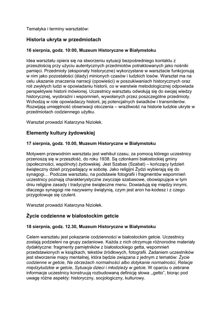 Tematyka i terminy warsztatów: Historia ukryta w przedmiotach 16 sierpnia, godz. 10:00, Muzeum Historyczne w Białymstoku Idea warsztatu opiera się na stworzeniu sytuacji bezpośredniego kontaktu z przeszłością przy użyciu autentycznych przedmiotów potraktowanych jako nośniki pamięci. Przedmioty (eksponaty historyczne) wykorzystane w warsztacie funkcjonują w nim jako pozostałości (ślady) minionych czasów i ludzkich losów. Warsztat ma na celu ukazanie znaczenia narracji (opowieści) w poszukiwaniach historycznych oraz roli zwykłych ludzi w opowiadaniu historii, co w warstwie metodologicznej odpowiada perspektywie historii mówionej. Uczestnicy warsztatu odwołują się do swojej wiedzy historycznej, wyobraźni i wspomnień, wywołanych przez poszczególne przedmioty. Wchodzą w role opowiadaczy historii, jej potencjalnych świadków i transmiterów. Rozwijają umiejętność obserwacji otoczenia – wrażliwość na historie ludzkie ukryte w przedmiotach codziennego użytku. Warsztat prowadzi Katarzyna Niziołek. Elementy kultury żydowskiej 17 sierpnia, godz. 10.00, Muzeum Historyczne w Białymstoku Motywem przewodnim warsztatu jest wehikuł czasu, za pomocą którego uczestnicy przenoszą się w przeszłość, do roku 1938. Są członkami białostockiej gminy (społeczności, wspólnoty) żydowskiej. Jest Szabas (Szabat) – kończący tydzień świąteczny dzień przypadający w sobotę. Jako religijni Żydzi wybierają się do synagogi… Podczas warsztatu, na podstawie fotografii i fragmentów wspomnień uczestnicy poznają charakterystyczne zwyczaje szabasowe, obowiązujące w tym dniu religijne zasady i tradycyjne świąteczne menu. Dowiadują się między innymi, dlaczego synagogi nie nazywamy świątynią, czym jest aron ha-kodesz i z czego przygotowuje się czulent. Warsztat prowadzi Katarzyna Niziołek. Życie codzienne w białostockim getcie 18 sierpnia, godz. 12.30, Muzeum Historyczne w Białymstoku Celem warsztatu jest pokazanie codzienności w białostockim getcie. Uczestnicy zostają podzieleni na grupy zadaniowe. Każda z nich otrzymuje różnorodne materiały dydaktyczne: fragmenty pamiętników z białostockiego getta, wspomnień przedstawionych w książkach, tekstów źródłowych, fotografii. Zadaniem uczestników jest stworzenie mapy mentalnej, która będzie związana z jednym z tematów: Życie codzienne w getcie, Na obrzeżach normalności albo dotykanie normalności, Relacje międzyludzkie w getcie, Sytuacja dzieci i młodzieży w getcie. W oparciu o zebrane informacje uczestnicy konstruują rozbudowaną definicję słowa ,,getto”, biorąc pod uwagę różne aspekty: historyczny, socjologiczny, kulturowy. Warsztat prowadzi Anna J. Kloza. Heroiny w żydowskim ruchu oporu 19 sierpnia, godz. 12.30, Muzeum Historyczne w Białymstoku Podczas warsztatu młodzież poznaje biografię niezwykłych żydowskich kobiet, które brały udział w ruchu oporu po aryjskiej stronie: Broni Klibański, Lisy Czapnik i Chajki Grossman. Uczestnicy otrzymują archiwalne fotografie dziewcząt i ich pierwszym zadaniem jest stworzenie fikcyjnej biografii każdej z nich. Następnie, korzystając z różnorodnych materiałów źródłowych, dokonają próby odpowiedzi na pytania: Dlaczego było to możliwe, iż dziewczęta mogły brać udział w ruchu oporu w getcie białostockim, będąc po aryjskiej stronie? Jakie zadania wykonywały? Jakie czynniki ułatwiały im, a jakie utrudniały realizację powierzonych zadań? Jakie emocje, uczucia, refleksje towarzyszyły im podczas pracy? Jak zakończyły się ich powojenne losy? Uczestnicy warsztatu przedstawiają efekty swojej pracy w wybranej przez siebie formie (np. mapa mentalna, kolaż, opowiedzenie losów postaci z jej perspektywy). Końcowa dyskusja jest próbą odpowiedzi na pytanie: Dlaczego powinniśmy pamiętać heroiny białostockiego getta. Warsztat prowadzi Anna J. Kloza. Bohaterowie bez broni w ręku 20 sierpnia, godz. 10.00, Muzeum Historyczne w Białymstoku Warsztat skierowany jest do starszych uczniów (III klasy gimnazjum i licealistów). Celem zajęć jest zapoznanie młodzieży z historycznym i społecznym kontekstem ratowania Żydów w czasie II wojny światowej. Na podstawie analizy fragmentów wybranych filmów fabularnych uczestnicy poznają szeroką gamę postaw Polaków wobec ludności żydowskiej. Natomiast przy użyciu schematu drzewa decyzyjnego i analizy SWAT konfrontują się z polską perspektywą dylematu – Czy pomagać Żydom?, a także żydowską – Czy skorzystać z oferowanej pomocy?. W toku zajęć uczniowie mają możliwość, by zastanowić się nad motywacją tytułowych bohaterów bez broni, którzy zdecydowali się podjąć ryzyko pomagania Żydom. Zajęcia kończą się stworzeniem wspólnego projektu graficznego prezentującego moralne znaczenie decyzji podjętych przez osoby odznaczone medalem Sprawiedliwy wśród Narodów Świata. Warsztat prowadzi Mariusz Sokołowski. Prowadzący warsztaty: Anna Janina Kloza – polonistka, działaczka społeczna, animatorka kultury. Absolwentka filologii polskiej na Uniwersytecie Warszawskim (filia w Białymstoku) i podyplomowych studiów dla absolwentów filologii polskiej na UwB. Pracuje w VI Liceum Ogólnokształcącym im. Króla Zygmunta Augusta w Białymstoku jako nauczyciel języka polskiego, a od 2011 r. jest również wicedyrektorem. Aktywnie działa na rzecz dialogu chrześcijańsko-żydowskiego, przywracania pamięci o Żydach podlaskich i Sprawiedliwych wśród Narodów Świata, interesuje się również edukacją międzykulturową i nauczaniem o Holokauście. Współpracuje z Operą i Filharmonią Podlaską – jest współautorką (wraz z M. Rusiłowicz) pakietu edukacyjnego związanego z musicalem „Korczak”. Uczestniczyła w wielu międzynarodowych szkołach, m.in w Yad Vashem w Izraelu, Berlinie, Nowym Jorku, Krakowie, Paryżu, Amsterdamie, gdzie zdobywała wiedzę na temat dziedzictwa żydowskiego i Holokaustu. W 2007 r. o