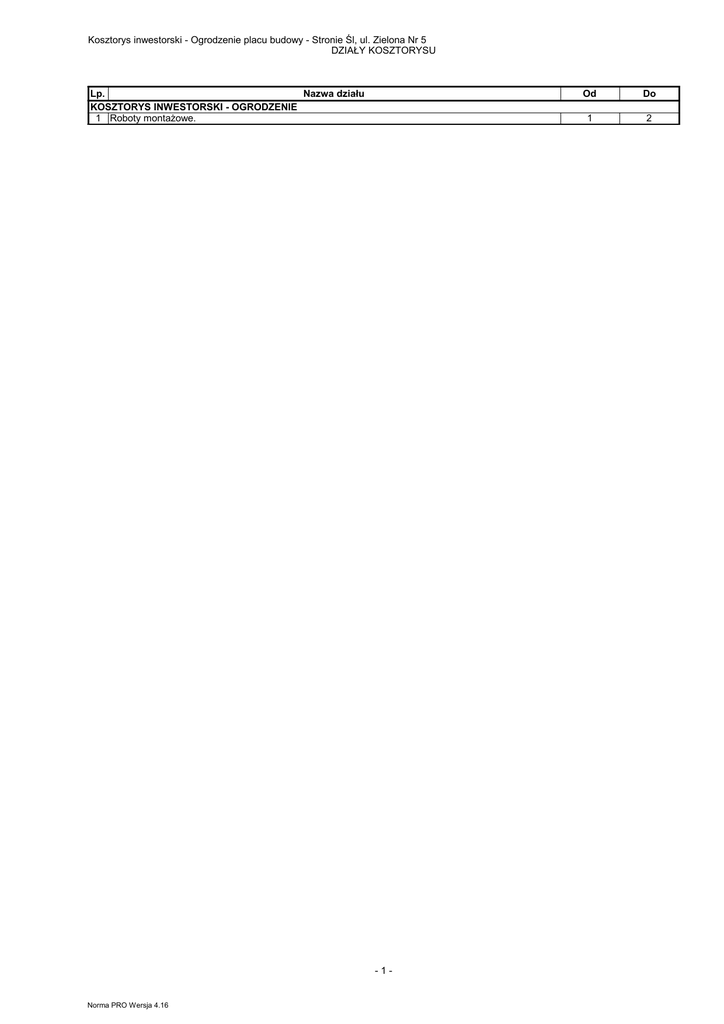 Kosztorys inwestorski - Ogrodzenie placu budowy - Stronie Śl, ul. Zielona Nr 5 DZIAŁY KOSZTORYSU Lp. Nazwa działu KOSZTORYS INWESTORSKI - OGRODZENIE 1 Roboty montażowe. -1- Norma PRO Wersja 4.16 Od Do 1 2 Kosztorys inwestorski - Ogrodzenie placu budowy - Stronie Śl, ul. Zielona Nr 5 KSIĄŻKA PRZEDMIARÓW Lp. Podst Nr spec. Opis i wyliczenia j.m. Poszc techn. z KOSZTORYS INWESTORSKI - OGRODZENIE 1 Roboty montażowe. 1 KNR 2-02 D-04.04.02 Ogrodzenie z siatki ogrodz.ocynk.oczka 50x50mm,fi 2,8mm, o wysokości 2 m na m d.1 1804-12 słupkach stalowych z rur śr. 76 mm o rozstawie 2.1 m obsadzonych w gruncie i obetonowanych analogia 150.00 m 150.00 0 RAZEM 2 KNR 2-02 D-04.04.02 Wrota z furtkami wysokości 2.4 m z blachy w ramach z kątowników; szerokość kpl. d.1 1808-01 wrót 3 m i furtki 1 m na gotowych słupkach. Wykonanie wrót pełnych drewnianych rozw. np. typ DR-263x297cm analogia 1 kpl. 1.000 RAZEM -2- Norma PRO Wersja 4.16 Razem 150.000 1.000