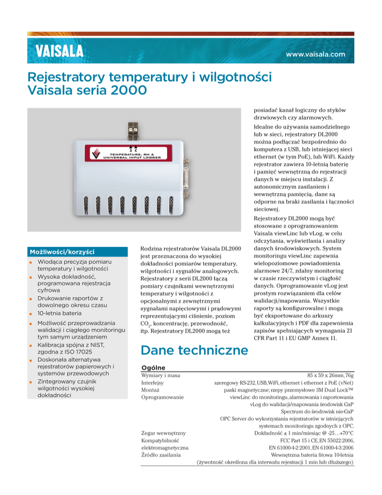 www.vaisala.com Rejestratory temperatury i wilgotności Vaisala seria 2000 posiadać kanał logiczny do styków drzwiowych czy alarmowych. Idealne do używania samodzielnego lub w sieci, rejestratory DL2000 można podłączać bezpośrednio do komputera z USB, lub istniejącej sieci ethernet (w tym PoE), lub WiFi. Każdy rejestrator zawiera 10-letnią baterię i pamięć wewnętrzną do rejestracji danych w miejscu instalacji. Z autonomicznym zasilaniem i wewnętrzną pamięcią, dane są odporne na braki zasilania i łączności sieciowej. Możliwości/korzyści ▪ ▪ ▪ ▪ ▪ ▪ ▪ ▪ Wiodąca precyzja pomiaru temperatury i wilgotności Wysoka dokładność, programowana rejestracja cyfrowa Drukowanie raportów z dowolnego okresu czasu 10-letnia bateria Możliwość przeprowadzania walidacji i ciągłego monitoringu tym samym urządzeniem Kalibracja spójna z NIST, zgodna z ISO 17025 Doskonała alternatywa rejestratorów papierowych i systemów przewodowych Zintegrowany czujnik wilgotności wysokiej dokładności Rodzina rejestratorów Vaisala DL2000 jest przeznaczona do wysokiej dokładności pomiarów temperatury, wilgotności i sygnałów analogowych. Rejestratory z serii DL2000 łączą pomiary czujnikami wewnętrznymi temperatury i wilgotności z opcjonalnymi z zewnętrznymi sygnałami napięciowymi i prądowymi reprezentującymi ciśnienie, poziom CO2, koncentrację, przewodność, itp. Rejestratory DL2000 mogą też Rejestratory DL2000 mogą być stosowane z oprogramowaniem Vaisala viewLinc lub vLog, w celu odczytania, wyświetlania i analizy danych środowiskowych. System monitoringu viewLinc zapewnia wielopoziomowe powiadomienia alarmowe 24/7, zdalny monitoring w czasie rzeczywistym i ciągłość danych. Oprogramowanie vLog jest prostym rozwiązaniem dla celów walidacji/mapowania. Wszystkie raporty są konfigurowalne i mogą być eksportowane do arkuszy kalkulacyjnych i PDF dla zapewnienia zapisów spełniających wymagania 21 CFR Part 11 i EU GMP Annex 11. Dane techniczne Ogólne Wymiary i masa Interfejsy Montaż Oprogramowanie Zegar wewnętrzny Kompatybilność elektromagnetyczna Źródło zasilania 85 x 59 x 26mm, 76g szeregowy RS-232, USB, WiFi, ethernet i ethernet z PoE (vNet) paski magnetyczne; rzepy przemysłowe 3M Dual Lock™ viewLinc do monitoringu, alarmowania i raportowania vLog do walidacji/mapowania środowisk GxP Spectrum do środowisk nie-GxP OPC Server do wykorzystania rejestratorów w istniejących systemach monitoringu zgodnych z OPC. Dokładność ± 1 min/miesiąc @ -25…+70°C FCC Part 15 i CE, EN 55022:2006, EN 61000-4-2:2001, EN 61000-4-3:2006 Wewnętrzna bateria litowa 10-letnia (żywotność określona dla interwału rejestracji 1 min lub dłuższego) Pamięć Pojemność pamięci Typ pamięci Tryby rejestracji Interwał rejestracji Wejścia prądowe i napięciowe 122,197 próbek 12-bitowych Nieulotna EEPROM Ciągły lub nieciągły (stop po zapełnieniu pamięci). Możliwość określenia czasu rozpoczęcia i zakończenia. Do wyboru: od 10 sekund do 24 godzin. Czujniki wewnętrzne TYP WEJŚCIA PRĄDOWE NAPIĘCIOWE Dostępne zakresy 0 do 22 mA Rozdzielczość 5.5 μA Dokładność ±0.15% zakresu w +25°C Impedancja wejściowa 75 Ω4 Izolacja Jedna wspólna masa Przeciążalność max. 40 mA (zabezp. przed odwr. polaryzacją) 0 do 5 VDC, 0 do 10 VDC 0.025% F.S. ±0.15% zakresu w +25°C >1 MΩ Jedna wspólna masa max. ±24 VDC (zabezp. przed odwr. polaryzacją) Konfiguracja kanałów i czas rejestracji WEWNĘTRZNY CZUJNIK TEMPERATURY Kalibrowany zakres pomiarowy1 Zakres roboczy Dokładność początkowa2 TYPY KANAŁÓW -25°C do +70°C MODEL -35°C do +85°C 2000-20R ± 0.10°C powyżej +20°C do +30°C ± 0.15°C powyżej -25°C do +70°C 2000-3CR 2000-35R Dokładność roczna3 Rozdzielczość ± 0.15°C powyżej +20°C do +30°C ± 0.25°C powyżej -25°C do +70°C 0.02°C w +25°C 2000-3AR 2000-4BR WEWNĘTRZNY CZUJNIK WILGOTNOŚCI Kalibrowany zakres pomiarowy1 Zakres roboczy Dokładność początkowa2 Dokładność roczna3 Rozdzielczość 45% RH w +10°C 10% RH do 80% RH w +25°C 45% RH w +45°C 0% RH do 100% RH (bez kondensacji) ± 1% RH powyżej 10% RH do 90% RH w +20°C do +30°C ± 2% RH powyżej 10% RH do 90% RH w -20°C do +70°C ± 2% RH powyżej 10% RH do 90% RH w +20°C do +30° C ± 3% RH powyżej 10% RH do 90% RH w -20°C do +70°C 0.05% RH Kanał 1 Kanał 2 Temperatura Wilgotność względna Temperatura Wilgotność względna Temperatura Wilgotność względna Temperatura Wilgotność względna Temperatura Wilgotność względna Kanał 3 Kanał 4 Prąd 4 do 20 mA Napięcie 0 do 5 VDC Napięcie 0 do 10 VDC Logiczny Logiczny LICZBA WŁĄCZONYCH KANAŁÓW5 INTERWAŁ REJESTR. 10 sekund 1 minuta 5 minuta 15 minuta 1 godzina 1 14.1 dni 2.8 mies. 1.2 lat 3.5 lat 13.9 lat 2 7.1 dni 1.4 mies. 7.1 mies. 1.7 lat 7.0 lat 3 4.7 dni 23.8 dni 4.7 mies. 1.2 lat 4.6 lat 4 3.5 dni 21.2 dni 3.5 mies. 10.6 mies. 3.5 lat Rezystancja wejściowa plus około 0.4 V spadku napięcia na diodzie zabezpieczającej. 5 Kanał temperatury musi być włączony gdy jest używany kanał wilgotności względnej. 4 Na żądanie dostępne własne punkty kalibracji włączając pełne pokrycie ICH. 2 Dokładność początkowa obejmuje wpływy wszystkich znanych wielkości obecnych w trakcie kalibracji w tym niepewność kalibracji, dopasowanie matematyczne, rozdzielczość, histereza i powtarzalność. 3 Dokładność roczna obejmuje wpływy wszystkich znanych wielkości obecnych w trakcie użytkowania rejestratora przez okres jednego roku z uwzględnieniem dokładności początkowej i dryftu długoczasowego. Nie obejmuje dryftów związanych z nietypowym zanieczyszczeniem lub nieprawidłowym używaniem. 1 www.vaisala.com Dystrybucja w Polsce: TEST-THERM Sp. z o.o., ul.Friedleina 4-6, 30-009 Kraków tel.: 12 632 1301, 12 632 6188, http://www.test-therm.pl Ref. B211055EN-B-PL ©Vaisala 2015 Zeskanuj kod aby uzyskać więcej informacji Niniejsza publikacja jest prawn
