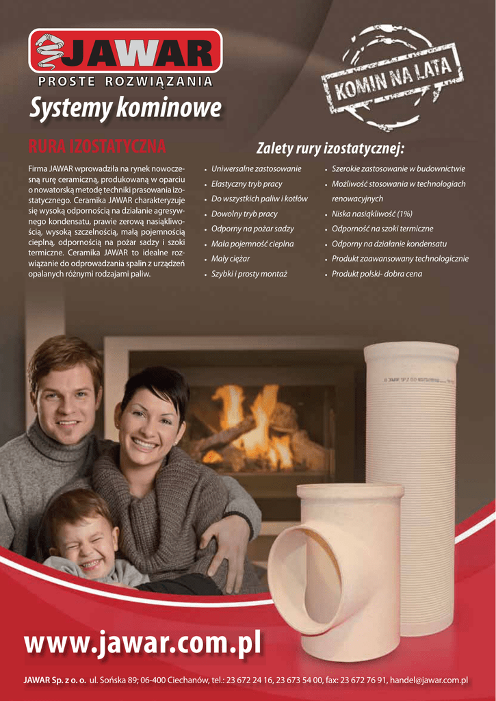Systemy kominowe RURA IZOSTATYCZNA Zalety rury izostatycznej: Firma JAWAR wprowadziła na rynek nowoczesną rurę ceramiczną, produkowaną w oparciu o nowatorską metodę techniki prasowania izostatycznego. Ceramika JAWAR charakteryzuje się wysoką odpornością na działanie agresywnego kondensatu, prawie zerową nasiąkliwością, wysoką szczelnością, małą pojemnością cieplną, odpornością na pożar sadzy i szoki termiczne. Ceramika JAWAR to idealne roz- • Uniwersalne zastosowanie • Szerokie zastosowanie w budownictwie • Elastyczny tryb pracy • Możliwość stosowania w technologiach opalanych różnymi rodzajami paliw. • Do wszystkich paliw i kotłów renowacyjnych • Dowolny tryb pracy • Niska nasiąkliwość (1%) • Odporny na pożar sadzy • Odporność na szoki termiczne • Mała pojemność cieplna • Odporny na działanie kondensatu • Mały ciężar • Produkt zaawansowany technologicznie • Szybki i prosty montaż • Produkt polski- dobra cena www.jawar.com.pl JAWAR Sp. z o. o. ul. Sońska 89; 06-400 Ciechanów, tel.: 23 672 24 16, 23 673 54 00, fax: 23 672 76 91, [email protected] Systemy kominowe Rura wysokość [cm] 33 cm, 66cm zakres średnic 80 120 140 160 180 200 [mm] Trójnik spalin wyczystki wysokość [cm] 33 cm zakres średnic 80 120 140 160 180 200 [mm] Pierwszy taki w Polsce!!! trójnik Funkcjonalność i bezpieczeństwo!!! sze osiągnięcia technologiczne. Unikalna, izostatyczna metoda prasowania sprawia, że spełnia ona wszystkie wymogi bezpieczeństwa w zakresie funkcji i eksploatacji. EN 1457-1 A3N1 D4P1 WA Najlepsze rozwiązanie dla Twojego domu