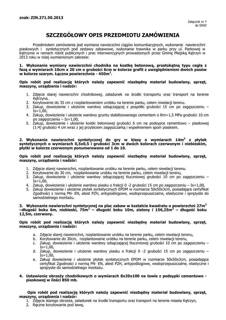 znak: ZIN.271.50.2013 Załącznik nr 7 do SIWZ SZCZEGÓŁOWY OPIS PRZEDMIOTU ZAMÓWIENIA Przedmiotem zamówienia jest wymiana nawierzchni ciągów komunikacyjnych, wykonanie nawierzchni piaskowych i syntetycznych pod zestawy zabawowe, wykonanie trawnika w parku przy ul. Parkowej w Kętrzynie w ramach robót publicznych i prac interwencyjnych prowadzonych przez Gminę Miejską Kętrzyn w 2013 roku w niŜej wymienionym zakresie: 1. Wykonanie wymiany nawierzchni chodnika na kostkę betonową, prostokątną typu cegła z fazą o wymiarach 10cm x 20 cm o grubości 6cm w kolorze grafit z uwzględnieniem dwóch pasów w kolorze szarym. Łączna powierzchnia - 450m2. Opis robót pod realizację których naleŜy zapewnić niezbędny materiał budowlany, sprzęt, maszyny, urządzenia i nadzór: 1. Zdjęcie starej nawierzchni chodnikowej, załadunek na środki transportu oraz transport na terenie Kętrzyna, 2. Korytowanie do 35 cm z rozplantowaniem urobku na terenie parku, celem niwelacji terenu. 3. Zakup, dowiezienie i ułoŜenie warstwy odsączającej z pospółki grubości 15 cm po zagęszczeniu – Is=1,00, 4. Zakup, dowiezienie i ułoŜenie warstwy gruntu stabilizowanego cementem o Rm=1,5 MPa grubości 10 cm po zagęszczeniu – Is=1,00, 5. Zakup, dowiezienie i ułoŜenie kostki betonowej grubości 6 cm na podsypce cementowo – piaskowej (1:4) grubości 4 cm wraz z jej przybiciem zagęszczarką i wypełnieniem spoin piaskiem. 2. Wykonanie nawierzchni syntetycznej do gry w klasy o wymiarach 14m2 z płytek syntetycznych o wymiarach 0,5x0,5 i grubości 3cm w dwóch kolorach czerwonym i niebieskim, płytki w kolorze czerwonym ponumerowane od 1 do 10. Opis robót pod realizację których naleŜy zapewnić niezbędny materiał budowlany, sprzęt, maszyny, urządzenia i nadzór: 1. Zdjęcie starej nawierzchni, rozplantowanie urobku na terenie parku, celem niwelacji terenu. 2. Korytowanie do 30 cm, rozplantowanie urobku na terenie parku, celem niwelacji terenu, 3. Zakup, dowiezienie i ułoŜenie warstwy odsączającej tłuczniowej grubości 10 cm po zagęszczeniu – Is=1,00, 4. Zakup, dowiezienie i ułoŜenie warstwy piasku o frakcji 0 -2 grubości 15 cm po zagęszczeniu – Is=1,00, 5. Zakup dowiezienie i ułoŜenie płytek syntetycznych EPDM w rozmiarze 50x50x3cm, posiadające certyfikat Zgodności z normą PN- EN, atest PZH, antypoślizgowe, wodoprzepuszczalne, elastyczne i spręŜyste do samodzielnego montaŜu. 3. Wykonanie nawierzchni syntetycznej na plac zabaw w kształcie kwadratu o powierzchni 27m2 –długość boku 6m, niebieski, 75m2 – długość boku 10m, zielony i 156,25m2 – długość boku 12,5m, czerwony. Opis robót pod realizację których naleŜy zapewnić niezbędny materiał budowlany, sprzęt, maszyny, urządzenia i nadzór: a. Zdjęcie starej nawierzchni, rozplantowanie urobku na terenie parku, celem niwelacji terenu, b. Korytowanie do 30cm, rozplantowanie urobku na terenie parku, celem niwelacji terenu, c. Zakup, dowiezienie i ułoŜenie warstwy odsączającej tłuczniowej grubości 10 cm po zagęszczeniu – Is=1,00, d. Zakup, dowiezienie i ułoŜenie warstwy piasku o frakcji 0 -2 grubości 15 cm po zagęszczeniu – Is=1,00, e. Zakup dowiezienie i ułoŜenie płytek syntetycznych EPDM w rozmiarze 50x50x3cm, posiadające certyfikat Zgodności z normą PN- EN, atest PZH, antypoślizgowe, wodoprzepuszczalne, elastyczne i spręŜyste do samodzielnego montaŜu. 4. Ustawienie obrzeŜy chodnikowych o wymiarach 8x20x100 na ławie z podsypki cementowo piaskowej w ilości 850 mb. Opis robót pod realizację których naleŜy zapewnić niezbędny materiał budowlany, sprzęt, maszyny, urządzenia i nadzór: 1. Zdjęcie starego obrzeŜa, załadunek na środki transportu oraz transport na terenie miasta Kętrzyn, 2. Ręczne korytowanie pod ławę, 3. Zakup, dowiezienie i ułoŜenie ławy z podsypki cementowo – piaskowej (1:4) grubości 4 cm i szerokości 15 cm, 4. Zakup, dowiezienie i ustawienie obrzeŜa. 5. Wykonanie nawierzchni piaskowej (frakcja 0,2-0,7) o grubości 50cm w kształcie kół w ilości 2 sztuki o promieniu 10m większe i promieniu 7m mniejsze, otoczone obrzeŜami trawnikowymi. Opis robót pod realizację których naleŜy zapewnić niezbędny materiał budowlany, sprzęt, maszyny, urządzenia i nadzór: 1. 2. 3. 4. Wyrównanie starej nawierzchni, , rozplantowanie urobku na terenie parku, celem niwelacji terenu, UłoŜenie agrowłókniny na całej powierzchni nawierzchni piaskowej, Zakup, dowiezienie i ułoŜenie warstwy piaskowej o grubości 50 cm po zagęszczeniu – Is=1,00, Zakup, dowiezienie i ułoŜenie warstwy piasku (frakcja 0,2-0,7) o grubości 50 cm po zagęszczeniu – Is=1,00, 6. Wykonanie nawierzchni trawników o łącznej powierzchni 3 000m2 Opis robót pod realizację których naleŜy zapewnić niezbędny materiał budowlany, sprzęt, maszyny, urządzenia i nadzór: 1. Wyrównanie starej nawierzchni, uprzątnięcie zanieczyszczeń, załadunek na środki transportu zanieczyszczeń oraz transport na terenie Kętrzyna, 2. Zakup, dowiezienie i ułoŜenie warstwy ziemi urodzajnej – humusu, o łącznej powierzchni 3 000m2 o grubości 10cm.