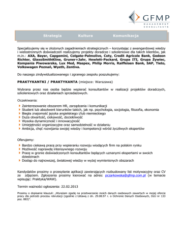 Strategia Kultura Komunikacja Specjalizujemy się w złożonych zagadnieniach strategicznych – korzystając z awangardowej wiedzy i wielostronnych doświadczeń realizujemy projekty doradcze i szkoleniowe dla takich klientów, jak m.in.: AXA, Bayer, Capgemini, Colgate-Palmolive, Coty, Credit Agricole Bank, Gedeon Richter, GlaxoSmithKline, Gruner+Jahr, Hewlett-Packard, Grupa ITI, Grupa Żywiec, Kompania Piwowarska, Lux Med, Maspex, Philip Morris, Raiffeisen Bank, SAP, Tieto, Volkswagen Poznań, Wyeth, Zentiva. Do naszego zindywidualizowanego i zgranego zespołu poszukujemy: PRAKTYKANTKI / PRAKTYKANTA (miejsce: Warszawa) Wybrana przez nas osoba będzie wspierać konsultantów w realizacji projektów doradczych, szkoleniowych oraz działaniach sprzedażowych. Oczekiwania: Zainteresowanie obszarem HR, zarządzania i komunikacji Student lub absolwent kierunków takich, jak np. psychologia, socjologia, filozofia, ekonomia Biegła znajomość języka angielskiego i/lub niemieckiego Duża otwartość, ciekawość, dociekliwość Wysoka dynamiczność i innowacyjność Umiejętności organizacyjne oraz samodzielność w działaniu Ambicja, chęć rozwijania swojej wiedzy i kompetencji wśród życzliwych ekspertów Oferujemy: Bardzo ciekawą pracę przy wspieraniu rozwoju wiodących firm na polskim rynku Możliwość naprawdę intensywnego rozwoju Pracę w gronie doświadczonych konsultantów będących uznanymi ekspertami w swoich dziedzinach Dostęp do najnowszej, światowej wiedzy w wyżej wymienionych obszarach Kandydatów prosimy o przesyłanie aplikacji zawierających rozbudowany list motywacyjny oraz CV ze zdjęciem. Zgłoszenia prosimy kierować na adres: [email protected] (w temacie wpisując: Praktyka/WAW). Termin ważności ogłoszenia: 22.02.2013 Prosimy o dopisanie klauzuli: „Wyrażam zgodę na przetwarzanie moich danych osobowych zawartych w mojej ofercie pracy dla potrzeb procesu rekrutacji (zgodnie z Ustawą z dn. 29.08.97 r. o Ochronie Danych Osobowych, DzU nr 133 poz. 883)”.