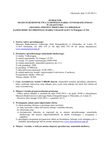 Olsztynek, dnia 11.03.2015 r. DYREKTOR MUZEUM BUDOWNICTWA LUDOWEGO PARKU ETNOGRAFICZNEGO W OLSZTYNKU OGŁOSZA PISEMNY PRZETARG NA SPRZEDAŻ SAMOCHODU SŁUŻBOWEGO MARKI VOLKSWAGEN T4 Furgon 1.9 TD. 1. Nazwa i adres sprzedającego: Muzeum Budownictwa Ludowego Park Etnograficzny w Olsztynku, ul. Leśna 23, 11-015 Olsztynek, tel. (89) 519 21 64, faks (89) 519 38 45, strona internetowa: www.muzeumolsztynek.pl 2. Parametry sprzedawanego samochodu służbowego: 1) marka: Volkswagen, 2) model samochodu: T4, Furgon 1.9 TD 3) wersja: T4, numer rejestracyjny ONH 0768, 4) rodzaj samochodu: samochód ciężarowy do 3.5 t, 5) rok produkcji: 1998, 6) przebieg: 317000 km, 7) data pierwszej rejestracji: 25.08.1999 r., 8) rodzaj nadwozia: kombi (uniwersalne) 4 drzwiowe, 8 osobowe, 9) pojemność silnika: 1896 cm3, 10) moc silnika: 50 kW . 3. Cena wywoławcza: brutto 5 000,00 złotych. Samochód zostanie sprzedany oferentowi, który zaoferuje najwyższą cenę zakupu, przy czym cena zakupu nie może być niższa od ceny wywoławczej. 4. Miejsce i termin przeprowadzenia przetargu. - Oferty należy składać w terminie do dnia 19.03.2015 r. do godz. 10:00 w sekretariacie Muzeum Budownictwa Ludowego Parku Etnograficznego w Olsztynku, ul. Leśna 23. - Otwarcie ofert nastąpi 19.03.2015 r. o godzinie 10.15. 5. Wymagania, jakim musi odpowiadać oferta: 1) oferta pisemna złożona w przetargu musi zawierać: a) imię, nazwisko i adres lub nazwę (firmę) i siedzibę oferenta, b) oferowaną cenę, c) oświadczenie oferenta, że zapoznał się ze stanem sprzedawanego samochodu służbowego lub ponosi odpowiedzialność za skutki wynikające z rezygnacji z oględzin, 2) sprzedający proponuje przygotować ofertę na formularzu, którego wzór dostępny jest w siedzibie sprzedającego lub na stronie internetowej www.muzeumolsztynek.pl, 6. Miejsce i termin, w którym można obejrzeć sprzedawany samochód służbowy. Samochód można oglądać w dniach 11.03.2015 r. – 18.03.2015 r. w godz. od 9:00 do 14:00 w siedzibie sprzedającego – 11-015 Olsztynek, ul. Leśna 23. Wskazane jest wcześniejsze uzgodnienie terminu i godziny przyjazdu pod numerem telefonu (89) 5191230. 7. Wysokość wadium oraz forma, termin i miejsce jego wniesienia: 1) warunkiem przystąpienia do przetargu jest wniesienie wadium w wysokości 500,00 złotych, 2) wadium wnosi się wyłącznie w pieniądzu, 3) wadium złożone przez nabywcę zalicza się na poczet ceny, 4) wadium nie podlega zwrotowi w przypadku, gdy oferent, który wygrał przetarg, uchyli się od zawarcia umowy sprzedaży, 5) wadium należy wpłacić w kasie sprzedającego lub na rachunek bankowy 23 8823 0007 2001 0000 0491 000 1 w terminie do dnia 19.03.2015 r. do godz. 10:00. 8. Termin, miejsce i tryb złożenia oferty oraz okres, w którym oferta jest wiążąca: 1) oferty należy składać w terminie do dnia 19.03.2015 r. do godz. 10:00 w sekretariacie Muzeum Budownictwa Ludowego Parku Etnograficznego w Olsztynku, ul. Leśna 23, 2) wypełnioną i podpisaną ofertę należy złożyć w zamkniętej kopercie z dopiskiem „Oferta na kupno samochodu”, 3) termin związania ofertą – 14 dni. 9. Sprzedającemu przysługuje prawo zamknięcia przetargu bez wybrania którejkolwiek z ofert, bez podania przyczyn. 10. Oferta będzie podlegała odrzuceniu, jeżeli: 1) zostanie złożona po wyznaczonym terminie, w niewłaściwym miejscu lub przez oferenta, który nie wniósł wadium, 2) zawiera dane niekompletne, nieczytelne lub nie zawiera podpisu. 11. Termin zawarcia umowy sprzedaży: w ciągu 7 dni licząc od upływu terminu składania ofert.