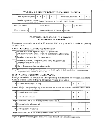 WYBORY DO SENATU RZECZYPOSPOLITEJPOLSKIEJ Kod terylorialny gmin) 6 0 Nr obwodu glosowania SiedzibaOb$odowej Komisii wlborczeJ (adret S z k o l aP o d s i a s o w aw D r € l o w i e , 2 l - 5 7 0D r c l o w G m i n a gm. Drel6w bial!ki OkragUborcTy nr 1 woj. lubelskie Okrego$a Komisja W)borcza w C h e l m i e PROTOKOT,GLOSOWANIA W OBWODZIE na kandydat6r nn senator6w Glosowanierozpoczglosiq u, dniu 25 .r'rzeSnia 2005 r. o godz.6:00 i trwalo bez przerwy do godz.20r00. I. ROZLICZENIE K,ART DO GLOSOWANIA I l-rczbawyborco uprawoionychdo gloso\&anta (umieszczonych spisic)u chwili zakoiczcnia gloso\\.ania 4 l 2 9 3 l 0 2 3 . (liczbapodpisir* I 7 9 o 4 . Nie \\,lkorzvstano kart Jo Slosorranic I 5 0 6 2 . Korlisja otrzvmala ka do glosou,ania Lrczba $)borcow, kt6rym \rydano kift,v do glosowania rv spisic) Uwaga!Suma liczbz pkt.L i4. powinnabyafolrnaliczbiez pkr.2.rje(lirak niejest przlpuszczatr4 przyczynq nalezyomowii w ptrDkcieI I. II. USTALENIEWYNIK6W GI,OSOWANIA Komisjastwierdzila.2epicczqciena urniepozostalynienaruszone. Po w aciu kart z umy Komisja stalilana ich podsta\\ienast9puiqcc *yniki gloso\\,ania: 5 . Liczbc kltn \\1jqt)ch z urn) 7 9 I Uwaga! L-iczba z pkt 5. posinnabyi rdwnaliczbiczpkt. Ltje(lilakniejest przypuszczatn4 przyczJne Dalezy om6wiaw punkcicll. 6 . Liczba kan nicwaTn)'ch 7 . Liczba kan \"-a2nvch 7 9 I 7 2 Uwaga!Sunra liczbz pkl 6. i7. musibyarownaliczbiez pkt.5. 8 .Liczbaglos6rvniewa2n)'ch 9 . Liczba glos6rv *'irznych ,] Urvaga!SLrma liczbz pkt lJ.i9. musib)a r6wnaliczbiezpkt.T. Miejscena pamforvanie slron) przezczlonko\yKomisji obecnych przy sporz4dzeniu proiokol.r 10. Poszczcg6lni kandydaciotrzymali nast€puj4celiczby glos6n waznych: BIEI.A Adam 2 CHROSCIKOWSKIJerzl Mieczlslaw 2 6 6 I 8 2 8 8 0 6 3 KAPLAN Kczimierz 4 KARASINSKI StcfanJan I 5 KIRYLUK Michal ) 6 KIJRZQPA lrena 6 8 3 I 1 M A K A R E\ \ ' l ( ' 1 t l c n D k 2 3 8 MISZ I Al, Stanislarv 3 6 MOCII A-l ISOWSKI Z)gmunt I eop0ld 0 I 1 0MUZYCZKA Ddnuta t1 OWSINSKI Andrzej I 1 2PlFl'l-RONI.ucyna ,1 3 8 0 4 2 l 3 PODKANSKI Lesla$ Pa$el 6 2 I l 4 POZNANSKIZcnonAndrzej 4 .l 0 9 3 l 5 RAPA Stanislan t 6 SCIt0DZINSKIStanislaw l 6 l t 7 SENDECKAMaria I 8 2 1 8TYWONIUK Marian I 5 2 l 9 ZWIEM LeszekEdrvard Razen1 3 6 2 0 glosowoddanychna lvszystkichkandldat6w(rubryka..Razem")nic mozcbya wiQkszaod Uwaga!Suma przezliczbFsenalor6wwybieranlchw okreguwyborczym.Sumata nie liczb) z pk!. 9. po'nnozone.j przezkt6regokohviek mozeb]a mniejszaod liczbyz pkt. 9. Liczbaglos6wuzyskanych z kandydaiow nie mozebva wiekszaniz liczbaz Dkt -. pra- sporz4dzeniu protokolu Miejscena parafo$aniestronyprzezczlonk6wKomisji obecnych