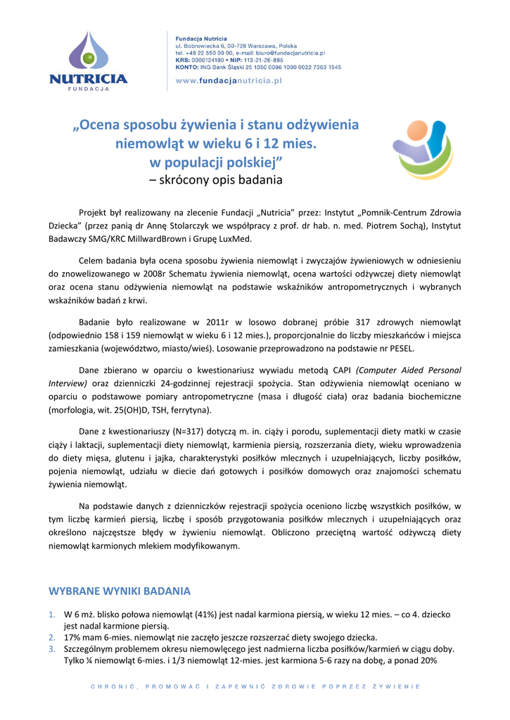 „Ocena sposobu żywienia i stanu odżywienia niemowląt w wieku 6 i 12 mies. w populacji polskiej” – skrócony opis badania Projekt był realizowany na zlecenie Fundacji „Nutricia” przez: Instytut „Pomnik-Centrum Zdrowia Dziecka” (przez panią dr Annę Stolarczyk we współpracy z prof. dr hab. n. med. Piotrem Sochą), Instytut Badawczy SMG/KRC MillwardBrown i Grupę LuxMed. Celem badania była ocena sposobu żywienia niemowląt i zwyczajów żywieniowych w odniesieniu do znowelizowanego w 2008r Schematu żywienia niemowląt, ocena wartości odżywczej diety niemowląt oraz ocena stanu odżywienia niemowląt na podstawie wskaźników antropometrycznych i wybranych wskaźników badań z krwi. Badanie było realizowane w 2011r w losowo dobranej próbie 317 zdrowych niemowląt (odpowiednio 158 i 159 niemowląt w wieku 6 i 12 mies.), proporcjonalnie do liczby mieszkańców i miejsca zamieszkania (województwo, miasto/wieś). Losowanie przeprowadzono na podstawie nr PESEL. Dane zbierano w oparciu o kwestionariusz wywiadu metodą CAPI (Computer Aided Personal Interview) oraz dzienniczki 24-godzinnej rejestracji spożycia. Stan odżywienia niemowląt oceniano w oparciu o podstawowe pomiary antropometryczne (masa i długość ciała) oraz badania biochemiczne (morfologia, wit. 25(OH)D, TSH, ferrytyna). Dane z kwestionariuszy (N=317) dotyczą m. in. ciąży i porodu, suplementacji diety matki w czasie ciąży i laktacji, suplementacji diety niemowląt, karmienia piersią, rozszerzania diety, wieku wprowadzenia do diety mięsa, glutenu i jajka, charakterystyki posiłków mlecznych i uzupełniających, liczby posiłków, pojenia niemowląt, udziału w diecie dań gotowych i posiłków domowych oraz znajomości schematu żywienia niemowląt. Na podstawie danych z dzienniczków rejestracji spożycia oceniono liczbę wszystkich posiłków, w tym liczbę karmień piersią, liczbę i sposób przygotowania posiłków mlecznych i uzupełniających oraz określono najczęstsze błędy w żywieniu niemowląt. Obliczono przeciętną wartość odżywczą diety niemowląt karmionych mlekiem modyfikowanym. WYBRANE WYNIKI BADANIA 1. W 6 mż. blisko połowa niemowląt (41%) jest nadal karmiona piersią, w wieku 12 mies. – co 4. dziecko jest nadal karmione piersią. 2. 17% mam 6-mies. niemowląt nie zaczęło jeszcze rozszerzać diety swojego dziecka. 3. Szczególnym problemem okresu niemowlęcego jest nadmierna liczba posiłków/karmień w ciągu doby. Tylko ¼ niemowląt 6-mies. i 1/3 niemowląt 12-mies. jest karmiona 5-6 razy na dobę, a ponad 20% 4. 5. 6. 7. 8. 9. 10. 11. 12. niemowląt zarówno 6 mies. jak i 12 mies. je posiłki 10 i więcej razy na dobę, nie licząc drobnych przekąsek. Około 1/5 matek przygotowuje mleko modyfikowane niezgodnie z zaleceniami producenta odnośnie proporcji wody i mleka w proszku Gluten w diecie niemowląt 6-mies. wprowadziło blisko 60% mam, mimo zalecenia, by wprowadzać gluten przed ukończeniem pierwszego półrocza. Nadal nie wszystkie niemowlęta są suplementowane witaminą D, przy czym suplementacja stosowana jest w bardzo zróżnicowanych dawkach (10-70 mcg/dobę), Wykazano wysoką częstość występowania niedoborów witaminy D u niemowląt, przy czym częstość niedoborów była wyższa w grupie niemowląt 12-mies., niż 6-mies. Niemowlęta karmione wyłącznie mlekiem krowim miały stężenie ferrytyny i HgB poniżej normy. U niemowląt 12-mies. karmionych prawie wyłącznie piersią zaobserwowano obniżone stężenie ferrytyny. U dzieci 6-mies. nie obserwuje się istotnego ryzyka niedoboru: energii, białka, węglowodanów, sodu, potasu, wapnia, fosforu, magnezu, witaminy A, witaminy E, kwasu foliowego oraz witaminy C, natomiast u dzieci 12-mies. nie obserwuje się istotnego ryzyka niedoboru: energii, białka, węglowodanów, potasu, wapnia, fosforu, witaminy A, witaminy E, kwasu foliowego oraz witaminy C. Spożycie białka w ilościach większych od zapotrzebowania stwierdzono u 93% dzieci 6-mies. i 12-mies. Obecnie dostępne Normy Żywienia dla niemowląt nie pozwalają na określenie nadmiernego spożycia określonych składników odżywczych. WNIOSKI 1. Szczególnym problemem okresu niemowlęcego jest nadmierna liczba posiłków/karmień w ciągu doby. 2. Należy zwrócić uwagę na sposób przygotowania mleka modyfikowanego, gdyż nie zawsze rodzice postępują zgodnie z zaleceniem producenta. 3. Nadal funkcjonują dawne przyzwyczajenia późnego wprowadzania glutenu do diety. 4. Istotnym problemem trwającym od wielu lat jest nieodpowiednia suplementacja witaminy D, przy czym częstość suplementacji obniża się wraz z wiekiem niemowlęcia i stosowane są różne dawki, często odbiegające od rekomendacji. Badania biochemiczne wskazują na wysoką częstość niedoboru witaminy D u niemowląt. 5. Niedokrwistość nie jest częstym problemem i wiąże się głównie z dużymi błędami żywieniowymi jak np. karmienie wyłącznie mlekiem krowim lub karmienie prawie wyłącznie piersią. 6. Pokrycie normy zapotrzebowania na energię oraz na makroskładniki odżywcze zasadniczo jest zadowalające. 7. Należy zwrócić uwagę na spożywanie posiłków stołu rodzinnego już przez niemowlęta, co przy nieprawidłowej diecie rodziców może kształtować złe zwyczaje żywieniowe ich dzieci.