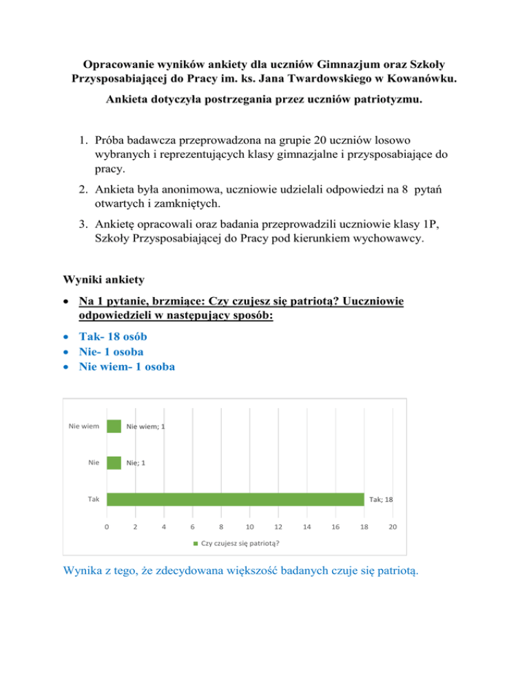 Opracowanie wyników ankiety dla uczniów Gimnazjum oraz Szkoły Przysposabiającej do Pracy im. ks. Jana Twardowskiego w Kowanówku. Ankieta dotyczyła postrzegania przez uczniów patriotyzmu. 1. Próba badawcza przeprowadzona na grupie 20 uczniów losowo wybranych i reprezentujących klasy gimnazjalne i przysposabiające do pracy. 2. Ankieta była anonimowa, uczniowie udzielali odpowiedzi na 8 pytań otwartych i zamkniętych. 3. Ankietę opracowali oraz badania przeprowadzili uczniowie klasy 1P, Szkoły Przysposabiającej do Pracy pod kierunkiem wychowawcy. Wyniki ankiety Na 1 pytanie, brzmiące: Czy czujesz się patriotą? Uuczniowie odpowiedzieli w następujący sposób: Tak- 18 osób Nie- 1 osoba Nie wiem- 1 osoba Nie wiem Nie wiem; 1 Nie Nie; 1 Tak Tak; 18 0 2 4 6 8 10 12 14 16 18 20 Czy czujesz się patriotą? Wynika z tego, że zdecydowana większość badanych czuje się patriotą. Pytanie 2 brzmiało: Czym jest dla Ciebie patriotyzm? Ankietowani odpowiedzieli w następujący sposób: Czym jest dla Ciebie patriotyzm? KIBICOWANIE POLSKIM DRUŻYNOM SPORTOWYM 6 UCZESTNICZENIE W UROCZYSTOŚCIACH UPAMIĘTNIACJĄCYCH WAŻNE WYDARZENIA HISTORYCZNE KRAJU 7 WYWIESZANIE FLAGI PAŃSTWOWEJ W OKRESIE ŚWIĄT NARODOWYCH 9 OBCHODZNIE NARODOWYCH ŚWIĄT 10 DBANIE O JĘZYK POLSKI I JEGO POPRAWNOŚĆ 7 SZANOWANIE SWOJEJ NARODOWOŚCI 6 PROPAGOWANIE I PROMOWANIE POLSKI POZA GRANICAMI KRAJU 6 DBANIE O SWOJĄ OKOLICE 6 0 2 4 6 8 10 12 Na podstawie uzyskanych odpowiedzi możemy stwierdzić, że patriotyzm dla badanych uczniów objawia się przede wszystkim poprzez: Obchodzenie narodowych świąt Wywieszanie flagi państwowej w okresie świąt narodowych Uczestniczenie w uroczystościach upamiętniających ważne wydarzenia historyczne Dbanie o język polski i jego poprawność Kibicowanie polskim drużynom sportowym Szanowanie swojej narodowości Propagowanie i promowanie Polski poza granicami kraju Dbanie o swoją okolicę Pytanie 3 brzmiało: Czy działasz na korzyść swojego otoczenia/ społeczeństwa? Ankietowani udzielili następujących odpowiedzi: Czy działasz na korzyść swojego otoczenia/ społeczeństwa? Tylko czasami Tylko czasami; 10 Nie Nie; 2 Tak Tak; 8 0 2 4 6 8 10 12 Na podstawie tych odpowiedzi, należy stwierdzić, że połowa ankietowanych tj. 10 uczniów, udziela się na rzecz społeczeństwa tylko czasami, 8 uczniów stanowo potwierdza taką działalność, natomiast 2 uczniów nigdy się nie udzielało społecznie. W pytaniu 4 należało wymienić znane nam polskie święta patriotyczne. Najczęściej podawanym świętem były: Odzyskanie przez Polskę Niepodległości-11 Listopada( 15 osób) 1 Maja –( 10 osób) 3 Maja –( 8 osób) 2 Maja - ( 5 osób) 9 Maja – ( 3 osoby) Jakie znasz święta marodowe o charakterze patriotycznym? 9 Maja 3 2 Maja 5 3 Maja 8 1 Maja 10 11 Listopada 15 0 2 4 6 8 10 12 14 16 Pytanie piąte brzmiało następująco: Czy jesteś dumny z bycia Polakiem? Ankietowani mieli do wyboru 3 opcje, a odpowiedzi na nie w następujący sposób: CZY JESTEŚ DUMNY Z BYCIA POLAKIEM? NIE WIEM NIE WIEM ; 6 NIE NIE; 7 TAK TAK; 15 0 2 4 6 8 10 12 14 16 Z powyższego wykresu jasno wynika, że ponad połowa badanych jest dumnych z bycia Polakami. Natomiast zaskakująco duża ilość ankietowanych odpowiedziała przecząco lub nie wskazała jasnej odpowiedzi. O to czy ankietowani znają słowa hymnu zapytaliśmy w pytaniu 6. Nasi ankietowani odpowiedzieli w następujący sposób: Czy znasz słowa hymnu państwowego? NIE TAK 0 2 4 6 8 10 12 14 16 18 20 Jak przedstawiają wyniki zamieszone na wykresie, twierdząco odpowiedziało 18 osób, natomiast 2 osoby nie znają słów hymny państwowego. W pytaniu 7 zapytano ankietowanych o to, czy kibicują polskim sportowcom podczas Olimpiad, Mistrzostw Europy, Mistrzostw Świata itd. Czy kibicujesz polskim sportowcom podczas Olimpiad, Mistrzostw Europy, Mistrzostw Świata itp. CZASAMI NIE TAK 0 2 4 6 8 10 12 14 16 18 Jak wynika z danych diagramu, aż 16 osób kibicuje polski sportowcom, podczas ważnych zawodów sportowych, tylko 1 osoba nie kibicuje w ogóle, natomiast 3 badane osoby zadeklarowały , że kibicują czasami. Ostatnie 8 pytanie, brzmiało: Czy w wypadku zagrożenia ojczyzny stanęłabyś/stanąłbyś w jej obronie? Czy w wypadku zagrożenia ojczyzny stanęłabyś/ stanąłbyś w jej obornie? NIE WIEM NIE TAK 0 2 4 6 8 10 12 14 16 18 Naszych 16 ankietowanych na ostatnie pytanie odpowiedziało twierdząco, 3 uczniów nie zna odpowiedzi na to pytanie, a tylko 1 badana osoba nie stanęłaby w obronie ojczyzny. Wnioski z przeprowadzonych badań ankietowych dotyczących patriotyzmu. Na podstawie wyników przeprowadzonej ankiety, wśród uczniów Gimnazjum im. ks. Jana Twardowskiego w Kowanówku, jednoznacznie można stwierdzić, że Ci uczniowie czują się patriotami i wykazują cechy, które potwierdzają to stwierdzenie. Uczniowie wskazali wiele przykładów postaw patriotycznych. Znacząca większość ankietowanych deklaruje, że udziela się na rzecz swojego środowiska lokalnego oraz społeczeństwa, co wskazywać może na fakt, że czują się oni do niego przywiązani. Uczniowie znają święta patriotyczne, obchodzone w naszym kraju, znają ich daty o raz właściwe nazwy, co świadczyć może o tym, że obchodzą te święta. Nasi ankietowani w przeważającej większości czują się Polakami, co świadczyć może o tym, że są również patriotami. Prawie wszyscy uczniowie znają hymn państwowy. Bardzo dużo ankietowanych wyraża swój patriotyzm poprzez kibicowanie polskim sportowcom podczas ich występów na Olimpiadach, Mistrzostwach Europy, Mistrzostwach Świata i innych. Zaskakująca większość zdeklarowała, że w obliczu zagrożenia Ojczyzny stanęłaby w jej obronie. Zastanawiającym jest fakt, że aż 7 uczniów nie jest dumnym z bycia Polakiem. Te wszystkie odpowiedzi świadczą o tym, że uczniowie naszego gimnazjum wykazują cechy prawdziwych patriotów, wiedzą czym patriotyzm się objawia.