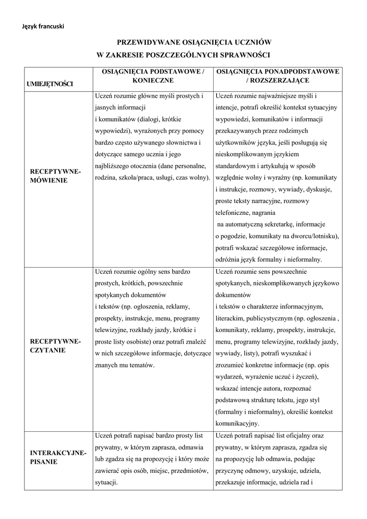 Język francuski PRZEWIDYWANE OSIĄGNIĘCIA UCZNIÓW W ZAKRESIE POSZCZEGÓLNYCH SPRAWNOŚCI UMIEJĘTNOŚCI RECEPTYWNEMÓWIENIE OSIĄGNIĘCIA PODSTAWOWE / KONIECZNE OSIĄGNIĘCIA PONADPODSTAWOWE / ROZSZERZAJĄCE Uczeń rozumie główne myśli prostych i Uczeń rozumie najważniejsze myśli i jasnych informacji intencje, potrafi określić kontekst sytuacyjny i komunikatów (dialogi, krótkie wypowiedzi, komunikatów i informacji wypowiedzi), wyrażonych przy pomocy przekazywanych przez rodzimych bardzo często używanego słownictwa i użytkowników języka, jeśli posługują się dotyczące samego ucznia i jego nieskomplikowanym językiem najbliższego otoczenia (dane personalne, standardowym i artykułują w sposób rodzina, szkoła/praca, usługi, czas wolny). względnie wolny i wyraźny (np. komunikaty i instrukcje, rozmowy, wywiady, dyskusje, proste teksty narracyjne, rozmowy telefoniczne, nagrania na automatyczną sekretarkę, informacje o pogodzie, komunikaty na dworcu/lotnisku), potrafi wskazać szczegółowe informacje, odróżnia język formalny i nieformalny. RECEPTYWNECZYTANIE Uczeń rozumie ogólny sens bardzo Uczeń rozumie sens powszechnie prostych, krótkich, powszechnie spotykanych, nieskomplikowanych językowo spotykanych dokumentów dokumentów i tekstów (np. ogłoszenia, reklamy, i tekstów o charakterze informacyjnym, prospekty, instrukcje, menu, programy literackim, publicystycznym (np. ogłoszenia , telewizyjne, rozkłady jazdy, krótkie i komunikaty, reklamy, prospekty, instrukcje, proste listy osobiste) oraz potrafi znaleźć menu, programy telewizyjne, rozkłady jazdy, w nich szczegółowe informacje, dotyczące wywiady, listy), potrafi wyszukać i znanych mu tematów. zrozumieć konkretne informacje (np. opis wydarzeń, wyrażenie uczuć i życzeń), wskazać intencje autora, rozpoznać podstawową strukturę tekstu, jego styl (formalny i nieformalny), określić kontekst komunikacyjny. INTERAKCYJNEPISANIE Uczeń potrafi napisać bardzo prosty list Uczeń potrafi napisać list oficjalny oraz prywatny, w którym zaprasza, odmawia prywatny, w którym zaprasza, zgadza się lub zgadza się na propozycję i który może na propozycję lub odmawia, podając zawierać opis osób, miejsc, przedmiotów, przyczynę odmowy, uzyskuje, udziela, sytuacji. przekazuje informacje, udziela rad i wskazówek, opisuje osoby, miejsca, przedmioty, sytuacje, wydarzenia, zachowując chronologię oraz opisuje swoje doświadczenia, uczucia, wrażenia, opinie i ich uzasadnienie. Uczeń potrafi formułować krótkie Uczeń potrafi formułować spójne, proste, wypowiedzi, aby opisać prostymi słowami krótkie wypowiedzi, aby opowiedzieć o siebie, swoją sytuację wydarzeniach (autentycznych lub i najbliższe otoczenie. fikcyjnych), swoich doświadczeniach, planach i celach, krótko przedstawić PRODUKTYWNEMÓWIENIE argumenty i wyjaśnienia swoich opinii lub projektów, opisać osobę, przedmiot, miejsce, opowiedzieć historię lub wątek książki, filmu i wyrazić swoje intencje, reakcje i odczucia. PRODUKTYWNEPISANIE MEDIACYJNEMÓWIENIE MEDIACYJNEPISANIE Uczeń potrafi wypełniać formularze oraz pisać proste i krótkie komunikaty (e-mail, życzenia, pozdrowienia) o stopniu poprawności gwarantującej komunikatywność. Uczeń potrafi przekazywać proste informacje od osób trzecich. Uczeń potrafi robić notatki, napisać krótki tekst użytkowy (np. notatka, pocztówka, ogłoszenie, komunikat, curriculum vitae, podanie), stosując struktury morfosyntaktyczne, zasady ortografii oraz słownictwo typowe dla danej formy wypowiedzi z zachowaniem podanego limitu słów. Uczeń potrafi relacjonować wiadomości i wypowiedzi innych osób, przekazywać, przetwarzać teksty w języku polskim i francuskim oraz treści materiałów ikonograficznych np. zdjęć, ilustracji. Uczeń potrafi zanotować proste Uczeń potrafi zrelacjonować, przekazać treść informacje otrzymane od osób trzecich i je tekstu w języku polskim i francuskim, przekazać. napisać streszczenie prostego tekstu.