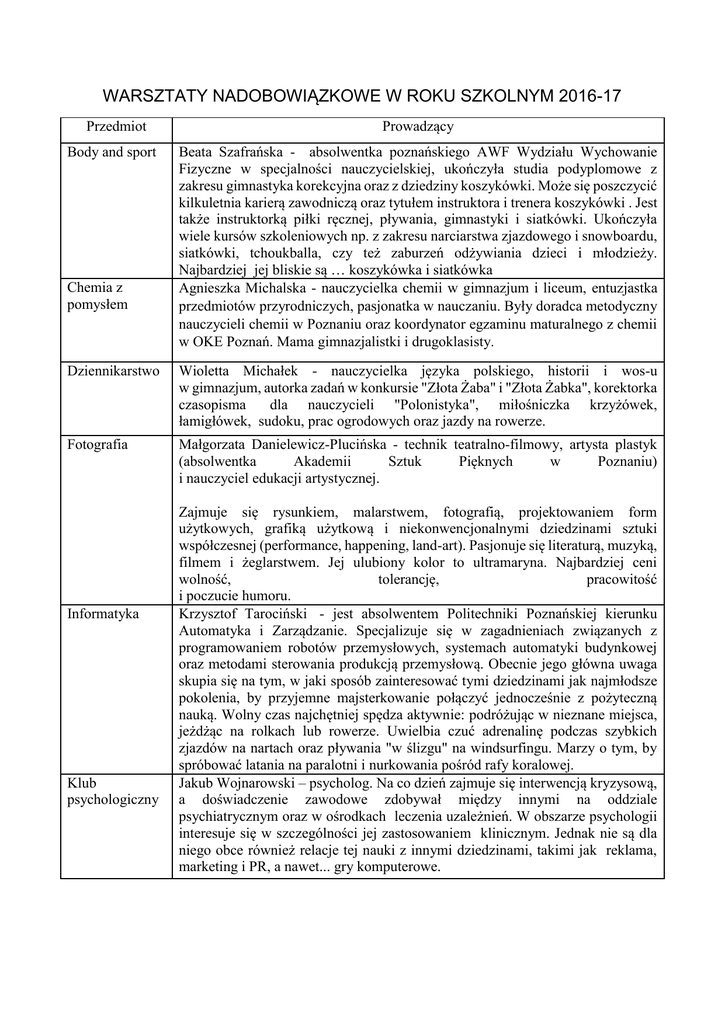 WARSZTATY NADOBOWIĄZKOWE W ROKU SZKOLNYM 2016-17 Przedmiot Body and sport Chemia z pomysłem Prowadzący Beata Szafrańska - absolwentka poznańskiego AWF Wydziału Wychowanie Fizyczne w specjalności nauczycielskiej, ukończyła studia podyplomowe z zakresu gimnastyka korekcyjna oraz z dziedziny koszykówki. Może się poszczycić kilkuletnia karierą zawodniczą oraz tytułem instruktora i trenera koszykówki . Jest także instruktorką piłki ręcznej, pływania, gimnastyki i siatkówki. Ukończyła wiele kursów szkoleniowych np. z zakresu narciarstwa zjazdowego i snowboardu, siatkówki, tchoukballa, czy też zaburzeń odżywiania dzieci i młodzieży. Najbardziej jej bliskie są … koszykówka i siatkówka Agnieszka Michalska - nauczycielka chemii w gimnazjum i liceum, entuzjastka przedmiotów przyrodniczych, pasjonatka w nauczaniu. Były doradca metodyczny nauczycieli chemii w Poznaniu oraz koordynator egzaminu maturalnego z chemii w OKE Poznań. Mama gimnazjalistki i drugoklasisty. Dziennikarstwo Wioletta Michałek - nauczycielka języka polskiego, historii i wos-u w gimnazjum, autorka zadań w konkursie "Złota Żaba" i "Złota Żabka", korektorka czasopisma dla nauczycieli "Polonistyka", miłośniczka krzyżówek, łamigłówek, sudoku, prac ogrodowych oraz jazdy na rowerze. Fotografia Małgorzata Danielewicz-Plucińska - technik teatralno-filmowy, artysta plastyk (absolwentka Akademii Sztuk Pięknych w Poznaniu) i nauczyciel edukacji artystycznej. Informatyka Klub psychologiczny Zajmuje się rysunkiem, malarstwem, fotografią, projektowaniem form użytkowych, grafiką użytkową i niekonwencjonalnymi dziedzinami sztuki współczesnej (performance, happening, land-art). Pasjonuje się literaturą, muzyką, filmem i żeglarstwem. Jej ulubiony kolor to ultramaryna. Najbardziej ceni wolność, tolerancję, pracowitość i poczucie humoru. Krzysztof Tarociński - jest absolwentem Politechniki Poznańskiej kierunku Automatyka i Zarządzanie. Specjalizuje się w zagadnieniach związanych z programowaniem robotów przemysłowych, systemach automatyki budynkowej oraz metodami sterowania produkcją przemysłową. Obecnie jego główna uwaga skupia się na tym, w jaki sposób zainteresować tymi dziedzinami jak najmłodsze pokolenia, by przyjemne majsterkowanie połączyć jednocześnie z pożyteczną nauką. Wolny czas najchętniej spędza aktywnie: podróżując w nieznane miejsca, jeżdżąc na rolkach lub rowerze. Uwielbia czuć adrenalinę podczas szybkich zjazdów na nartach oraz pływania "w ślizgu" na windsurfingu. Marzy o tym, by spróbować latania na paralotni i nurkowania pośród rafy koralowej. Jakub Wojnarowski – psycholog. Na co dzień zajmuje się interwencją kryzysową, a doświadczenie zawodowe zdobywał między innymi na oddziale psychiatrycznym oraz w ośrodkach leczenia uzależnień. W obszarze psychologii interesuje się w szczególności jej zastosowaniem klinicznym. Jednak nie są dla niego obce również relacje tej nauki z innymi dziedzinami, takimi jak reklama, marketing i PR, a nawet... gry komputerowe. Koszykówka Łukasz Olkiewicz – pilot, fascynat szybownictwa i koszykówki, posiadający certyfikaty trenerskie squasha, badmintona, a niedługo trenera fitness. Dynamiczny, wymagający, lubiący wyzwania - obiecuje, że da Wam w kość. Piłka halowa Magdalena Reszelska – nauczycielka wychowania fizycznego, pasjonatka swojego zawodu. Sport i aktywność fizyczna zawsze odgrywały w jej życiu ważną rolę. W relacji z uczniami bardzo ceni sobie dyscyplinę, solidność i rzetelność. Lubi wyzwania - a takim jest bycie trenerką męskiej drużyny piłki halowej. Piłka siatkowa Beata Szafrańska absolwentka poznańskiego AWF Wydziału Wychowanie Fizyczne w specjalności nauczycielskiej, ukończyła studia podyplomowe z zakresu gimnastyka korekcyjna oraz z dziedziny koszykówki. Może się poszczycić kilkuletnia karierą zawodniczą oraz tytułem instruktora i trenera koszykówki . Jest także instruktorką piłki ręcznej, pływania, gimnastyki i siatkówki. Ukończyła wiele kursów szkoleniowych np. z zakresu narciarstwa zjazdowego i snowboardu, siatkówki, tchoukballa, czy też zaburzeń odżywiania dzieci i młodzieży. Najbardziej jej bliskie są … koszykówka i siatkówka. Tomasz Skrzypczak – biotechnolog, doktorant w Zakładzie Biologii Molekularnej i Komórkowej UAM, absolwent kierunku biotechnologia na Wydziale Biologii UAM, współautor trzech publikacji naukowych oraz rozprawy doktorskiej zatytułowanej: „Genomika funkcjonalna podjednostek kompleksu gamma-sekretazy Arabidopsis thaliana”. Od 2007 roku aktywny uczestnik badań naukowych dotyczących biologii molekularnej. W 2009 odbył staż naukowy w CEA Cadarache we Francji. W latach 2014 – 2015 kierownik projektu finansowanego przez Narodowe Centrum Nauki. Zainteresowaniami znacznie wykracza poza dziedziny z obrębu science; docenia dobre książki, dziką przyrodę i piękne bramki. Podstawy biomedycyny Na zajęcia zaprasza przede wszystkim osoby myślące o zdawaniu biologii. Religia Religia islamu Robotyka Rysunek matury z o. Andrzej Drozd - duszpasterz Duszpasterstwa Młodzieży Schron, dyrektor Dominikańskiego Ośrodka Informacji o Sektach i Nowych Ruchach Religijnych, absolwent teologii Uniwersytetu Papieskiego Jana Pawła II w Krakowie Youssef Chadid - imam wielkopolski, ukończył prawo szari'a ( prawo islamskie) we Francji, absolwent arabistyki na UAM . Krzysztof Tarociński - jest absolwentem Politechniki Poznańskiej kierunku Automatyka i Zarządzanie. Specjalizuje się w zagadnieniach związanych z programowaniem robotów przemysłowych, systemach automatyki budynkowej oraz metodami sterowania produkcją przemysłową. Obecnie jego główna uwaga skupia się na tym, w jaki sposób zainteresować tymi dziedzinami jak najmłodsze pokolenia, by przyjemne majsterkowanie połączyć jednocześnie z pożyteczną nauką. Małgorzata Danielewicz-Plucińska - technik teatr