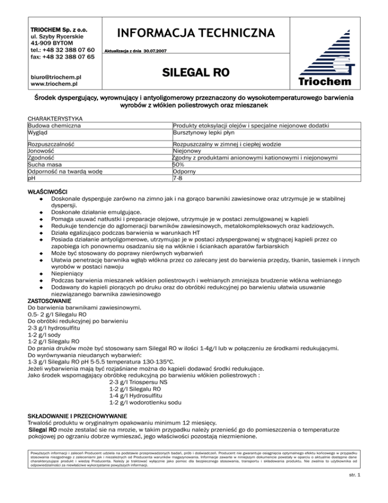 TRIOCHEM Sp. z o.o. ul. Szyby Rycerskie 41-909 BYTOM tel.: +48 32 388 07 60 fax: +48 32 388 07 65 [email protected] www.triochem.pl INFORMACJA TECHNICZNA Aktualizacja z dnia 30.07.2007 SILEGAL RO Triochem Środek dyspergujący, wyrownujący i antyoligomerowy przeznaczony do wysokotemperaturowego barwienia wyrobów z włókien poliestrowych oraz mieszanek CHARAKTERYSTYKA Budowa chemiczna Wygląd Produkty etoksylacji olejów i specjalne niejonowe dodatki Bursztynowy lepki płyn Rozpuszczalność Jonowość Zgodność Sucha masa Odporność na twardą wodę pH Rozpuszczalny w zimnej i ciepłej wodzie Niejonowy Zgodny z produktami anionowymi kationowymi i niejonowymi 50% Odporny 7-8 WŁAŚCIWOŚCI Doskonale dysperguje zarówno na zimno jak i na gorąco barwniki zawiesinowe oraz utrzymuje je w stabilnej dyspersji. Doskonałe działanie emulgujące. Pomaga usuwać natłustki i preparacje olejowe, utrzymuje je w postaci zemulgowanej w kąpieli Redukuje tendencje do aglomeracji barwników zawiesinowych, metalokompleksowych oraz kadziowych. Działa egalizująco podczas barwienia w warunkach HT Posiada działanie antyoligomerowe, utrzymując je w postaci zdyspergowanej w stygnącej kąpieli przez co zapobiega ich ponownemu osadzaniu się na włóknie i ściankach aparatów farbiarskich Może być stosowany do poprawy nierównych wybarwień Ułatwia penetrację barwnika wgłąb włókna przez co zalecany jest do barwienia przędzy, tkanin, tasiemek i innych wyrobów w postaci nawoju Niepieniący Podczas barwienia mieszanek włókien poliestrowych i wełnianych zmniejsza brudzenie włókna wełnianego Dodawany do kąpieli piorących po druku oraz do obróbki redukcyjnej po barwieniu ułatwia usuwanie niezwiązanego barwnika zawiesinowego ZASTOSOWANIE Do barwienia barwnikami zawiesinowymi. 0.5- 2 g/l Silegalu RO Do obróbki redukcyjnej po barwieniu 2-3 g/l hydrosulfitu 1-2 g/l sody 1-2 g/l Silegalu RO Do prania druków może być stosowany sam Silegal RO w ilości 1-4g/l lub w połączeniu ze środkami redukującymi. Do wyrównywania nieudanych wybarwień: 1-3 g/l Silegalu RO pH 5-5.5 temperatura 130-135ºC. Jeżeli wybarwienia mają być rozjaśniane można do kąpieli dodawać środki redukujące. Jako środek wspomagający obróbkę redukcyjną po barwieniu włókien poliestrowych : 2-3 g/l Triospersu NS 1-2 g/l Silegalu RO 1-4 g/l Hydrosulfitu 1-2 g/l wodorotlenku sodu SKŁADOWANIE I PRZECHOWYWANIE Trwalość produktu w oryginalnym opakowaniu minimum 12 miesięcy. Silegal RO może zestalać sie na mrozie, w takim przypadku należy przenieść go do pomieszczenia o temperaturze pokojowej po ogrzaniu dobrze wymieszać, jego właściwości pozostają niezmienione. Powyższych informacji i zaleceń Producent udziela na podstawie przeprowadzonych badań, prób i doświadczeń. Producent nie gwarantuje osiągnięcia optymalnego efektu końcowego w przypadku stosowania niezgodnego z zaleceniami jak i niezależnych od Producenta warunków magazynowania. Informacje zawarte w niniejszym dokumencie powstały w oparciu o aktualnie dostępne dane charakteryzujące produkt i wiedzę Producenta. Należy je traktować wyłącznie jako pomoc dla bezpiecznego stosowania, transportu i składowania produktu. Nie zwalnia to użytkownika od odpowiedzialności za niewłaściwe wykorzystanie powyższych informacji. str. 1