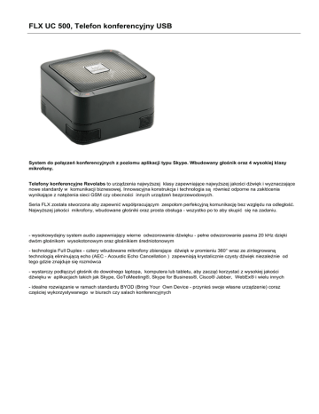 FLX UC 500, Telefon konferencyjny USB System do połączeń konferencyjnych z poziomu aplikacji typu Skype. Wbudowany głośnik oraz 4 wysokiej klasy mikrofony. Telefony konferencyjne Revolabs to urządzenia najwyższej klasy zapewniające najwyższej jakości dźwięk i wyznaczające nowe standardy w komunikacji biznesowej. Innowacyjna konstrukcja i technologia są również odporne na zakłócenia wynikające z natężenia sieci GSM czy obecności innych urządzeń bezprzewodowych. Seria FLX została stworzona aby zapewnić współpracującym zespołom perfekcyjną komunikację bez względu na odległość. Najwyższej jakości mikrofony, wbudowane głośniki oraz prosta obsługa - wszystko po to aby skupić się na zadaniu. - wysokowydajny system audio zapewniający wierne odwzorowanie dźwięku - pełne odwzorowanie pasma 20 kHz dzięki dwóm głośnikom wysokotonowym oraz głośnikiem średniotonowym - technologia Full Duplex - cztery wbudowane mikrofony zbierające dźwięk w promieniu 360° wraz ze zintegrowaną technologią eliminującą echo (AEC - Acoustic Echo Cancellation ) zapewniają krystalicznie czysty dźwięk niezależnie od tego gdzie znajduje się rozmówca - wystarczy podłączyć głośnik do dowolnego laptopa, komputera lub tabletu, aby zacząć korzystać z wysokiej jakości dźwięku w aplikacjach takich jak Skype, GoToMeeting®, Skype for Business®, Cisco® Jabber, WebEx® i wielu innych - idealne rozwiązanie w ramach standardu BYOD (Bring Your Own Device - przynieś swoje własne urządzenie) coraz częściej wykorzystywanego w biurach czy salach konferencyjnych