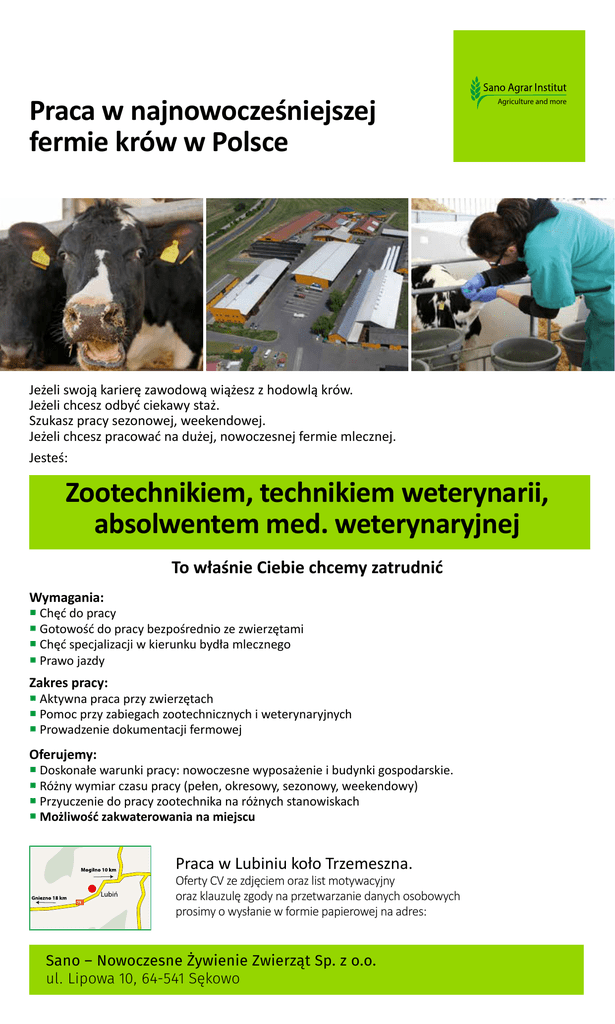 Praca w najnowocześniejszej fermie krów w Polsce Agriculture and more Jeżeli swoją karierę zawodową wiążesz z hodowlą krów. Jeżeli chcesz odbyć ciekawy staż. Szukasz pracy sezonowej, weekendowej. Jeżeli chcesz pracować na dużej, nowoczesnej fermie mlecznej. Jesteś: Zootechnikiem, technikiem weterynarii, absolwentem med. weterynaryjnej To właśnie Ciebie chcemy zatrudnić Wymagania: ¡ Chęć do pracy ¡ Gotowość do pracy bezpośrednio ze zwierzętami ¡ Chęć specjalizacji w kierunku bydła mlecznego ¡ Prawo jazdy Zakres pracy: ¡ Aktywna praca przy zwierzętach ¡ Pomoc przy zabiegach zootechnicznych i weterynaryjnych ¡ Prowadzenie dokumentacji fermowej Oferujemy: ¡ Doskonałe warunki pracy: nowoczesne wyposażenie i budynki gospodarskie. ¡ Różny wymiar czasu pracy (pełen, okresowy, sezonowy, weekendowy) ¡ Przyuczenie do pracy zootechnika na różnych stanowiskach ¡ Możliwość zakwaterowania na miejscu Praca w Lubiniu koło Trzemeszna. Oferty CV ze zdjęciem oraz list motywacyjny oraz klauzulę zgody na przetwarzanie danych osobowych prosimy o wysłanie w formie papierowej na adres: Sano – Nowoczesne Żywienie Zwierząt Sp. z o.o. ul. Lipowa 10, 64-541 Sękowo
