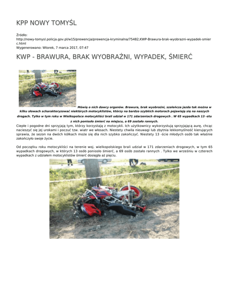 KPP NOWY TOMYŚL Źródło: http://nowy-tomysl.policja.gov.pl/w15/prewencja/prewencja-kryminalna/75482,KWP-Brawura-brak-wyobrazni-wypadek-smier c.html Wygenerowano: Wtorek, 7 marca 2017, 07:47 KWP - BRAWURA, BRAK WYOBRAŹNI, WYPADEK, ŚMIERĆ Mówią o nich dawcy organów. Brawura, brak wyobraźni, szaleńcza jazda tak można w kilku słowach scharakteryzować niektórych motocyklistów, którzy na bardzo szybkich motorach pojawiają się na naszych drogach. Tylko w tym roku w Wielkopolsce motocykliści brali udział w 171 zdarzeniach drogowych . W 65 wypadkach 13 -stu z nich poniosło śmierć na miejscu, a 69 zostało rannych. Ciepłe i pogodne dni sprzyjają tym, którzy korzystają z motocykli. Ich użytkownicy wykorzystują sprzyjającą aurę, chcąc nacieszyć się jej urokami i poczuć tzw. wiatr we włosach. Niestety chwila nieuwagi lub zbytnia lekkomyślność kierujących sprawia, że sezon na dwóch kółkach może się dla nich szybko zakończyć. Niestety 13 -ście młodych osób tak właśnie zakończyło swoje życie. Od początku roku motocykliści na terenie woj. wielkopolskiego brali udział w 171 zdarzeniach drogowych, w tym 65 wypadkach drogowych, w których 13 osób poniosło śmierć, a 69 osób zostało rannych . Tylko we wrześniu w czterech wypadkach z udziałem motocyklistów śmierć dosięgła aż pięciu. Przypominając te najgroźniej wyglądające wypadki, te w których młodzi ludzie na ścigaczach pozostawili swoje młode życie na drodze, przy której teraz rodzina będzie zapalała znicze - Apelujemy !!!! , motocykl jest dla rozsądnych ludzi . 3 września rano w Michorzewie w rejonie skrzyżowania, kierujący motocyklem nie udzielił pierwszeństwa przejazdu i doprowadził do zderzenia z osobowym vw. Zginął na miejscu. Kolejny tragiczny wypadek zdarzył się w Kuczkowie na krajowej „11” -12 września. Kierujący motocyklem hondą, uderzył w tył opla, a następnie zjechał na przeciwny pas ruchu, gdzie czołowo zderzył się z osobowym vw. Motocyklista poniósł śmierć na miejscu. W poniedziałek (13.09.2010 r.) po południu, również na krajowej „11” policjanci z Chodzieży zatrzymali motocyklistę. Powodem kontroli drogowej była jego prędkość - 165 km/h. W trakcie wypisywania czterystu złotowego mandatu i nakładania 10 punktów karnych, policyjną kontrolę minął na sportowej maszynie inny miłośnik dwóch kółek. W tym momencie chyba liczył na to, że mundurowi są zbyt zajęci, a może z czystej arogancji odkręcił manetkę gazu do oporu. Niestety policyjny radar był jeszcze szybszy i odnotował jego prędkość 214 km/h. Policjanci nie ryzykowali bezcelowego pościgu, lecz natychmiast powiadomili kolegów z Piły. Pirat wpadł w Ujściu, okazał się nim 35 letni mieszkaniec Budzynia. Mężczyzna odmówił przyjęcia tysiączłotowego mandatu i 15 punktów karnych, a więc sprawa znajdzie swój finał w Sądzie. Kierowca motocykla może spodziewać się zatrzymania prawa jazdy, tym bardziej, że na swoim koncie zgromadził punkty za inne wykroczenia drogowe. Z policyjnych analiz i statystyk wynika, że największe zagrożenie motocykliści stanowią na terenie powiatu poznańskiego. Zanotowano tu 41 zdarzeń drogowych z udziałem właśnie tej grupy użytkowników dróg. Kolejnymi powiatami Wielkopolski, gdzie odnotowane zostały wypadki i kolizje drogowe z udziałem motocyklistów to Konin, Oborniki-po 9 zdarzeń i Gniezno, Kępno, Piła - po 8 zdarzeń. Nietrzeźwi motocykliści od początku roku byli sprawcami 5 wypadków drogowych, w których śmierć poniosły dwie osoby, a 10 zostało rannych. Główną przyczyną tych zdarzeń było niedostosowanie prędkości do warunków jazdy i jazda po niewłaściwej stronie drogi. Tego typu zdarzenia są codziennym żniwem na naszych drogach. Należy podkreślić, że tragedii można byłoby uniknąć, gdyby użytkownicy jednośladów, przede wszystkim motocykli zachowywali większy umiar w swych poczynaniach. Zbytnia brawura, nieuwaga, brak wyobraźni, lub brak podstawowych umiejętności w kierowaniu ciężkim motocyklem sprawia, że ginący na drogach pozostawiają w żałobie swoich najbliższych. zobacz do czego prowadzi brawura i brak wyobraźni.... Ocena: 0/5 (0) Tweetnij