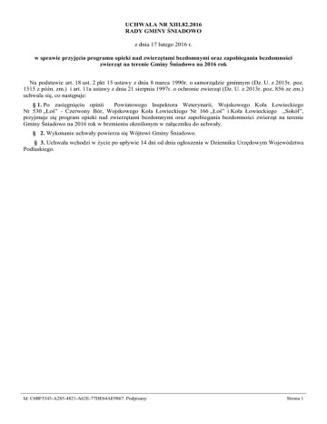 UCHWAŁA NR XIII.82.2016 RADY GMINY ŚNIADOWO z dnia 17 lutego 2016 r. w sprawie przyjęcia programu opieki nad zwierzętami bezdomnymi oraz zapobiegania bezdomności zwierząt na terenie Gminy Śniadowo na 2016 rok Na podstawie art. 18 ust. 2 pkt 15 ustawy z dnia 8 marca 1990r. o samorządzie gminnym (Dz. U. z 2015r. poz. 1515 z późn. zm.) i art. 11a ustawy z dnia 21 sierpnia 1997r. o ochronie zwierząt (Dz. U. z 2013r. poz. 856 ze zm.) uchwala się, co następuje: § 1. Po zasięgnięciu opinii Powiatowego Inspektora Weterynarii, Wojskowego Koła Łowieckiego Nr 530 „Łoś” - Czerwony Bór, Wojskowego Koła Łowieckiego Nr 166 „Łoś” i Koła Łowieckiego „Sokół”, przyjmuje się program opieki nad zwierzętami bezdomnymi oraz zapobiegania bezdomności zwierząt na terenie Gminy Śniadowo na 2016 rok w brzmieniu określonym w załączniku do uchwały. § 2. Wykonanie uchwały powierza się Wójtowi Gminy Śniadowo. § 3. Uchwała wchodzi w życie po upływie 14 dni od dnia ogłoszenia w Dzienniku Urzędowym Województwa Podlaskiego. Id: C6BF5343-A285-4821-A62E-77DE64AE9867. Podpisany Strona 1 Załącznik do Uchwały Nr XIII.82.2016 Rady Gminy Śniadowo z dnia 17 lutego 2016 r. Program opieki nad zwierzętami bezdomnymi oraz zapobiegania bezdomności zwierząt na terenie Gminy Śniadowo na 2016 roku Rozdział 1. POSTANOWIENIA OGÓLNE § 1. Ilekroć w uchwale jest mowa o: 1) Schronisku dla bezdomnych zwierząt, należy przez to rozumieć Schronisko dla Bezdomnych Zwierząt „CANIS” Kruszewo 34, 07-440 Goworowo, 2) Programie, należy przez to rozumieć Program opieki nad zwierzętami bezdomnymi oraz zapobiegania bezdomności zwierząt na terenie Gminy Śniadowo w 2016 roku, 3) Urzędzie – należy rozumieć Urząd Gminy w Śniadowie, przy pomocy którego Wójt Gminy Śniadowo wykonuje zadania, 4) Wójcie – należy rozumieć Wójta Gminy Śniadowo, 5) Gminie – należy rozumieć Gminę Śniadowo, 6) Zwierzętach bezdomnych – należy przez to rozumieć zwierzęta domowe lub gospodarskie, które uciekły, zabłąkały się lub zostały porzucone przez człowieka a nie ma możliwości ustalenia ich właściciela lub innej osoby, pod której opieką trwale dotąd pozostawały, 7) Zwierzętach domowych - należy przez to rozumieć zwierzęta tradycyjnie przebywające wraz z człowiekiem w jego domu lub odpowiednim pomieszczeniu, utrzymywane przez człowieka w charakterze jego towarzysza, 8) Kotach wolno żyjących – należy przez to rozumieć koty urodzone lub żyjące na wolności (żyjące w otoczeniu człowieka w stanie dzikim), 9) Organizacjach pozarządowych – należy przez to rozumieć organizacje, których celem statutowym jest ochrona zwierząt. § 2. 1. Koordynatorem Programu jest Wójt za pośrednictwem Urzędu 2. Realizatorami Programu są: 1) na poziomie Gminy – Wójt za pośrednictwem Urzędu – Referatu Rozwoju Gospodarczego; 2) Schronisko dla Bezdomnych Zwierząt „CANIS” Kruszewo 34, 07-440 Goworowo; 3) Służby porządkowe: Posterunek Policji w Śniadowie; Rozdział 2. CEL PROGRAMU § 3. 1. Celem Programu jest zapobieganie bezdomności zwierząt na terenie Gminy oraz opieka nad zwierzętami bezdomnymi. 2. Zadania priorytetowe Programu to: 1) zapewnienie opieki bezdomnym zwierzętom z terenu Gminy Śniadowo, 2) zapewnienie bezpieczeństwa mieszkańcom Gminy, 3) poszukiwanie nowych właścicieli dla bezdomnych zwierząt, 4) odławianie bezdomnych zwierząt z terenu Gminy, 5) zapewnienie całodobowej opieki weterynaryjnej w przypadkach zdarzeń drogowych z udziałem zwierząt, Id: C6BF5343-A285-4821-A62E-77DE64AE9867. Podpisany Strona 1 6) sprawowanie opieki nad kotami wolno żyjącymi, w tym ich dokarmianie, 7) edukacja mieszkańców Gminy w zakresie humanitarnego traktowania zwierząt, Rozdział 3. REALIZACJA ZADAŃ § 4. Zapewnienie opieki bezdomnym zwierzętom z terenu Gminy Śniadowo realizują: 1. Wójt poprzez schronisko dla bezdomnych zwierząt: Schronisko dla Bezdomnych Zwierząt „CANIS” Kruszewo 34, 07-440 Goworowo. § 5. Sprawowanie opieki nad kotami wolno żyjącymi, w tym ich dokarmianie realizują: Wójt, poprzez: 1) zakup i wydawanie karmy społecznym opiekunom (karmicielom) kotów wolno żyjących; 2) podejmowanie interwencji w sprawach kotów wolno żyjących; § 6. Odławianie bezdomnych zwierząt z terenu Gminy realizują: Schronisko dla Bezdomnych Zwierząt „CANIS” Kruszewo 34, 07-440 Goworowo na telefoniczne zgłoszenie pracownika Urzędu Gminy Śniadowo. Szczegółowy zakres zadań określa zawarta przez Gminę umowa z dnia 11.01.2016r. ze Schroniskiem dla Bezdomnych Zwierząt„CANIS” Kruszewo 34, 07-440 Goworowo na wyłapywanie bezdomnych zwierząt oraz utrzymanie tych zwierząt w schronisku. § 7. Obligatoryjną sterylizację i kastrację zwierząt oraz usypianie ślepych miotów psów realizują: 1) Schronisko poprzez obligatoryjne przeprowadzanie zabiegów sterylizacji i kastracji zwierząt przyjętych do Schroniska z wyjątkiem zwierząt u których istnieją przeciwwskazania do wykonywania tych zabiegów z uwagi na stan zdrowia i/lub wiek. 2) Wójt poprzez prowadzenie akcji zachęcającej właścicieli psów i kotów do wykonywania zabiegów sterylizacji i kastracji. § 8. Poszukiwanie nowych właścicieli dla bezdomnych zwierząt realizują: 1) Schronisko dla bezdomnych zwierząt, poprzez prowadzenie działań mających na celu przekazywanie zwierząt nowym opiekunom, 2) Wójt poprzez schronisko dla bezdomnych zwierząt; § 9. Wskazywanie gospodarstwa rolnego w celu zapewnienia miejsca dla zwierząt gospodarskich. Gospodarstwo rolne, które będzie zapewniało miejsce dla zwierząt gospodarskich położone jest w miejscowości Śniadowo, ul. Kościelna 17/2 i stanowi własność Pana Krzysztofa Leszczyńskiego. § 10. Zapewnienie całodobowej opieki weterynaryjnej w przypadkach zdarzeń drogowych z udziałem zwierząt realizuje: "Vetivet" s.c. Wojciech Dymerski i Artur Koda, Konarzyce ul. Łomżyńska 98a 18-