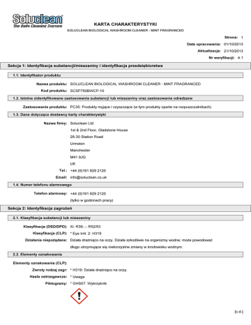KARTA CHARAKTERYSTYKI SOLUCLEAN BIOLOGICAL WASHROOM CLEANER - MINT FRAGRANCED Strona: 1 Data opracowania: 01/10/2013 Aktualizacja: 21/10/2013 Nr weryfikacji: 4.1 Sekcja 1: Identyfikacja substancji/mieszaniny i identyfikacja przedsiębiorstwa 1.1. Identyfikator produktu Nazwa produktu: SOLUCLEAN BIOLOGICAL WASHROOM CLEANER - MINT FRAGRANCED Kod produktu: SCSP750BWCP-10 1.2. Istotne zidentyfikowane zastosowania substancji lub mieszaniny oraz zastosowania odradzane Zastosowanie produktu: PC35: Produkty myjące i czyszczące (w tym produkty oparte na rozpuszczalnikach). 1.3. Dane dotyczące dostawcy karty charakterystyki Nazwa firmy: Soluclean Ltd 1st & 2nd Floor, Gladstone House 26-30 Station Road Urmston Manchester M41 9JQ UK Tel.: +44 (0)161 629 2120 Email: [email protected] 1.4. Numer telefonu alarmowego Telefon alarmowy: +44 (0)161 629 2120 (tylko w godzinach pracy) Sekcja 2: Identyfikacja zagrożeń 2.1. Klasyfikacja substancji lub mieszaniny Klasyfikacja (DSD/DPD): Xi: R36; -: R52/53 Klasyfikacja (CLP): * Eye Irrit. 2: H319 Działania niepożądane: Działa drażniąco na oczy. Działa szkodliwie na organizmy wodne; może powodować długo utrzymujące się niekorzystne zmiany w środowisku wodnym. 2.2. Elementy oznakowania Elementy oznakowania (CLP): Zwroty rodzaj zagr: * H319: Działa drażniąco na oczy. Hasła ostrzegawcze: * Uwaga Piktogramy: * GHS07: Wykrzyknik [c.d.] KARTA CHARAKTERYSTYKI SOLUCLEAN BIOLOGICAL WASHROOM CLEANER - MINT FRAGRANCED Strona: 2 Zwroty środki ostr: * P264: Dokładnie umyć ręce po użyciu. P280: Stosować rękawice ochronne/odzież ochronną/ochronę oczu/ochronę twarzy. P305+351+338: W PRZYPADKU DOSTANIA SIĘ DO OCZU: Ostrożnie płukać wodą przez kilka minut. Wyjąć soczewki kontaktowe, jeżeli są i można je łatwo usunąć. Nadal płukać. P337+313: W przypadku utrzymywania się działania drażniącego na oczy: Zasięgnąć się pod opiekę lekarza. Elementy oznakowania (DSD/DPD): Symbole zagrożeń: Produkt drażniący. Wyraż. dotyczące zagrożen: R36: Działa drażniąco na oczy. R52/53: Działa szkodliwie na organizmy wodne; może powodować długo utrzymujące się niekorzystne zmiany w środowisku wodnym. Wyraż. dotyczące bezpiecz.: S26: Zanieczyszczone oczy przemyć natychmiast dużą ilością wody i zasięgnąć porady lekarza. S57: Używać odpowiednich pojemników zapobiegających skażeniu środowiska. S60: Produkt i opakowanie usuwać jako odpad niebezpieczny. 2.3. Inne zagrożenia Inne zagrożenia: Brak danych. PBT: Substancji nie oznaczono jako substancji trwałej, ulegającej bioakumulacji i toksycznej (tzw. substancja PBT). Sekcja 3: Skład/informacja o składnikach 3.2. Mieszaniny Składniki niebezpieczne: CITRIC ACID POWDER EINECS 201-069-1 CAS 77-92-9 Klasyfikacja (DSD/DPD) Klasyfikacja (CLP) Xi: R36/38 Eye Irrit. 2: H319 Xi: R36/38; N: R51/53 Eye Irrit. 2: H319; Aquatic Chronic 3: H412 Procento wa 70-90% FRAGRANCE - - 1-10% [c.d.] KARTA CHARAKTERYSTYKI SOLUCLEAN BIOLOGICAL WASHROOM CLEANER - MINT FRAGRANCED Strona: 3 SODIUM ALKANE SULFONATE - 97489-15-1 Xn: R22; Xi: R38; Xi: R41 Acute Tox. 4: H302; Skin Irrit. 2: H315; Eye Dam. 1: H318 1-10% Sekcja 4: Środki pierwszej pomocy 4.1. Opis środków pierwszej pomocy Kontakt ze skórą Zdjąć natychmiast zanieczyszczoną odzież i obuwie, chyba że są przyklejone do skóry. Natychmiast zmyć dużą ilością wody z mydłem. Zanieczyszczenie oka Płukać oko pod bieżącą wodą przez 15 minut. Skonsultować się z lekarzem. Spożycie: Przemyć jamę ustną wodą. Skonsultować się z lekarzem. Wdychanie: Wynieść poszkodowanego z zagrożonego miejsca dbając przy tym o własne bezpieczeństwo. Skonsultować się z lekarzem. 4.2. Najważniejsze ostre i opóźnione objawy oraz skutki narażenia Kontakt ze skórą W miejscu zetknięcia może wystąpić podrażnienie i zaczerwienienie. Zanieczyszczenie oka Może wystąpić podrażnienie i zaczerwienienie. Może wystąpić silne łzawienie oczu. Spożycie: Może wystąpić podrażnienie i zaczerwienienie jamy ustnej i gardła. Wdychanie: Może wystąpić podrażnienie gardła z odczuciem ucisku w klatce piersiowej. Narażenie może spowodować kaszel lub rzężenie. Działanie opóźnione: Po krótkotrwałym kontakcie z substancją można spodziewać się natychmiastowego działania. 4.3. Wskazania dotyczące wszelkiej natychmiastowej pomocy lekarskiej i szczególnego postępowania z poszkodowanym Postęp. natychmiast./szczególne: Na terenie placówki powinien być dostępny sprzęt do kąpieli ocznej. Sekcja 5: Postępowanie w przypadku pożaru 5.1. Środki gaśnicze Środki gaśnicze: Do gaszenia ognia w sąsiedztwie należy zastosować odpowiednie środki gaśnicze. 5.2. Szczególne zagrożenia związane z substancją lub mieszaniną Zagroż. w przyp. naraż.: Podczas spalania wydziela toksyczne dymy. 5.3. Informacje dla straży pożarnej Informacje dla straży pożarnej: Zastosować niezależny aparat oddechowy. W celu zapobieżenia zetknięciu ze skórą i dostaniem do oczu należy nosić odzież ochronną. Sekcja 6: Postępowanie w przypadku niezamierzonego uwolnienia do środowiska 6.1. Indywidualne środki ostrożności, wyposażenie ochronne i procedury w sytuacjach awaryjnych Śr. ostrożn. wzgledem ludzi: Informacje odnośnie ochrony osobistej podano w punkcie 8 karty bezpieczeństwa. Na zewnątrz - nie podchodzić z wiatrem. Na zewnątrz- ustawić inne osoby pod wiatr i z dala od miejsca zagrożenia. Oznaczyć skażone miejsce odpowiednimi znakami i uniemożliwić dostęp osobom postronnym. Nie powodować wzniecania kurzu. [c.d.] KARTA CHARAKTERYSTYKI SOLUCLEAN BIOLOGICAL WASHROOM CLEANER - MINT FRAGRANCED Strona: 4 6.2. Środki ostrożności w zakresie ochrony środowiska Śr. ostrożn. wzgl. środ.: Nie wylewać do kanalizacji lub do rzeki. 6.3. Metody i materiały zapobiegające rozprzestrzenianiu się skażenia i służące do usuwania skażenia Procedury usuwania: Przenieść do zamykanego, opisanego pojemn