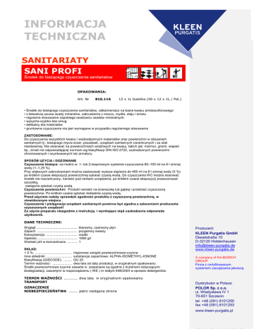 INFORMACJA TECHNICZNA SANITARIATY SANI PROFI Środek do bieżącego czyszczenia sanitariatow OPAKOWANIA: Art. Nr 810.116 12 x 1L butelka (40 x 12 x 1L / Pal.) • Środek do bieżącego czyszczenia sanitariatów, odkamieniacz na bazie kwasu amidosulfonowego • z łatwością usuwa osady mineralne, zabrudzenia z moczu, mydła, oleju i smaru • regularne stosowanie zapobiega osadzaniu osadów mineralnych • wysycha szybko bez smug • delikatny dla materiałów • gruntowne czyszczenie nie jest wymagane w przypadku regularnego stosowania ZASTOSOWANIE: Do czyszczenia wszystkich kwaso i wodoodpornych materiałów oraz powierzchni w obszarach sanitarnych tj.: bieżącego mycia ścian, posadzek, urządzeń sanitarnych ceramicznych i ze stali nierdzewnej. Nie stosować na powierzchniach wrażliwych na kwasy, takich jak: marmur, granit, wapień itp., emali nie odpowiadającej normom wg klasyfikacji DIN ISO 2722, uszkodzonych powierzchni chromowanych i ocynkowanych lub armatury. SPOSÓB UZYCIA i DOZOWANIE Czyszczenie bieżące: na mokro w 1- lub 2-stopniowym systemie czyszczenia 80–100 ml na 8 l zimnej wody (1–1,25 %). Przy większych zabrudzeniach można zastosować wyższe stężenie do 400 ml na 8 l zimnej wody (5 %) po krótkim czasie ekspozycji powierzchnię spłukać czystą wodą. Do czyszczenia WC można stosować środek nie rozcieńczony, nanieść pod rantami urządzenia, po krótkim czasie ekspozycji przeszorować szczotką, następnie spłukać czystą wodą. Czyszczenie powierzchni: Produkt nanieść na ściereczkę lub gąbkę i przetrzeć czyszczoną powierzchnie. Po krótkim czasie spłukać dokładnie czystą wodą. Przed użyciem należy sprawdzić zgodność produktu z czyszczoną powierzchnią, w niewidocznym miejscu . Czyszczenie i pielęgnacja urządzeń sanitarnych powinna być zgodna z zaleceniami producenta czyszczonych urządzeń! Za użycie preparatu niezgodnie z instrukcją i wynikające stąd uszkodzenia odpowiada użytkownik. DANE TECHNICZNE: Wygląd ............................................ Zapach ............................................ Konsystencja .................................. Gęstość............................................ Wartość pH w koncentracie ........... klarowny, czerwony płyn przyjemny świeży rzadki 1060 g/l 1 SKŁAD: < 5 %: ........................................ niejonowe związki powierzchniowo-czynne Inne składniki ............................ substancje zapachowe: ALPHA-ISOMETHYL-IONONE Klasyfikacja (GISCODE): ......... GU 20 Termin ważności: ..................... dwa lata od daty produkcji, w oryginalnym opakowaniu Środki powierzchniowo czynne zawarte w preparacie są zgodne z kryteriami dotyczącymi biodegradacji, zawartymi w rozporządzeniu ( WE ) nr stałym 648/2004 w sprawie detergentów. TERMIN WAŻNOŚCI ........... dwa lata w oryginalnym opakowaniu TRANSPORT OZNACZENIE NIEBEZPIECZEŃSTWA ....... patrz następna strona Producent: KLEEN Purgatis GmbH Dieselstraße 10 D-32120 Hiddenhausen [email protected] www.kleen-purgatis.de A company of the BUDICH GROUP Firma z certyfikowanym systemem zarządzania jakością Dystrybutor w Polsce: Producent: POLOR Sp. z o.o. ul.KLEEN Władysława IV 1GmbH Purgatis 70-651 Szczecin10 Dieselstraße tel. +48 (091) 8101250 D-32120 Hiddenhausen fax +48 (091) 8101253 Dystrybutor w Polsce: www.kleen-purgatis.pl POLOR Sp. z o.o. ul. Władysława IV 1 70-651 Szczecin INFORMACJA TECHNICZNA SANI PROFI Środek do bieżącego czyszczenia sanitariatów OSTRZEŻENIA I ZALECENIA DOTYCZĄCE BEZPIECZEŃSTWA: S 2: chronić przed dziećmi S 46: W razie połknięcia niezwłocznie zasięgnij porady lekarza – pokaż opakowanie lub etykietę Produkt nie jest preparatem niebezpiecznym wg przepisów (ADR)