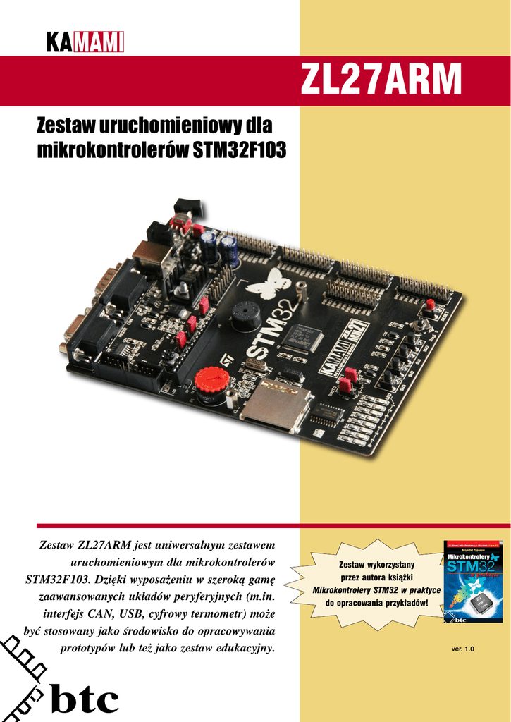 Zestaw uruchomieniowy dla mikrokontrolerów STM32F103 Zestaw ZL27ARM jest uniwersalnym zestawem uruchomieniowym dla mikrokontrolerów STM32F103. Dzięki wyposażeniu w szeroką gamę zaawansowanych układów peryferyjnych (m.in. interfejs CAN, USB, cyfrowy termometr) może być stosowany jako środowisko do opracowywania prototypów lub też jako zestaw edukacyjny. ZL27ARM Zestaw wykorzystany przez autora książki Mikrokontrolery STM32 w praktyce do opracowania przykładów! ver. 1.0 ZL27ARM – zestaw uruchomieniowy dla mikrokontrolerów STM32F103 Podstawowe parametry ► mikrokontroler STM32F103VBT6 w obudowie LQFP100 (m.in. 128 kB pamięci Flash, 20 kB pamięci SRAM, 2×SPI, 2×I2C, 3×UART, USB, CAN, ADC) ► dwa rezonatory kwarcowe (8 MHz, 32,768 kHz) ► 4-przyciskowa klawiatura ► 5-pozycyjny joystick ► 8 diod LED ► pięć 16-bitowych portów GPIO ► złącze dla alfanumerycznego wyświetlacza LCD 2×16 znaków (LCD1602) ► podświetlenie LCD o regulowanej jasności (PWM) ► termometr cyfrowy TC77 (Microchip) z SPI ► interfejs CAN ze złączem DB9M ► interfejs USB (device) ► przetwornik piezoceramiczny ► potencjometr umożliwiający podanie napięcia na wejście przetwornika analogowo-cyfrowego wbudowanego w mikrokontroler ► 20-wyprowadzeniowe złącze JTAG umożliwiające programowanie pamięci oraz debugowanie programu ► złącze USB umożliwiające transmisję danych pomiędzy komputerem PC a mikrokontrolerem STM32 ► złącze kart pamięci SD/MMC ► złącze DB9 i interfejs RS232 ► zworki służące do wyboru typu pamięci, z której zostanie uruchomiony mikrokontroler Wyposażenie standardowe Kod ZL27ARM Opis ► Zmontowana płytka zestawu z mikrokontrolerem STM32F103VBT6 BTC Korporacja 05-120 Legionowo ul. Lwowska 5 tel.: (022) 767-36-20 faks: (022) 767-36-33 e-mail: [email protected] http://www.kamami.pl Zastrzegamy prawo do wprowadzania zmian bez uprzedzenia. Oferowane przez nas płytki drukowane mogą się różnić od prezentowanej w dokumentacji, przy czym zmianom nie ulegają jej właściwości użytkowe. BTC Korporacja gwarantuje zgodność produktu ze specyfikacją. BTC Korporacja nie ponosi odpowiedzialności za jakiekolwiek szkody powstałe bezpośrednio lub pośrednio w wyniku użycia lub nieprawidłowego działania produktu. BTC Korporacja zastrzega sobie prawo do modyfikacji niniejszej dokumentacji bez uprzedzenia. http://www.kamami.pl/ ZL27ARM – zestaw uruchomieniowy dla mikrokontrolerów STM32F103 3 Spis treści ► ► ► ► ► ► ► ► ► ► ► ► ► ► ► ► ► Schemat elektryczny ................................................................................................................................................4 Zasilanie ...................................................................................................................................................................6 Klawiatura................................................................................................................................................................7 Joystick ....................................................................................................................................................................8 Diody LED ..............................................................................................................................................................9 Potencjometr analogowy .......................................................................................................................................10 Termometr cyfrowy ...............................................................................................................................................11 Przetwonik piezoelektryczny.................................................................................................................................12 Złącze alfanumerycznego wyświetlacza LCD ......................................................................................................13 Podświetlanie alfanumerycznego wyświetlacza LCD ..........................................................................................14 Interfejs USB .........................................................................................................................................................15 Złącze kart SD/MMC ............................................................................................................................................16 Zworki BOOT........................................................................................................................................................17 Wyprowadzenia portów wejścia/wyjścia ..............................................................................................................18 Złącze JTAG ..........................................................................................................................................................19 Interfejs RS232 ......................................................................................................................................................20 Interfejs CAN ........................................................................................................................................................21 http://www.kamami.pl/ 4 ZL27ARM – zestaw uruchomieniowy dla mikrokontrolerów STM32F103 Schemat elektryczny Schemat elektryczny płyty bazowej pokazano na rysunku poniżej oraz na następnej stronie. http://www.kamami.pl/ ZL27ARM – zestaw uruchomieniowy dla mikrokontrolerów STM32F103 http://www.kamami.pl/ 5 6 ZL27ARM – zestaw uruchomieniowy dla mikrokontrolerów STM32F103 Zasilanie Zestaw ZL27ARM może być zasilany z portu USB komputera PC (złącze Con2, zworka PWR_SEL w pozycji USB) lub z zewnętrznego źródła napięcia o wartości 9...12 V (złącze Con1, zworka PWR_SEL w pozycji EXT). Zestaw jest wyposa