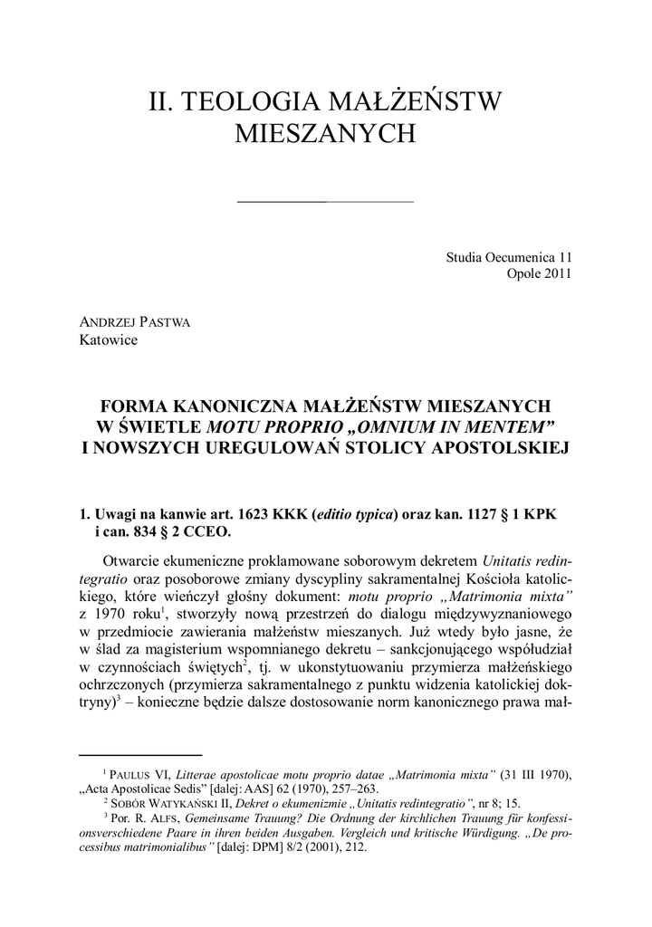 II. TEOLOGIA MA E STW MIESZANYCH Studia Oecumenica 11 Opole 2011 ANDRZEJ P ASTWA Katowice FORMA KANONICZNA MA E STW MIESZANYCH W WIETLE MOTU PROPRIO „OMNIUM IN MENTEM” I NOWSZYCH UREGULOWA STOLICY APOSTOLSKIEJ 1. Uwagi na kanwie art. 1623 KKK (editio typica) oraz kan. 1127 § 1 KPK i can. 834 § 2 CCEO. Otwarcie ekumeniczne proklamowane soborowym dekretem Unitatis redintegratio oraz posoborowe zmiany dyscypliny sakramentalnej Ko cio a katolickiego, które wie czy g o ny dokument: motu proprio „Matrimonia mixta” z 1970 roku1, stworzy y now przestrze do dialogu mi dzywyznaniowego w przedmiocie zawierania ma e stw mieszanych. Ju wtedy by o jasne, e w lad za magisterium wspomnianego dekretu – sankcjonuj cego wspó udzia w czynno ciach wi tych2, tj. w ukonstytuowaniu przymierza ma e skiego ochrzczonych (przymierza sakramentalnego z punktu widzenia katolickiej doktryny)3 – konieczne b dzie dalsze dostosowanie norm kanonicznego prawa ma - 1 PAULUS VI, Litterae apostolicae motu proprio datae „Matrimonia mixta” (31 III 1970), „Acta Apostolicae Sedis” [dalej: AAS] 62 (1970), 257–263. 2 SOBÓR WATYKA SKI II, Dekret o ekumenizmie „Unitatis redintegratio”, nr 8; 15. 3 Por. R. ALFS , Gemeinsame Trauung? Die Ordnung der kirchlichen Trauung für konfessionsverschiedene Paare in ihren beiden Ausgaben. Vergleich und kritische Würdigung. „De processibus matrimonialibus” [dalej: DPM] 8/2 (2001), 212. 152 Andrzej Pastwa e skiego4. Kluczowa norma 9. Matrimonia mixta przyznawa a ordynariuszowi miejsca prawo dyspensowania od obowi zku formy kanonicznej, je li jej zachowanie wi za oby si z powa nymi trudno ciami (graves difficultates). W razie udzielania takiej dyspensy winna tylko by zachowana jaka publiczna forma zawarcia ma e stwa 5. Pierwszy znacz cy, a zdaniem niektórych – milowy krok w dialogu ekumenicznym zosta uczyniony6. Jeszcze bardziej g bokich zmian „dostosowawczych” oczekiwano w nowym kodeksowym prawie ma e skim. Trwa y ju prace nad reform kodeksu aci skiego z 1917 roku7, a z ustanowieniem przez Paw a VI Papieskiej Komisji do Rewizji Prawa Kanonicznego Ko cio ów Wschodnich (1972) podobne zabiegi obj y normy motu proprio „Crebrae allatae” z 1949 roku – pierwsze wspólne ustawodawstwo ma e skie Ko cio ów wschodnich8. I w jednym, i w drugim przypadku ambitnym celem reformy by o m.in. kompleksowe przeszczepienie nauki Vaticanum II do rozdzia ów De matrimonio w „ aci skiej” i „wschodniej” kodyfikacji Ko cio a katolickiego. Wiele za tem wskazywa o na to, e „kurs” g bokiej reformy – zainicjowany przez motu proprio „Matrimonia mixta” – wymusi dalsze, bynajmniej nie „symboliczne” przeobra enie cz ci ko cielnego ustawodawstwa dotycz cej zawierania ma e stw o ró nej przynale no ci wyznaniowej. Tak si te sta o: trudno wskaza drugi taki obszar uregulowa prawnych w Kodeksie prawa kanonicznego z 1983 roku, w którym zmiany w stosunku do kodyfikacji z 1917 roku by yby tak daleko id ce jak prawo o ma e stwach mieszanych9. Nie trzeba dodawa , e ta sama „piecz ” soborowego aggiornamento stygmatyzuje 4 Posoborowe zmiany w prawie ma e skim nast powa y stopniowo. Jeszcze instrukcja Kongregacji Doktryny Wiary z marca 1966 roku Matrimonii sacramentum utrzymywa a w mocy trydenck zasad o konieczno ci katolickiej formy kanonicznej do wa nego zawarcia ka dego ma e stwa mieszanego – jakkolwiek znosi a obowi zek sk adania przyrzecze , tzw. r kojmi, przez stron niekatolick . AAS 58 (1966), 238, norma III. Zapowiedzi powa nej zmiany w tej materii by o prawo og oszone w motu proprio De Episcoporum muneribus, które wprowadza o mo li wo zwolnienia od formy kanonicznej za dyspens zarezerwowan Stolicy Apostolskiej. PAULUS VI, Litterae apostolicae motu proprio datae „De Episcoporum muneribus” (15 VI 1966), AAS 58 (1966), 470–471, norma IX, 17. 5 PAULUS VI, Litterae apostolicae motu proprio datae „Matrimonia mixta”, norma 9. 6 W opinii niemieckiego badacza problematyki ma e stw mieszanych Rainera Alfsa charakter zmian, które dokona y si w latach 1966–1970, daje podstawy, by mówi o prawdziwym skoku jako ciowym. R. ALFS , Die außerordentlichen Formen der kanonischen Eheschließung im Licht der Lehre von der Sakramentalität der Ehe. Eine Untersuchung zur ekklesiologischen Bedeutung der sakramentalen Eheschließung, in: Forschungen zur Kirchenrechtswissenschaft, hg. H. MÜLLER, R. WEIGAND, Bd. 15, Würzburg 1993, 312–323. 7 Codex Iuris Canonici, Pii X Pontificis Maximi iussu digestus, Benedicti Papae XV auctoritate promulgatus, Romae 1918 [dalej: CIC 1917]. 8 PIUS XII, Motu proprio „Crebrae allatae” (22 II 1949) [dalej: CA], AAS 41 (1949), 89–119. Forma kanoniczna ma e stw mieszanych 153 rozdzia De matrimoniis mixtis w Kodeksie Kanonów Ko cio ów Wschodnich z 1990 roku10. W obu kodeksach ustawodawca ko cielny po wi ci wiele uwagi regula cjom odnosz cym si do problemu ukonstytuowania ma e stwa – zw aszcza w przepisach o formie kanonicznej. Jak donios a i zarazem skomplikowana to materia, najlepiej wiadczy fakt, e ekumeniczne szukanie porozumienia tudzie próby zbli enia stanowisk w tym przedmiocie z niekatolickimi Ko cio ami i wspólnotami chrze cija skimi implikuje „wcze niejszy” dialog – jeszcze w onie samego Ko cio a katolickiego. Czy nie jest symptomatyczna uwaga cenionego eksperta w zakresie prawa ma e skiego Ko cio a katolickiego Josepha Pradera: „W Ko cio ach wschodnich (katolickich – A.P.) forma liturgiczna i forma prawna celebracji ma e stwa s od siebie nierozdzielne, podczas gdy w Ko ciele aci skim maj one ró n funkcj i ró n skuteczno : obrz d liturgiczny jest wymagany tylko do godziwo ci, forma prawna natomiast – do wa no ci ma e stwa. W dyscyplinie wschodniej wi ty obrz d (ritus sacer) z b ogos awie stwem kap a skim jest elementem istotnym formy prawnej”11. O tym w a nie nale y pami ta w wyk adni kan. 1127 § 1 KPK: „Co do for my ma e stwa mieszanego nale y zachowa przepisy kan. 1108. Je li jednak ma e stwo z