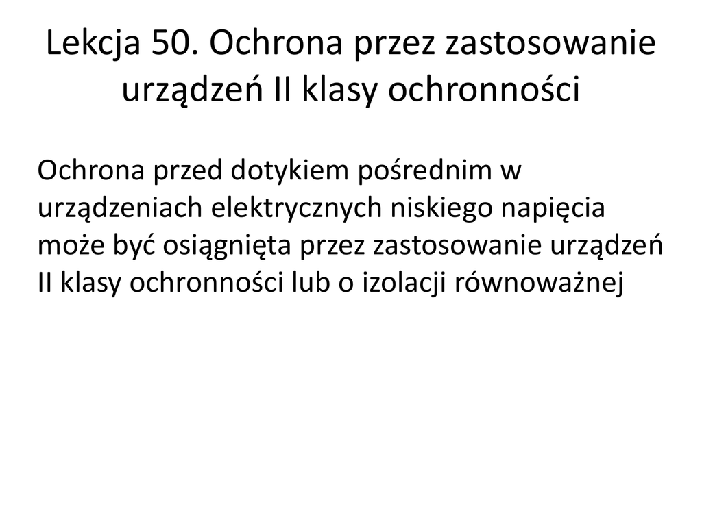 Lekcja 50. Ochrona przez zastosowanie urządzeń II klasy ochronności Ochrona przed dotykiem pośrednim w urządzeniach elektrycznych niskiego napięcia może być osiągnięta przez zastosowanie urządzeń II klasy ochronności lub o izolacji równoważnej Polega ona na niedopuszczeniu do pojawienia się w czasie użytkowania niebezpiecznego napięcia dotykowego na częściach przewodzących dostępnych w fabrycznie produkowanych urządzeniach elektrycznych. Osiąga się ten cel poprzez wyposażenie urządzenia w jedno z wymienionych niżej rozwiązań: 1. izolację podwójną, składającą się z izolacji podstawowej i niezależnej od niej dodatkowej izolacji, równoważnej pod względem wytrzymałości elektrycznej i mechanicznej. Taką izolację ma np. sprzęt gospodarstwa domowego, narzędzia ręczne, itp. 2. izolację wzmocnioną, która jest wprawdzie izolacją podstawową, lecz równoważną podwójnej pod względem wytrzymałości elektrycznej i mechanicznej, 3. obudowy izolacyjne, które są osłonami wykonanymi z materiału izolacyjnego o odpowiedniej wytrzymałości mechanicznej i odporności na wpływy środowiska, zapewniającymi stopień ochrony co najmniej IP2X. W takich obudowach wykonywany jest np. sprzęt instalacyjny (rozdzielnice skrzynkowe, wtyki, gniazda, itp.). Lekcja 51. Transformatory separujące • Transformator separujący jest transformatorem dwuuzwojeniowym, którego używa się do zasilania urządzeń napięciem odizolowanym od podstawowej sieci zasilającej. W laboratoriach pomiarowych stosuje się go np. tam, gdzie nie można używać uziemionych wyjść sieciowych, ponieważ wtedy otrzyma się pętlę uziemień, które mogą mieć wpływ na wynik pomiarów. Bieguny sieci mają jak wiadomo 230 V i O V w stosunku do ziemi. Uzwojenie wtórne transformatora separującego można pozostawić nieuziemione i w takim wypadku nie daje ono napięcia w stosunku do ziemi (napięcie wtórne pozostanie \"pływające\"). To pływające napięcie zmniejsza zasadniczo ryzyko dla osób pracujących w laboratorium. Transformator może być wyposażony w ekran pomiędzy stroną pierwotną i wtórną, aby zapobiec zakłóceniom przenoszonym pojemnościowo. Lekcja 52. Ochrona przez zastosowanie separacji elektrycznej Jest to jeden z możliwych do zastosowania środków ochrony przed dotykiem pośrednim w urządzeniach elektrycznych niskiego napięcia. Polega na zasilaniu (jednego lub więcej) chronionego urządzenia ze źródła separacyjnego, którym najczęściej jest odpowiedni transformator lub przetwornica. Części czynne obwodu separowanego nie mogą być połączone w żadnym punkcie z innym obwodem lub z ziemią. Ewentualne dotknięcie do elementów takiego obwodu przez człowieka nie powoduje porażenia, gdyż nie zamyka się droga dla prądu rażeniowego, co przesądza o skuteczności takiego rozwiązania. Jednakże dla poprawności działania tego środka obwód odbiorczy podlega licznym obostrzeniom - powinien być tak wykonany, aby ograniczyć możliwość zwarć doziemnych. Wartość napięcia w obwodzie wtórnym nie może być większa niż 500 V. • Przy zastosowaniu jednego odbiornika w obwodzie separowanym, części przewodzące dostępne obwodu nie mogą być połączone a także nie mogą się stykać z przewodem ochronnym i częściami przewodzącymi dostępnymi innych obwodów - w przeciwnym wypadku ochrona przez zastosowanie separacji elektrycznej będzie nieskuteczna (w obwodzie separowanym mogą pojawić się niebezpieczne napięcia dotykowe). Przy zastosowaniu większej liczby odbiorników w obwodzie separowanym należy przestrzegać następujących zasad: • części przewodzące dostępne obwodu należy połączyć między sobą nieuziemionym połączeniem wyrównawczym, • części przewodzące dostępne nie mogą być połączone z przewodami ochronnymi lub częściami przewodzącymi dostępnymi innych obwodów oraz częściami przewodzącymi obcymi, • wszystkie gniazda wtyczkowe muszą posiadać styki ochronne przyłączone do systemu nieuziemionych połączeń wyrównawczych, • wszystkie przewody giętkie (za wyjątkiem zasilających odbiorniki III klasy ochronności) muszą posiadać dodatkową żyłę do połączenia wyrównawczego, • obwód separowany powinien być wyposażony w zabezpieczenia wyłączające zasilanie w przypadku podwójnego zwarcia z ziemią, w czasie jaki został określony dla układów sieciowych TN. Lekcja 53. Połączenia wyrównawcze ochronne • Połączenia wyrównawcze są nieodzownym elementem ochrony przeciwporażeniowej przy dotyku pośrednim w sieciach rozdzielczych oraz instalacjach niskiego napięcia. Dzięki ich zastosowaniu uzyskuje się ekwipotencjalizację części, które nie są wzajemnie połączone przewodami ochronnymi PE, a które mogą stwarzać zagrożenie porażeniowe. • Zadania połączeń wyrównawczych Podstawowym zadaniem połączeń wyrównawczych jest wyrównanie potencjałów części łączonych tak, aby między tymi częściami nie pojawiły się napięcia stwarzające zagrożenie porażeniem ludzi oraz błędnym działaniem lub uszkodzeniem urządzeń. Zadaniem niektórych połączeń wyrównawczych jest także stwarzanie drogi przewodzenia prądu zwarć podwójnych o impedancji umożliwiającej wyłączenie uszkodzonych obwodów w wymaganym czasie. • Połączenia wyrównawcze w budynkach mogą łączyć następujące części przewodzące (rys.): – części przewodzące obce o znacznych wymiarach, – części przewodzące obce i części przewodzące dostępne (lub przyłączony do nich przewód ochronny PE), – co najmniej dwie części przewodzące dostępne izolowane od ziemi (nie połączone przewodem ochronnym PE) lub izolowane od ziemi części przewodzące dostępne i obce. Klasyfikacja połączeń wyrównawczych Połączenia wyrównawcze klasyfikuje się ze względu na: – zasięg ich działania (główne, miejscowe), – nakaz lub zakaz ich połączenia z 