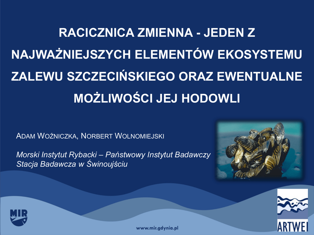 RACICZNICA ZMIENNA - JEDEN Z NAJWAŻNIEJSZYCH ELEMENTÓW EKOSYSTEMU ZALEWU SZCZECIŃSKIEGO ORAZ EWENTUALNE MOŻLIWOŚCI JEJ HODOWLI ADAM WOŹNICZKA, NORBERT WOLNOMIEJSKI Morski Instytut Rybacki – Państwowy Instytut Badawczy Stacja Badawcza w Świnoujściu RACICZNICA ZMIENNA DREIKANTMUSCHEL (WANDERMUSCHEL) (Dreissena polymorpha) 1895 1969 Zasoby racicznicy w polskiej części Zalewu: 91 tys. ton w ławicach (Muschelbänke) + szacunkowo 20 tys. ton poza zwartymi ławicami = 110 tys. ton Lata 70 i 80 – informacje o znaczącej redukcji zasobów racicznicy w Zalewie Szczecińskim. Efekt zanieczyszczeń i nadmiernej eutrofizacji oraz ich skutków. 2001 – 2004 – kompleksowe badania nad rozmieszczeniem racicznicy w polskiej części Zalewu Szczecińskiego. Zasoby na poziomie z lat 60. Jez. Wicko Wielkie i Małe 840 ton Zalew Kamieński (z Zat. Cichą i Jez. Wrzosowskim) 11 148 ton Dziwna 2 660 ton Świna i kanały Wstecznej Delty 243 tony Zalew Wielki 60 000 ton Zatoka Skoszewska (Paulsdorfer Bucht) Jez. Nowowarpieńskie 22 197 ton 143 tony Roztoka Odrzańska 10 740 ton Dolna Odra 2 955 ton Jezioro Dąbie SUMA: 35 238 ton 146 164 tony Zebra mussel – 2001 Zatoka Skoszewska (Paulsdorfer Bucht) Zalew Wielki Obszar: 20.75 km2 Obszar: 362.9 km2 Zebra mussel: Średnia biomasa: 1 070 g/m2 Maksymalna biomasa: 8 700 g/m2 Zasoby: 22 197 Ton Zebra mussel: Średnia biomasa: 152 g/m2 Maksymalna biomasa: 3 800 g/m2 Zasoby: 60 000 Ton Teoretyczna możliwość przefiltrowania wód Zatoki w 2.36 dnia, okresowe „kontrolowanie” rozwoju i zakwitów fitoplanktonu Teoretyczna możliwość przefiltrowania wód Zalewu w 36 dni Zatoka Skoszewska - 2005 Zebra mussel standing stock: 2 392 Tons (2001: 22 197 Tons) Population was reduced by factor 9.3 No significant changes were observed in the reference area (Szczecin Lagoon) Abundance Biomass 350 500 300 400 250 [g/m2] [indiv/m2] 600 300 200 200 150 100 100 0 50 6 8 10 12 14 16 18 20 22 24 26 28 30 32 Size class [mm] 0 6 2005 2001 8 10 12 14 16 18 20 22 24 26 28 30 32 Size class[mm] Lata 70 i 80 – propozycje instalacji „sztucznych raf” (Künstliches Riff) celem zwiększenia powierzchni podłoża możliwego do zasiedlenia m.in. przez racicznicę, jako sposób poprawy jakości wód Projekty nie wyszły poza stadium eksperymentu naukowego, większe konstrukcje powstały tylko na wodach morskich Minus – ograniczona możliwość kontroli populacji racicznicy. Początek XXI wieku – pierwsze pomysły hodowli racicznicy jako sposobu poprawy jakości wody. Do chwili obecnej pomysł nie wyszedł w polskiej części Zalewu poza etap opracowań teoretycznych. Dziękuję za uwagę Vielen Dank für Ihre Aufmerksamkeit
