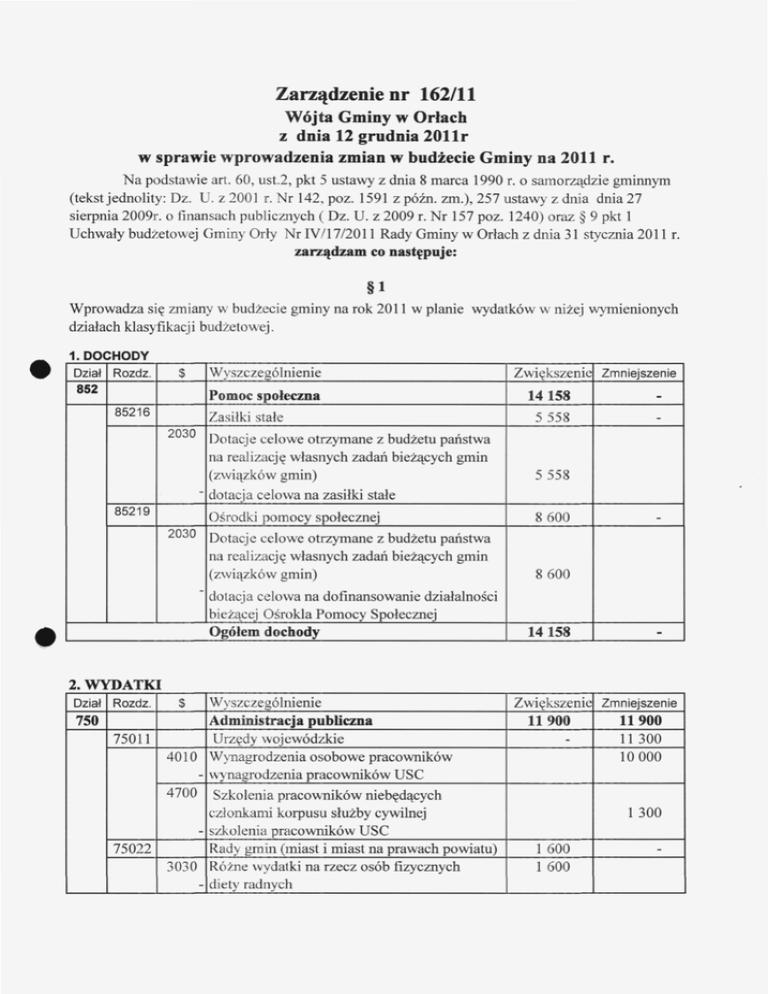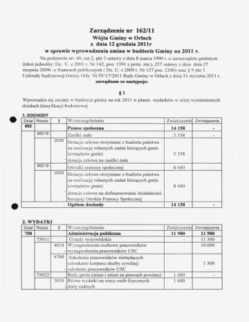 Zarządzenie Nr 162(11 Wójta Gminy w Orłach z dnia 12 grudnia