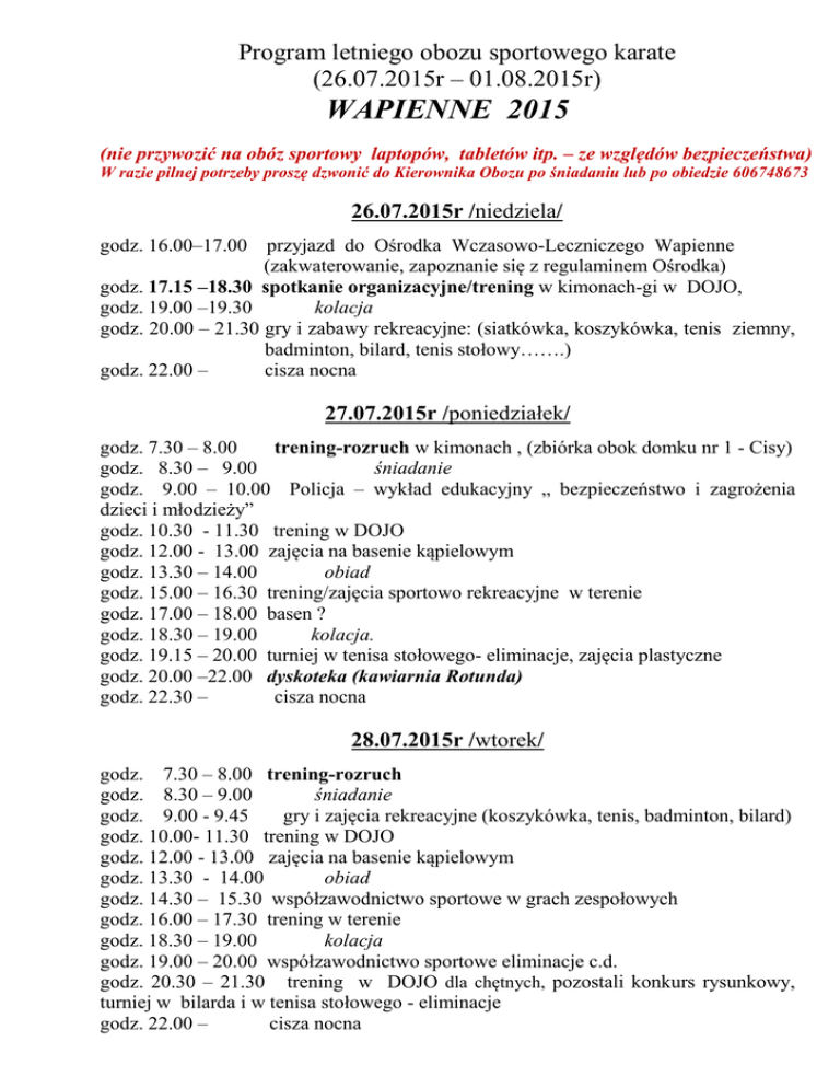 Program letniego obozu sportowego karate (26.07.2015r – 01.08.2015r) WAPIENNE 2015 (nie przywozić na obóz sportowy laptopów, tabletów itp. – ze względów bezpieczeństwa) W razie pilnej potrzeby proszę dzwonić do Kierownika Obozu po śniadaniu lub po obiedzie 606748673 26.07.2015r /niedziela/ godz. 16.00–17.00 przyjazd do Ośrodka Wczasowo-Leczniczego Wapienne (zakwaterowanie, zapoznanie się z regulaminem Ośrodka) godz. 17.15 –18.30 spotkanie organizacyjne/trening w kimonach-gi w DOJO, godz. 19.00 –19.30 kolacja godz. 20.00 – 21.30 gry i zabawy rekreacyjne: (siatkówka, koszykówka, tenis ziemny, badminton, bilard, tenis stołowy…….) godz. 22.00 – cisza nocna 27.07.2015r /poniedziałek/ godz. 7.30 – 8.00 trening-rozruch w kimonach , (zbiórka obok domku nr 1 - Cisy) godz. 8.30 – 9.00 śniadanie godz. 9.00 – 10.00 Policja – wykład edukacyjny „ bezpieczeństwo i zagrożenia dzieci i młodzieży” godz. 10.30 - 11.30 trening w DOJO godz. 12.00 - 13.00 zajęcia na basenie kąpielowym godz. 13.30 – 14.00 obiad godz. 15.00 – 16.30 trening/zajęcia sportowo rekreacyjne w terenie godz. 17.00 – 18.00 basen ? godz. 18.30 – 19.00 kolacja. godz. 19.15 – 20.00 turniej w tenisa stołowego- eliminacje, zajęcia plastyczne godz. 20.00 –22.00 dyskoteka (kawiarnia Rotunda) godz. 22.30 – cisza nocna 28.07.2015r /wtorek/ godz. 7.30 – 8.00 trening-rozruch godz. 8.30 – 9.00 śniadanie godz. 9.00 - 9.45 gry i zajęcia rekreacyjne (koszykówka, tenis, badminton, bilard) godz. 10.00- 11.30 trening w DOJO godz. 12.00 - 13.00 zajęcia na basenie kąpielowym godz. 13.30 - 14.00 obiad godz. 14.30 – 15.30 współzawodnictwo sportowe w grach zespołowych godz. 16.00 – 17.30 trening w terenie godz. 18.30 – 19.00 kolacja godz. 19.00 – 20.00 współzawodnictwo sportowe eliminacje c.d. godz. 20.30 – 21.30 trening w DOJO dla chętnych, pozostali konkurs rysunkowy, turniej w bilarda i w tenisa stołowego - eliminacje godz. 22.00 – cisza nocna 29.07.2015r /środa/ godz. 7.30 – 8.00 trening-rozruch godz. 8.30 – 9.00 śniadanie godz. 9.00 – 9.45 gry i zabawy ruchowe godz. 10.00 – 11.30 trening w DOJO godz. 12.00 – 13.00 kąpiel w basenie (turniej pływacki - eliminacje) godz. 13 30 – 14.00 obiad godz. 14.30 – 16.00 turniej w piłkę nożną półfinały (2 mecze po pół godz.) godz. 16.30 – 18.00 trening w terenie godz. 18.30 - 19.00 kolacja godz. 19.00 – 20.00 filmy karate z zawodów i obozów ? godz. 20.00 – 21.30 ognisko – piosenki obozowe godz. 22.00 – cisza nocna 30.07.2015r /czwartek/ godz. 7.30 – 8.00 trening-rozruch godz. 8.30 – 9.00 śniadanie godz. 9.00 –12.30 Straż Pożarna –Gorlice: wykład i prezentacja edukacyjna godz. 13.30 - 14.00 obiad godz. 14.30 – 15.30 basen kąpielowy (turniej pływacki - finały) godz. 16.30 – 18.00 trening w terenie oraz konkurencje: pompki, skłony, szpagat godz. 18.30 – 19.00 kolacja godz. 19.00 – 20.00 finał w bilarda i w tenisa stołowego godz. 20.30 – 21.30 trening w DOJO (przygotowanie grupy pokazowej) godz. 22.00 – cisza nocna Niespodzianka – trening nocny w terenie godz. ?...... – zbiórka pod flagą kyokushin. 31.07.2015r /piątek/ godz. 8.30 - 9.00 śniadanie godz. 9.30 – 11.30 trening w terenie w tym „bieg sprawnościowy”. godz. 12.00 – 13.00 kąpiele w basenie godz. 13.30 – 14.0 0 obiad godz. 14.30 – 15.15 finał piłki nożnej i konkurs na mistrza obrony. godz. 15.30 – 17.00 trening w terenie dla nieprzystępujących do egzaminu karate w DOJO egzamin karate – tylko uczestnicy z opłaconymi składkami egzaminacyjnymi (KUMITE w ramach Turnieju w niedzielę) godz. 17.15 – 18.00 przygotowanie do występów grupowych na sayonarę (hymny i piosenki obozowe, wiersze itp.) przysięga na Samuraja godz. 18.30 - 19.00 kolacja godz. 20.00–21.45 Kawiarnia Rotunda: Sayonara występy kabaretowe grup, konkurs piosenki obozowej, konkurencja KIAI, pasowanie na SAMURAJA godz. 22.00 – cisza nocna 01.08.2015r /sobota/ godz. 7.00-7.30 trening-rozruch godz. 8.00 – 8.30 śniadanie wystawa prac plastycznych w czasie zawodów. godz. 9.00 Letni Turniej Karate - Wapienne 2015 Konkurencje: KATA-KUMITE-KIAI-SZPAGAT-POMPKI-SKŁONY (brzuszki). Konkurencje: KIAI, SZPAGAT, POMPKI i SKŁONY (brzuszki) z podziałem na chłopcy i dziewczęta - w czwartek i piątek /Suma punktów ze wszystkich konkurencji decyduje o zwycięstwie w Turnieju/ Uczestnictwo w Turnieju jest nieobowiązkowe – dla chętnych. Pozostali aktywnie uczestniczą obserwując Turniej – obecność obowiązkowa w DOJO Konkurencja KATA zostanie rozegrana systemem punktowym. 1. Kata lub Renraku dzieci-chłopcy (rocznik 2005 i młodsi) 2. Kata lub Renraku dzieci-dziewczęta (rocznik 2005 i młodsze) 3. Kata kadeci/młodzicy (rocznik 2004 i starsi) 4. Kata kadetki/juniorki (rocznik 2004 i starsze) Konkurencja KUMITE lekki kontakt - zabronione techniki na strefę gedan 1. Kumite dzieci-chłopcy (2005r i młodsi) 2. Kumite dzieci-dziewczęta (2005 i młodsze) Wymagane regulaminowe miękkie ochraniacze goleń-stopa, suspensoria/miękki ochraniacz na piersi, piąstkówki, kask (zabezpiecza organizator) Konkurencja KUMITE semi kontakt: (na strefę jodan lekki kontakt - tylko: mawashi-geri, kake-geri, uchi-geri) 1. Kumite kadeci/młodzicy (rocznik 2004 i starsi) 2. Kumite kadetki/juniorki (rocznik 2004 i starsze) Wymagane regulaminowe miękkie ochraniacze goleń-stopa, suspensoria/miękki ochraniacz na piersi, piąstkówki, kask i hogo -zabezpiecza organizator obozu. Program Zawodów 9.00 – 10.30 rozpoczęcie zawodów - eliminacje i finały kata 10.30 – 11.30 eliminacje i finały kumite 11.30 – 12.00 wręczenie wyróżnień, ściągnięcie flagi obozowej, 12.15 – 13.15 basen 13.30 – 14.00 obiad godz. 14:00 ZAKOŃCZENIE OBOZU godz. 14.00 – 14.30 oddanie pokojów, domków i kluczy, godz. 14.00 – 15.00 wyjazd z placówki wypoczynkowej po zgłoszeniu i podpisaniu odbioru uczestników przez Rodziców 