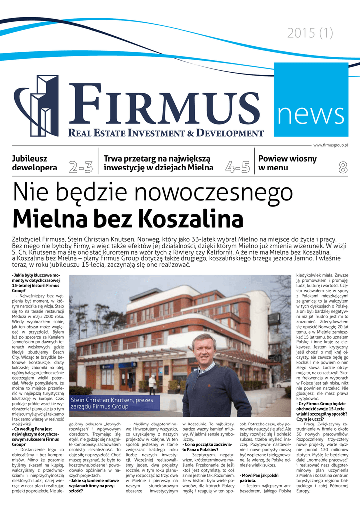2015 (1) news www.firmusgroup.pl Jubileusz dewelopera Trwa przetarg na największą inwestycję w dziejach Mielna Powiew wiosny w menu Nie będzie nowoczesnego Mielna bez Koszalina Założyciel Firmusa, Stein Christian Knutsen. Norweg, który jako 33-latek wybrał Mielno na miejsce do życia i pracy. Bez niego nie byłoby Firmy, a więc także efektów jej działalności, dzięki którym Mielno już zmienia wizerunek. W wizji S. Ch. Knutsena ma się ono stać kurortem na wzór tych z Riwiery czy Kalifornii. A że nie ma Mielna bez Koszalina, a Koszalina bez Mielna – plany Firmus Group dotyczą także drugiego, koszalińskiego brzegu jeziora Jamno. I właśnie teraz, w roku jubileuszu 15-lecia, zaczynają się one realizować. - Jakie były kluczowe momenty w dotychczasowej 15-letniej historii Firmus Group? - Najważniejszy bez wątpienia był moment, w którym narodziła się wizja. Stało się to na tarasie restauracji Meduza w maju 2000 roku. Wtedy wyobraziłem sobie, jak ten obszar może wyglądać w przyszłości. Byłem już po spacerze za Kanałem Jamneńskim po dawnych terenach wojskowych, gdzie kiedyś zbudujemy Beach City. Widząc te brzydkie betonowe konstrukcje, druty kolczaste, zbiorniki na olej, ogólny bałagan, jednocześnie dostrzegłem wielki potencjał. Wtedy pomyślałem, że można to miejsce przemienić w najlepszą turystyczną lokalizację w Europie. Czas poddaje próbie wszelkie wyobrażenia i plany, ale ja o tym miejscu myślę wciąż tak samo i tak samo wierzę w realność mojej wizji. - Co według Pana jest największym dotychczasowym sukcesem Firmus Group? - Dostarczenie tego co obiecaliśmy – bez kompromisów. Mimo że pozornie byliśmy skazani na klęskę, walczyliśmy z przeciwnościami i nieprzychylnością niektórych ludzi, dalej wierząc w nasz plan i realizując projekt po projekcie. Nie ule- Stein Christian Knutsen, prezes zarządu Firmus Group galiśmy pokusom „łatwych rozwiązań” i wpływowym doradcom. Trzymając się etyki, nie godząc się na zgniłe kompromisy, zachowałem osobistą niezależność. To daje siłę na przyszłość. Choć muszę przyznać, że było to kosztowne, bolesne i powodowało opóźnienia w naszych projektach. - Jakie są kamienie milowe w planach firmy na przyszłość? - Myślimy długoterminowo i inwestujemy wszystko, co uzyskujemy z naszych projektów w kolejne. W ten sposób jesteśmy w stanie zwiększać każdego roku liczbę naszych inwestycji. Wcześniej realizowaliśmy jeden, dwa projekty rocznie, w tym roku planujemy rozpocząć aż trzy: dwa w Mielnie i pierwszy na naszym stuhektarowym obszarze inwestycyjnym w Koszalinie. To najbliższy, bardzo ważny kamień milowy. W jakimś sensie symboliczny. - Co na początku zadziwiało Pana u Polaków? - Sceptycyzm, negatywizm, krótkoterminowe myślenie. Przekonanie, że jeśli ktoś jest optymistą, to coś z nim jest nie tak. Rozumiem, że w historii było wiele powodów, dla których Polacy myślą i reagują w ten spo- sób. Potrzeba czasu, aby ponownie nauczyć się ufać. Ale żeby rozwijać się i odnieść sukces, trzeba myśleć inaczej. Pozytywne nastawienie i nowe pomysły muszą być wspierane i pielęgnowane. Ja wierzę, że Polska odniesie wielki sukces. - Mówi Pan jak polski patriota. - Jestem najlepszym ambasadorem, jakiego Polska kiedykolwiek miała. Zawsze ją promowałem i promuję; ludzi, kulturę i wartości. Często wdawałem się w spory z Polakami mieszkającymi za granicą: to ja walczyłem w tych dyskusjach o Polskę, a oni byli bardziej negatywni niż ja! Trudno jest mi to zrozumieć. Zdecydowałem się opuścić Norwegię 20 lat temu, a w Mielnie zamieszkać 15 lat temu, bo uznałem Polskę i inne kraje za ciekawsze. Jestem krytyczny, jeśli chodzi o mój kraj ojczysty, ale zawsze będę go kochał i nie powiem o nim złego słowa. Ludzie otrzymują to, na co zasłużyli. Skoro frekwencja w wyborach w Polsce jest tak niska, nikt nie powinien narzekać. Nie głosujesz, nie masz prawa krytykować. - Czy Firmus Group będzie obchodzić swoje 15-lecie w jakiś szczególny sposób? Czym je uczci? - Pracą. Zwiększymy zatrudnienie w firmie o około 50 nowych pracowników. Rozpoczniemy trzy-cztery nowe projekty warte łącznie ponad 120 milionów złotych. Myślę że będziemy dalej „normalnie pracować” i realizować nasz długoterminowy plan uczynienia z Mielna i Koszalina centrum turystycznego regionu bałtyckiego i całej Północnej Europy. 2 news Jubileusz dewelope Kiedy 15 lat temu Firmus rozpoczynał działalność w Mielnie, mało kto uświadamiał sobie jego istnienie. Od tamtej pory sta mieleńską firmą. Zrealizowane dotąd i planowane kolejne inwestycje przynoszą korzyści nie tylko deweloperowi, ale równie Apartamentowiec DUNE A zosta do użytku w czerwcu 2013 roku Wmurowanie kamienia węgielnego pod budowę DUNE A w 2011 roku Apartamentowiec Tarasy Rezydencja Park 15 lat J edną z nich jest promocja, czyli pozytywny rozgłos. Największy wiąże się z pewnością z apartamentowcem Dune, który został oddany do użytku półtora roku temu i uzyskał już pełną funkcjonalność. Obiekt przyjmuje gości przez okrągły rok, bo jeśli nie przebywają w nim akurat właściciele apartamentów, są one wynajmowane gościom z całej Polski, Skandynawii czy Niemiec (wynajmem zarządzają wyspecjalizowane zewnętrzne firmy). Do dyspozycji odpoczywających są dwa zewnętrzne baseny kąpielowe z podgrzewaną wodą, sala fitness, na miejscu działa instytut kosmetologiczny Dermalogica oraz restauracja z kawiarnią. Oczywiście, największy ruch panował w Dune w szczycie letnim, w czasie wakacji. Warto tu jednak zauważyć, że pojęcie sezonu zaczyna się dzięki takim obiektom jak Dune powoli zmieniać. Jak pokazują statystyki wynajmu, sezon w tym jedynym na razie w Mielnie luksusowym apartamentowcu właściwie się nie kończy. Budujemy Dune to nie jedyna z dotychczasowych inwestycji Firmusa. Wcześniej były Tarasy,