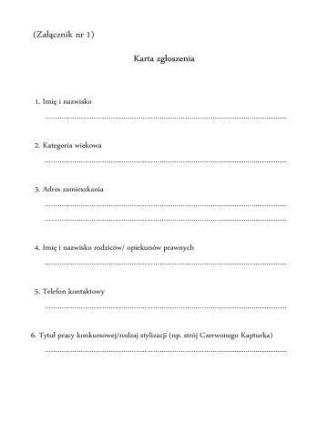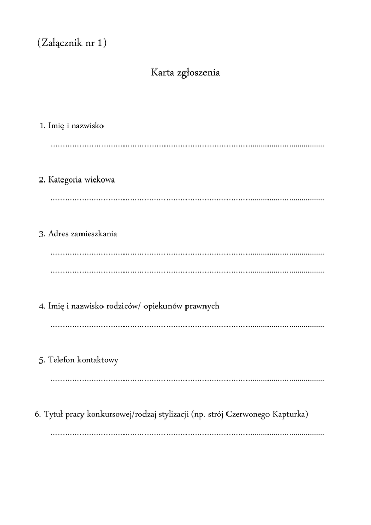 (Załącznik nr 1) Karta zgłoszenia 1. Imię i nazwisko ………………………………………………………………………….............….................. 2. Kategoria wiekowa ………………………………………………………………………….............….................. 3. Adres zamieszkania ………………………………………………………………………….............….................. ………………………………………………………………………….............….................. 4. Imię i nazwisko rodziców/ opiekunów prawnych ………………………………………………………………………….............….................. 5. Telefon kontaktowy ………………………………………………………………………….............….................. 6. Tytuł pracy konkursowej/rodzaj stylizacji (np. strój Czerwonego Kapturka) ………………………………………………………………………….............…..................