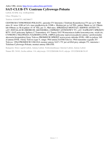 Adres URL strony http://www.adresyfirm.net/34161 SAT-CLUB-TV Centrum Cyfrowego Polsatu Luboń, 62-030, woj. wielkopolskie Ulica: Wiejska 3 a Telefon: 618105753, 602306677 CENTRUM CYFROWEGO POLSATU, sprzedaż TV Internetu i Telefonii Komórkowej TV już za 9, 90zł mies @: teraz 1GB od 1zł z max prędkością do 21Mb s. Modem już za 1zł TEL: pakiet 30min za 1zł 150min lub 450sms za 30 zł pakiet: tV @ TEL już 11, 90zł mies. SPRZEDAŻ MONTAŻ i SERWIS ANTEN TV, sAT. INSTALACJE ZBIORCZE AKCESORIA i OSPRZĘT ANTENOWY TV, sAT. NAPRAWY SPRZĘTU RTV i SAT polecamy Splitery C Transmitery AV Tunery SAT Wzmacniacze kable koncentryczne, wtyki etc. CYFROWA TELEWIZJA NAZIEMNA DVB, t MPG4 polecamy najwyższej jakości anteny i profesionalne akcesoria hiszpańskiej firmy Televes PROMOCJE SPRZĘT nowoczesny dekoder DVB, t HD za jedyne 349 zł antena DVB, t firmy Televes typu V, range: 99zł antena SAT80 Televes: 99zł transmiter sygnału AV Televes: 199zł PROMOCJE USŁUGA montaż anteny SAT i TV już od 69zł przy zakupie TV, internetu i Telefonu Cyfrowego Polsatu, montaż anteny GRATIS. Kategorie: Dom i ogród Luboń, Anteny Luboń, Telekomunikacja i Internet Luboń, Anteny Luboń Numer ID: 34161, liczba odsłon: 114, aktywacja: 15/12/2010 06:54:43, edycja: 15/12/2010 06:54:43 Strona 1 / 1
