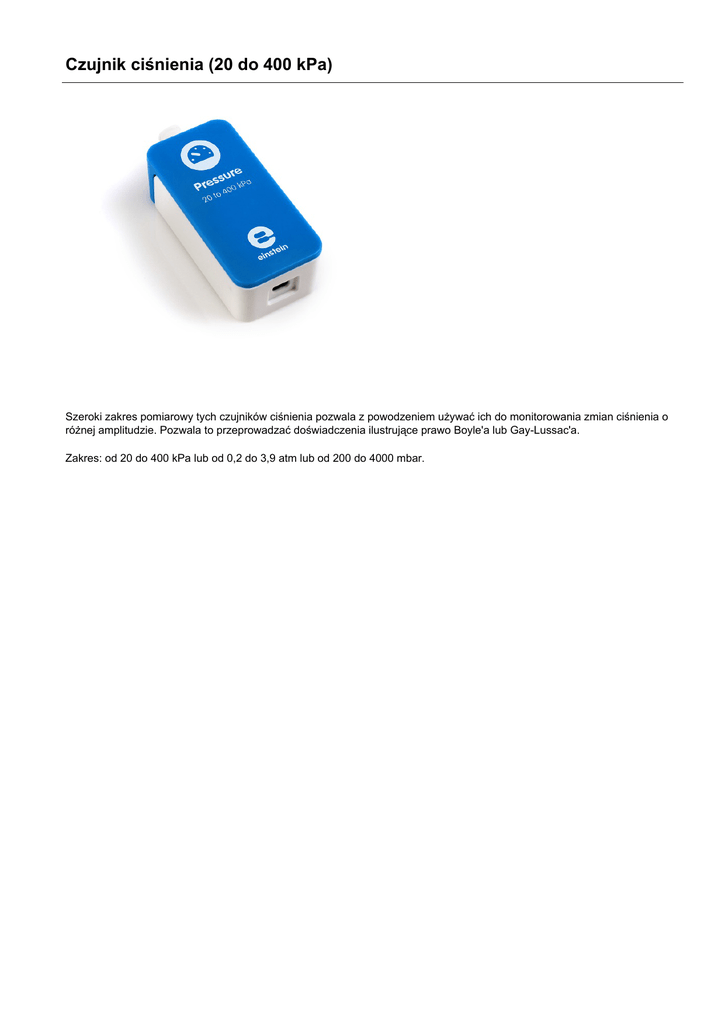 Czujnik ciśnienia (20 do 400 kPa) Szeroki zakres pomiarowy tych czujników ciśnienia pozwala z powodzeniem używać ich do monitorowania zmian ciśnienia o różnej amplitudzie. Pozwala to przeprowadzać doświadczenia ilustrujące prawo Boyle'a lub Gay-Lussac'a. Zakres: od 20 do 400 kPa lub od 0,2 do 3,9 atm lub od 200 do 4000 mbar.