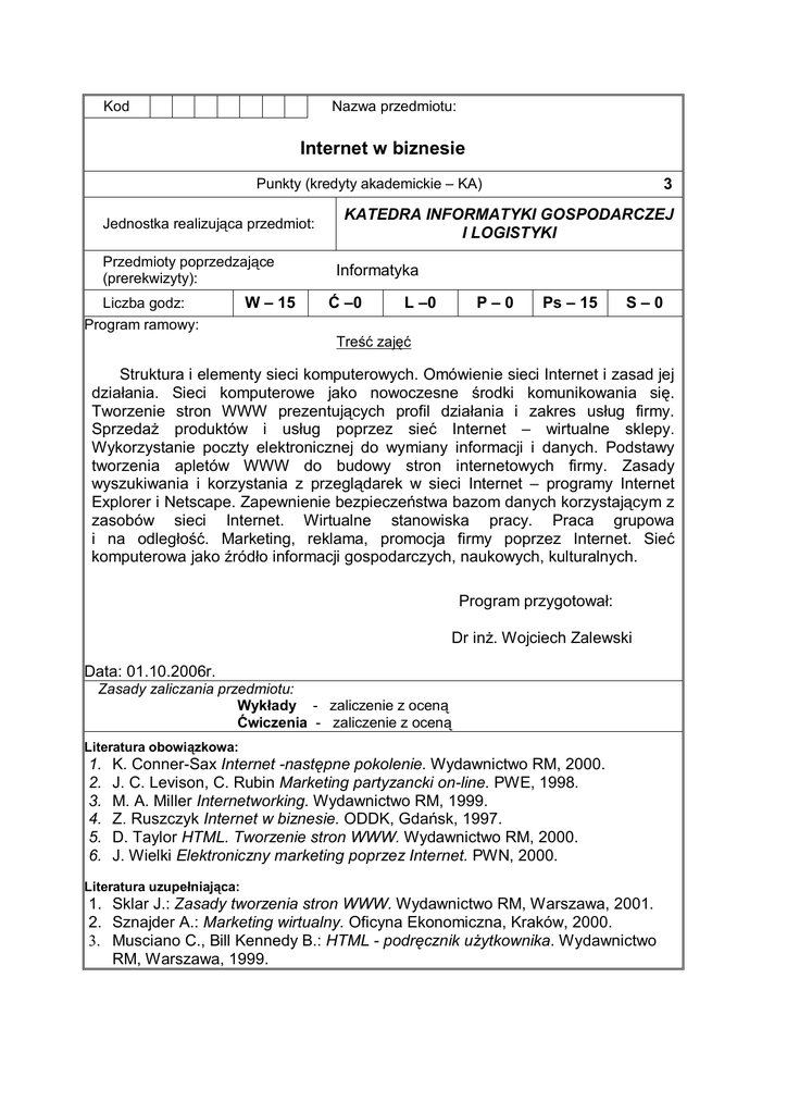 Kod Nazwa przedmiotu: Internet w biznesie 3 Punkty (kredyty akademickie – KA) Jednostka realizująca przedmiot: Przedmioty poprzedzające (prerekwizyty): Liczba godz: W – 15 KATEDRA INFORMATYKI GOSPODARCZEJ I LOGISTYKI Informatyka Ć –0 L –0 P–0 Ps – 15 S–0 Program ramowy: Treść zajęć Struktura i elementy sieci komputerowych. Omówienie sieci Internet i zasad jej działania. Sieci komputerowe jako nowoczesne środki komunikowania się. Tworzenie stron WWW prezentujących profil działania i zakres usług firmy. Sprzedaż produktów i usług poprzez sieć Internet – wirtualne sklepy. Wykorzystanie poczty elektronicznej do wymiany informacji i danych. Podstawy tworzenia apletów WWW do budowy stron internetowych firmy. Zasady wyszukiwania i korzystania z przeglądarek w sieci Internet – programy Internet Explorer i Netscape. Zapewnienie bezpieczeństwa bazom danych korzystającym z zasobów sieci Internet. Wirtualne stanowiska pracy. Praca grupowa i na odległość. Marketing, reklama, promocja firmy poprzez Internet. Sieć komputerowa jako źródło informacji gospodarczych, naukowych, kulturalnych. Program przygotował: Dr inż. Wojciech Zalewski Data: 01.10.2006r. Zasady zaliczania przedmiotu: Wykłady - zaliczenie z oceną Ćwiczenia - zaliczenie z oceną Literatura obowiązkowa: 1. 2. 3. 4. 5. 6. K. Conner-Sax Internet -następne pokolenie. Wydawnictwo RM, 2000. J. C. Levison, C. Rubin Marketing partyzancki on-line. PWE, 1998. M. A. Miller Internetworking. Wydawnictwo RM, 1999. Z. Ruszczyk Internet w biznesie. ODDK, Gdańsk, 1997. D. Taylor HTML. Tworzenie stron WWW. Wydawnictwo RM, 2000. J. Wielki Elektroniczny marketing poprzez Internet. PWN, 2000. Literatura uzupełniająca: 1. Sklar J.: Zasady tworzenia stron WWW. Wydawnictwo RM, Warszawa, 2001. 2. Sznajder A.: Marketing wirtualny. Oficyna Ekonomiczna, Kraków, 2000. 3. Musciano C., Bill Kennedy B.: HTML - podręcznik użytkownika. Wydawnictwo RM, Warszawa, 1999.