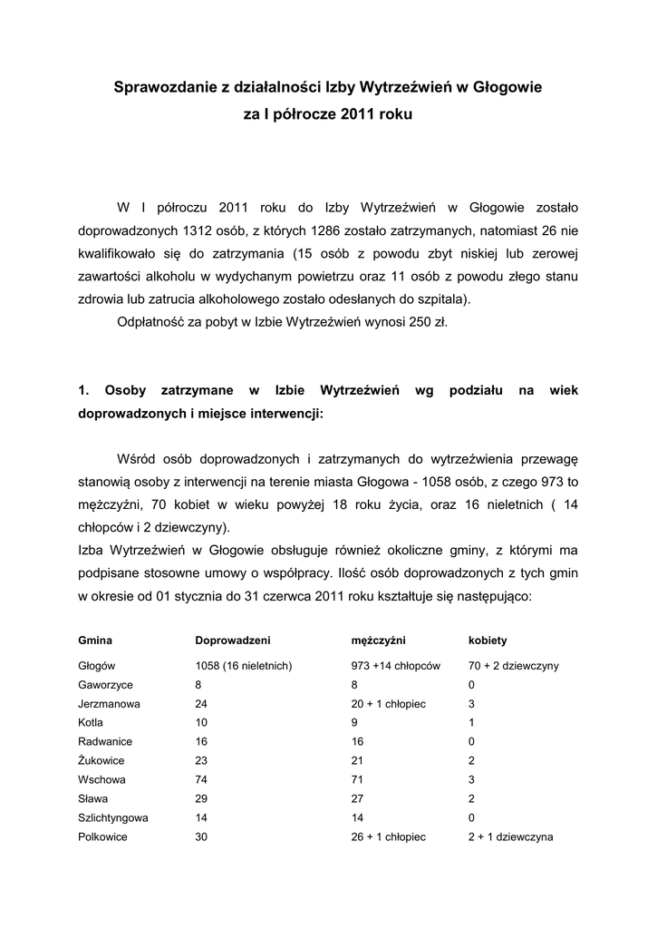Sprawozdanie z działalności Izby Wytrzeźwień w Głogowie za I półrocze 2011 roku W I półroczu 2011 roku do Izby Wytrzeźwień w Głogowie zostało doprowadzonych 1312 osób, z których 1286 zostało zatrzymanych, natomiast 26 nie kwalifikowało się do zatrzymania (15 osób z powodu zbyt niskiej lub zerowej zawartości alkoholu w wydychanym powietrzu oraz 11 osób z powodu złego stanu zdrowia lub zatrucia alkoholowego zostało odesłanych do szpitala). Odpłatność za pobyt w Izbie Wytrzeźwień wynosi 250 zł. 1. Osoby zatrzymane w Izbie Wytrzeźwień wg podziału na wiek doprowadzonych i miejsce interwencji: Wśród osób doprowadzonych i zatrzymanych do wytrzeźwienia przewagę stanowią osoby z interwencji na terenie miasta Głogowa - 1058 osób, z czego 973 to mężczyźni, 70 kobiet w wieku powyżej 18 roku życia, oraz 16 nieletnich ( 14 chłopców i 2 dziewczyny). Izba Wytrzeźwień w Głogowie obsługuje również okoliczne gminy, z którymi ma podpisane stosowne umowy o współpracy. Ilość osób doprowadzonych z tych gmin w okresie od 01 stycznia do 31 czerwca 2011 roku kształtuje się następująco: Gmina Doprowadzeni mężczyźni kobiety Głogów 1058 (16 nieletnich) 973 +14 chłopców 70 + 2 dziewczyny Gaworzyce 8 8 0 Jerzmanowa 24 20 + 1 chłopiec 3 Kotla 10 9 1 Radwanice 16 16 0 Żukowice 23 21 2 Wschowa 74 71 3 Sława 29 27 2 Szlichtyngowa 14 14 0 Polkowice 30 26 + 1 chłopiec 2 + 1 dziewczyna W omawianym okresie osób doprowadzonych do Izby Wytrzeźwień po raz pierwszy było 877, osób przebywających dwukrotnie – 170, natomiast więcej niż dwa razy 239. Osoby przyjęte więcej niż dwukrotnie obligatoryjnie otrzymują wezwanie do Komisji Rozwiązywania Problemów Alkoholowych Gminy Miejskiej Głogów przy Prezydencie Miasta Głogowa. 2. Osoby zatrzymane w Izbie Wytrzeźwień wg podziału na aktywność zawodową. Wśród przebywających w Izbie Wytrzeźwień osób w I połowie 2011 roku największą grupę stanowiły osoby bezrobotne ( 877 osób). Emeryci i renciści stanowili grupę 161 osób, a uczniowie i studenci 35 osób. Wśród osób aktywnych zawodowo 186 osób pracowało na stanowiskach robotniczych, 7 osób na stanowiskach nierobotniczych, a 20 osób prowadziło własną działalność gospodarczą. Oddzielną grupę osób doprowadzanych do Izby Wytrzeźwień stanowią osoby bezdomne. Ilość zatrzymań osób bezdomnych znacząco wzrasta w okresie zimowym między innymi dzięki działaniom prewencyjnym głogowskiej Policji.