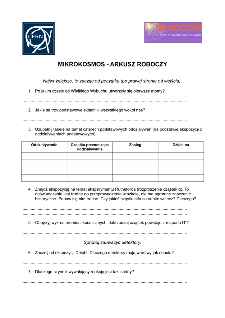 MIKROKOSMOS - ARKUSZ ROBOCZY Najważniejsze, to zacząć od początku (po prawej stronie od wejścia). 1. Po jakim czasie od Wielkiego Wybuchu utworzyły się pierwsze atomy? ............................................................................................................................................... 2. Jakie są trzy podstawowe składniki wszystkiego wokół nas? ............................................................................................................................................... 3. Uzupełnij tabelę na temat czterech podstawowych oddziaływań (na podstawie ekspozycji o oddziaływaniach podstawowych): Oddziaływanie Cząstka przenosząca oddziaływanie Zasięg Działa na 4. Znajdź ekspozycję na temat eksperymentu Rutheforda (rozproszenie cząstek α). To doświadczenie jest trudne do przeprowadzenia w szkole, ale ma ogromne znaczenie historyczne. Pobaw się nim trochę. Czy jakieś cząstki alfa są odbite wstecz? Dlaczego? ............................................................................................................................................... ............................................................................................................................................... 5. Obejrzyj wykres promieni kosmicznych. Jaki rodzaj cząstek powstaje z rozpadu Π+? ............................................................................................................................................... Spróbuj zauważyć detektory. 6. Zacznij od ekspozycji Delphi. Dlaczego detektory mają warstwy jak cebula? ............................................................................................................................................... 7. Dlaczego czynnik wywołujący reakcję jest tak istotny? ............................................................................................................................................... 8. Dlaczego (na podstawie ekspozycji Aleph) magnes otacza detektor? ............................................................................................................................................... 9. Na jakiej zasadzie działa światłowód? ............................................................................................................................................... 10. Na koniec, L3 - jakie cząstki są wykrywane w zewnętrznej warstwie, niewykryte przez poprzednie warstwy? ............................................................................................................................................... Rozpędź się w stronę akceleratorów. 11. Jaki jest cel budowania jeszcze potężniejszych akceleratorów? ............................................................................................................................................... 12. Kto i kiedy zbudował pierwszy akcelerator cząstek? ............................................................................................................................................... 13. Stań na przeciwko pierwszego zbiornika akceleratora liniowego. Dlaczego długość komór dryfowych się zwiększa? ............................................................................................................................................... ............................................................................................................................................... 14. Gdzie w twoim domu znajduje się akcelerator cząstek? ............................................................................................................................................... Zaryzykuj i rusz w stronę ekspozycji Przetwarzanie Danych. 15. Kiedy wynaleziono Internet? ............................................................................................................................................... Zderz się z Wielkim Zderzaczem Hadronów (LHC). 16. Ale na razie zostań na zewnątrz... Jakie cząstki fizycy w CERNie zderzali w latach 90tych i jak nazywało się urządzenie, którego używali? ............................................................................................................................................... 17. Czym jest hadron kiedy jest „u siebie”? ............................................................................................................................................... 18. Wejdź do komnaty czarów! Na jakiej głębokości pod ziemią znajdują się tunele LHC, jaki mają obwód i ile okrążeń wykonują wiązki protonów w ciągu jednej sekundy (zastanów się nad tym...)? ............................................................................................................................................... ............................................................................................................................................... 19. Magnes przed tobą jest podpisany „dipol” - do czego służy? ............................................................................................................................................... 20. Naszkicuj linie pola magnetycznego wokół niego. 21. Jaką istotną właściwość (oprócz wytrzymałości!) muszą mieć elementy podtrzymujące dipole? ............................................................................................................................................... ............................................................................................................................................... 22. Dlaczego rura akceleratora i magnesy są zamknięte w komorze próżniowej? ............................................................................................................................................... 23. Magnes z tyłu jest podpisany „kwadrupol” - do czego jest używany? ......................................................................................