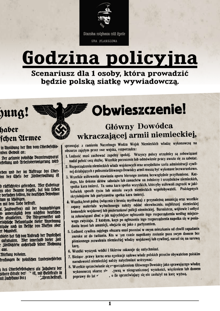 Godzina policyjna Scenariusz dla 1 osoby, która prowadzić będzie polską siatkę wywiadowczą. 1 Godzina policyjna 4 żetony: 2 * kontrola +1 1 * kontrola +2 1 * kontrola +3 Hans Kloss Ingrid Heizer Christianson 9 kart lokacji niemieckich: Jacek Hermann Brunner gestapo kawiarnia urząd zatrudnienia park nadbrzeże kamienica posterunek sądy cmentarz Fritz Kopf Przydzielić dowolnie, w sumie 10 dowodów na polskich agentów. 2 Erik Kopf Stedtke Przydzielić dowolnie kolory umieszczając znaczniki na pieczątkach. Godzina policyjna Żetony te należy nałożyć na Dokument agenta w miejscu niemieckiej pieczątki. Przez całą rozgrywkę kolory te będą na stałe przypisane do poszczególnych agentów. Założenia ogólne W związku z tym, że gra Stawka większa niż życie jest grą przeznaczoną dla 2 osób, a niniejszy scenariusz przeznaczony jest tylko dla jednego gracza, część przepisów musiała zostać zmodyfikowana. Zasady zawarte w niniejszym scenariuszu mają znaczenie nadrzędne nad przepisami z instrukcji załączonej do gry. W grze biorą udział tylko 4 niemieckie żetony zagrożenia kontrola dokumentów (pozostałe nie biorą udziału w grze chyba, że są wprowadzane do rozgrywki z cech specjalnych poszczególnych agentów). W grze nie są także używane karty reakcji! Rozstawienie agentów i żetonów kontrola dokumentów Gracz starannie tasuje utworzoną polską talię kart lokacji. Wybiera pierwszego z agentów (obojętnie której strony) i dobiera wierzchnią kartę lokacji. Ona wskaże pole startowe wybranego agenta. Taką procedurę należy wykonać dla wszystkich agentów uczestniczących w grze. Następnie to samo należy uczynić z czterema żetonami kontrola dokumentów. Po wykonaniu tych czynności użyte karty wracają do talii, którą należy starannie przetasować. Przygotowanie polskich agentów Hans Kloss, Ingrid Heizer, Christianson i Jacek. Bardziej zaawansowani Gracze mogą dowolnie wybrać pozostałych trzech polskich agentów (pamiętając, by każdy agent był innego koloru). Aktywacje polskich i niemieckich agentów W przeciwieństwie do podstawowej wersji gry, w rozgrywce nie biorą udziału karty aktywacji i karty reakcji. Podczas każdego etapu Gracz będzie mógł aktywować i rozdysponowywać Punkty Akcji swoim agentom aż do wyczerpania ich limitów PA, lub do chwili, gdy zechce zakończyć etap. Przed rozpoczęciem rozgrywki Gracz musi przydzielić na niemieckim torze śledztwa 10 dowodów na swoich agentów. Może dokonać dowolnego podziału, nawet obciążyć Klossa 10 dowodami, wybór należy do Gracza. Aktywacja polskich agentów (w związku z obowiązującą godziną policyjną), napotyka na kilka trudności: A.żaden z polskich agentów nie może kończyć swojej aktywacji na polu ulicy z niemieckim agentem. B.jeśli polski agent chce przejść przez pole ulicy, na którym znajduje się niemiecki agent (lub agenci) musi natychmiast rzucić kostkami na swoją czujność. Jeśli test zakończy się sukcesem może bez przeszkód kontynuować swoją aktywację, jeśli test będzie nieudany na torze śledztwa Niemcy otrzymują 2 dowody na tego agenta – a aktywację polskiego agenta należy kontynuować bez przeszkód. C.polscy agenci, którzy uniknęli aresztowania mogą opuszczać sektor, w którym są niemieccy oficerowie SS. UWAGA: jeśli Niemcy zdołają zgromadzić na Hansa Klossa 10 dowodów, przyjmuje się, że as wywiadu został rozpracowany. Od tej chwili staje się on zwyczajnym polskim agentem, który może zostać aresztowany (nawet, gdy Gracz zdoła zmniejszyć ilość dowodów na klossa nie zmieni to już jego sytuacji). Przygotowanie niemieckich agentów Hermann Brunner, Stedtke, Fritz Kopf, Erik Kopf. Ponieważ trzech niemieckich agentów ma kolor czarny, przed rozpoczęciem rozgrywki Gracz musi (wg. własnego wyboru) przydzielić wszystkim niemieckim agentom (za pomocą znaczników TU byłem) kolory: czarny, żółty, niebieski i fioletowy. 3 Godzina policyjna Przygotowanie niemieckich kart lokacji Talię kart lokacji dla strony niemieckiej tworzy z następujących lokacji: gestapo, kawiarnia, urząd zatrudnienia, park, nadbrzeże, kamienica, posterunek, sądy, cmentarz. Starannie je tasuje i kładzie rewersem, aby nie znać kolejności tych kart. Pozostałe karty z talii niemieckiej nie biorą udziału w rozgrywce.Na początku każdego etapu (z wyjątkiem pierwszego etapu), Gracz będzie musiał odsłaniać wierzchnią kartę z talii lokacji niemieckiej i wprowadzić jej efekty karty. Aktywowanie niemieckich agentów Zaraz po zakończeniu aktywacji polskiego agenta Gracz musi poruszyć niemieckiego agenta o tym samym kolorze. Niemiecki agent musi najbliższą drogą zmierzać do najbliższego polskiego agenta, z którym jeszcze nie rozmawiał lub nie próbował aresztować. UWAGA: jeśli w tej samej odległości znajduje się kilku polskich agentów, to Gracz decyduje w kierunku którego będzie się kierował niemiecki agent. Podczas tej aktywacji niemieckich agentów obowiązują następujące zasady: A.agent wykorzystuje zużywa połowę PA ze swojego limitu ¤ (zaokrąglając za pierwszym razem w dół) – lecz nie więcej niż jego limit PA. Przy ewentualnej drugiej aktywacji zużywa on pozostałe mu PA. B.z każdą napotkanym polskim agentem próbuje, kosztem 1 PA inicjować rozmowę lub aresztować (wciąż jednak obowiązuje limit jednej rozmowy na etap tej samej pary agentów). Po rozmowie nie kończy aktywacji, ale nadal wykorzystuje przypisane mu PA. C.jeśli niemiecki agent napotyka polskiego agenta na polu ulicy (z wyjątkiem Klossa , z którym inicjuje rozmowę) natychmiast podejmuje próbę jego aresztowania (ignorując przepis o ograniczeniu w rozmowach i wymaganej ilości dowodów i to działanie nie jest akcją kosztującą 1 PA). D.Jeśli niemiecki agent napotyka polskiego agenta, na którego posiada co najmniej 6 dowodów w dowolnej lokacji, zawsze podejmuje próbę jego aresztowania (ignoruj