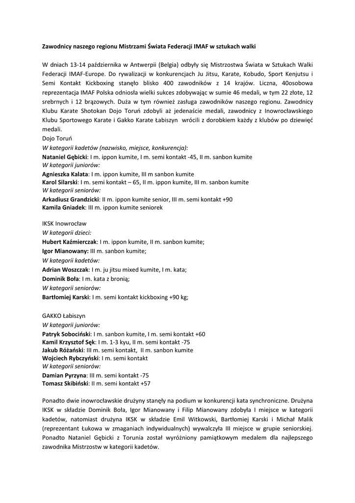 Zawodnicy naszego regionu Mistrzami Świata Federacji IMAF w sztukach walki W dniach 13-14 października w Antwerpii (Belgia) odbyły się Mistrzostwa Świata w Sztukach Walki Federacji IMAF-Europe. Do rywalizacji w konkurencjach Ju Jitsu, Karate, Kobudo, Sport Kenjutsu i Semi Kontakt Kickboxing stanęło blisko 400 zawodników z 14 krajów. Liczna, 40osobowa reprezentacja IMAF Polska odniosła wielki sukces zdobywając w sumie 46 medali, w tym 22 złote, 12 srebrnych i 12 brązowych. Duża w tym również zasługa zawodników naszego regionu. Zawodnicy Klubu Karate Shotokan Dojo Toruń zdobyli aż jedenaście medali, zawodnicy z Inowrocławskiego Klubu Sportowego Karate i Gakko Karate Łabiszyn wrócili z dorobkiem każdy z klubów po dziewięć medali. Dojo Toruń W kategorii kadetów (nazwisko, miejsce, konkurencja): Nataniel Gębicki: I m. ippon kumite, I m. semi kontakt -45, II m. sanbon kumite W kategorii juniorów: Agnieszka Kalata: I m. ippon kumite, III m sanbon kumite Karol Silarski: I m. semi kontakt – 65, II m. ippon kumite, III m. sanbon kumite W kategorii seniorów: Arkadiusz Grandzicki: II m. ippon kumite senior, III m. semi kontakt +90 Kamila Gniadek: III m. ippon kumite seniorek IKSK Inowrocław W kategorii dzieci: Hubert Kaźmierczak: I m. ippon kumite, II m. sanbon kumite; Igor Mianowany: III m. sanbon kumite; W kategorii kadetów: Adrian Woszczak: I m. ju jitsu mixed kumite, I m. kata; Dominik Boła: I m. kata z bronią; W kategorii seniorów: Bartłomiej Karski: I m. semi kontakt kickboxing +90 kg; GAKKO Łabiszyn W kategorii juniorów: Patryk Sobociński: I m. sanbon kumite, I m. semi kontakt +60 Kamil Krzysztof Sęk: I m. 1-3 kyu, II m. semi kontakt -75 Jakub Różański: III m. semi kontakt, II m. sanbon kumite Wojciech Rybczyński: I m. semi kontakt W kategorii seniorów: Damian Pyrzyna: III m. semi kontakt -75 Tomasz Skibiński: II m. semi kontakt +57 Ponadto dwie inowrocławskie drużyny stanęły na podium w konkurencji kata synchroniczne. Drużyna IKSK w składzie Dominik Boła, Igor Mianowany i Filip Mianowany zdobyła I miejsce w kategorii kadetów, natomiast drużyna IKSK w składzie Emil Witkowski, Bartłomiej Karski i Michał Malik (reprezentant Łukowa w zmaganiach indywidualnych) wywalczyła III miejsce w grupie seniorskiej. Ponadto Nataniel Gębicki z Torunia został wyróżniony pamiątkowym medalem dla najlepszego zawodnika Mistrzostw w kategorii kadetów.