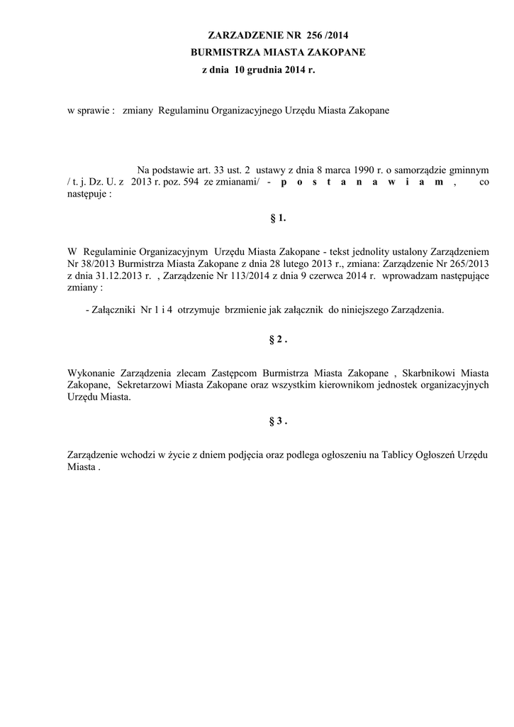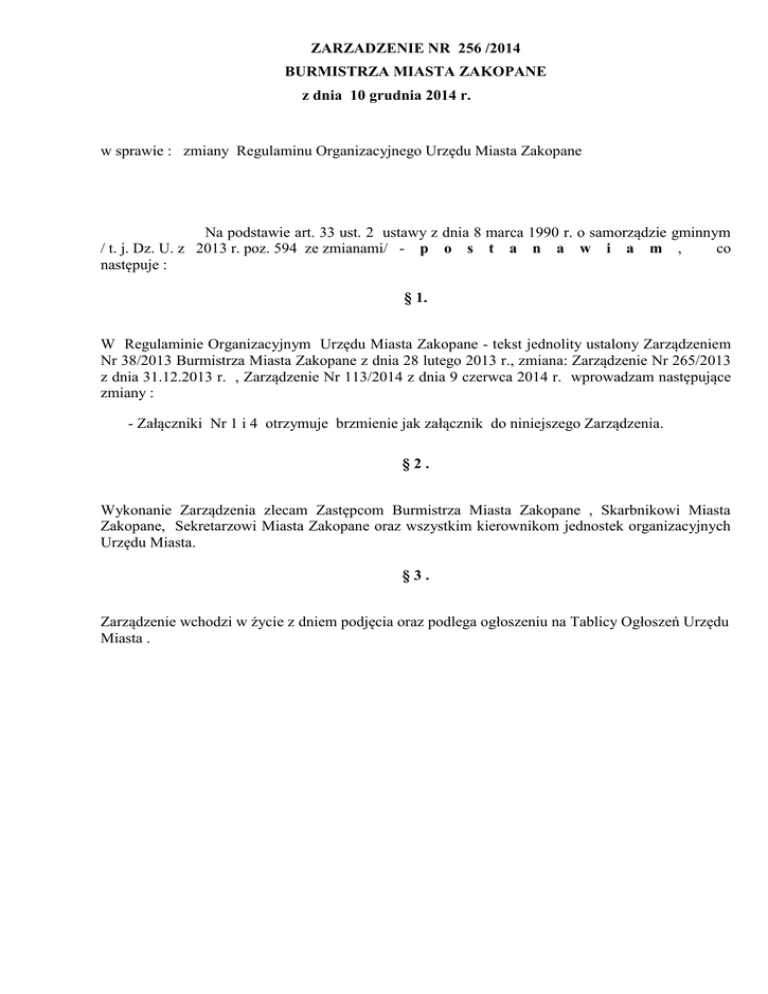 ZARZADZENIE NR 256 /2014 BURMISTRZA MIASTA ZAKOPANE z dnia 10 grudnia 2014 r. w sprawie : zmiany Regulaminu Organizacyjnego Urzędu Miasta Zakopane Na podstawie art. 33 ust. 2 ustawy z dnia 8 marca 1990 r. o samorządzie gminnym / t. j. Dz. U. z 2013 r. poz. 594 ze zmianami/ - p o s t a n a w i a m , co następuje : § 1. W Regulaminie Organizacyjnym Urzędu Miasta Zakopane - tekst jednolity ustalony Zarządzeniem Nr 38/2013 Burmistrza Miasta Zakopane z dnia 28 lutego 2013 r., zmiana: Zarządzenie Nr 265/2013 z dnia 31.12.2013 r. , Zarządzenie Nr 113/2014 z dnia 9 czerwca 2014 r. wprowadzam następujące zmiany : - Załączniki Nr 1 i 4 otrzymuje brzmienie jak załącznik do niniejszego Zarządzenia. §2. Wykonanie Zarządzenia zlecam Zastępcom Burmistrza Miasta Zakopane , Skarbnikowi Miasta Zakopane, Sekretarzowi Miasta Zakopane oraz wszystkim kierownikom jednostek organizacyjnych Urzędu Miasta. §3. Zarządzenie wchodzi w życie z dniem podjęcia oraz podlega ogłoszeniu na Tablicy Ogłoszeń Urzędu Miasta . Załącznik do Zarządzenia Nr 256 /2014 Burmistrza Miasta Zakopane z dnia 10 .12.2014 Załącznik Nr 1 do Regulaminu Organizacyjnego SZCZEGÓŁOWY PODZIAŁ ZADAŃ POMIĘDZY BURMISTRZA, JEGO ZASTĘPCÓW, SEKRETARZA MIASTA I SKARBNIKA MIASTA 1. Burmistrz Miasta kieruje bieżącymi sprawami Miasta, reprezentuje je na zewnątrz oraz sprawuje bezpośredni nadzór nad realizacją zadań objętych zakresem czynności : - Biura Audytu Wewnętrznego i Kontroli - Wydziału Gospodarki Gruntami i Planowania Przestrzennego - Biura ds. Zamówień Publicznych - Pełnomocnika ds. Ochrony Informacji Niejawnych - Miejskiego Zespołu Reagowania - samodzielnego stanowiska pracy Inspektora BHP - Pełnomocnika do spraw Systemu Zarządzania Jakością - Biuro Promocji Zakopanego 2 . I Zastępca Burmistrza Miasta sprawuje bezpośredni nadzór nad realizacją zadań objętych zakresem czynności : - Wydziału Drogownictwa i Transportu - Wydziału Ochrony Środowiska - Wydziału Rozwoju Lokalnego i Inwestycji - Wydział Gospodarki Mieszkaniowej - Straży Miejskiej oraz reprezentuje interesy gminy w : - SEWiK Tatrzańska Komunalna Grupa Kapitałowa Spółka z o.o. - TESKO - Tatrzańska Komunalna Grupa Kapitałowa Spółka z o.o. - Zakopiański TBS - Tatrzańska Komunalna Grupa Kapitałowa Spółka z o.o. - S.A. Przedsiębiorstwo Energetyki Cieplnej "Geotermia Podhalańska " - Spółce Akcyjnej "Polskie Tatry” - Spółce Polskie Koleje Górskie 3. II Zastępca Burmistrza Miasta sprawuje bezpośredni nadzór nad realizacją zadań objętych zakresem czynności : - Wydziału Edukacji, Turystyki i Sportu - Wydziału Kultury i Popularyzacji Zakopanego - Biura Współpracy Europejskiej - samodzielnego stanowiska Miejskiego Konserwatora Zabytków - sprawuje nadzór nad inwestycjami w placówkach oświatowych we współpracy z Wydziałem Rozwoju Lokalnego i Inwestycji oraz nadzoruje działanie następujących jednostek organizacyjnych Miasta: - Miejska Biblioteka Publiczna im. Stefana Żeromskiego - Miejska Galeria Sztuki im Hrabiego Władysława Zamoyskiego - Szkoły Podstawowe nr : 1 , 2, 3, 4, 5, 7, 9 - Gimnazjum nr : 1 , 2, 3 - Zakopiańskie Centrum Edukacji im. Heleny Modrzejewskiej - Przedszkola nr : 3, 7 , 9 - Miejski Ośrodek Sportu i Rekreacji 4. Sekretarz Miasta sprawuje bezpośredni nadzór nad realizacją zadań objętych zakresem czynności : - Wydziału Organizacyjnego - Wydziału Spraw Społecznych i Ewidencji - Biura Rady Miasta - Biura Prawnego - Urzędu Stanu Cywilnego - Biura d.s. Kontaktów z Mediami oraz nadzoruje działanie następujących jednostek organizacyjnych Miasta: - Miejski Ośrodek Pomocy Społecznej oraz sprawuje bieżący nadzór nad pracą - Pełnomocnika do spraw Systemu Zarządzania Jakością - Pełnomocnika Burmistrza ds. Rozwiązywania Problemów Alkoholowych 5. Skarbnik Miasta sprawuje bezpośredni nadzór nad realizacją zadań objętych zakresem czynności: - Wydziału Finansowo-Budżetowego - Wydziału Podatków i Opłat Załącznik do Zarządzenia Nr 256/2014 z dnia 10.12.2014 r. Załącznik nr 4 do Regulaminu Organizacyjnego BURMISTRZ MIASTA ZAKOPANE Leszek DORULA I ZASTĘPCA BURMISTRZA ZASTĘPCA BURMISTRZA Wiktor ŁUKASZCZYK Agnieszka NOWAKGĄSIENICA Wydział Drogownictwa i Transportu Pełnomocnik ds. SZJ Wydział Ochrony Środowiska Wydział Kultury i Popularyzacji Zakopanego Wydział Edukacji, Turystyki i Sportu SEKRETARZ MIASTA Renata SZYCH Biuro Audytu Wewnętrznego i Kontroli KontroliKontroli Wydział Gospodarki Gruntami i Planowania Przestrzennego Biuro ds. Zamówień Publicznych Wydział Rozwoju Lokalnego i Inwestycji Wydział Gospodarki Mieszkaniowej Straż Miejska Biuro Współpracy Europejskiej Miejski Konserwator Zabytków Pełnomocnik ds. Ochrony Informacji Niejawnych Wydział Organizacyjny Biuro Rady Miasta Wydział Spraw Społecznych i Ewidencji Biuro ds. Kontaktów z Mediami Miejski Zespół Reagowania Pełnomocnik ds. SZJ Urząd Stanu Cywilnego Biuro Prawne SKARBNIK MIASTA Helena MAMCARZ Wydział FinansowoBudżetowy Wydział Podatków i Opłat
