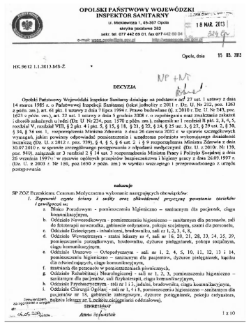OPOLSKI PAŃSTWOWY WOJEWÓDZKI _. INSPEKTOR SANITARNY ..^artt^w^^ ul. Mickiewicza 1,45-367 Opole skrytka pocztowa 262 sekr. tel. 077 442 69 01. fax 077 18 MAR. 2013 Opole, dnia HK.9612.1.1.2013.MS-Ż 15 03. 2013 * DECYZJA L I I Opolski Państwowy Wojewódzki Inspektor Sanitarny działając na podstawie art! 27 ust. 1 ustawy z dnia 14 marca 1985 r. o Państwowej Inspekcji Sanitarnej (tekst jednolity z 2011 r. Dz. U. Nr 212, poz. 1263 z późn. zm.), art. 61 pkt. 1 ustawy z dnia 7 lipca 1994 r. Prawo budowlane (tj. z 2010 r. Dz. U. Nr 243, poz. 1623 z późn. zm.), art. 22 ust 1 ustawy z dnia 5 grudnia 2008 r. o zapobieganiu oraz zwalczaniu zakażeń i chorób zakaźnych u ludzi (Dz. U. Nr 234, poz. 1570 z późn. zm.), załącznik nr 1 rozdział II pkt. 2 , 3 , 4 , 5, rozdział V, rozdział VIII, § 2 pkt. 4 i pkt. 5, § 15, § 18, § 21, § 22, § 24, § 25 ust. 3, § 27, § 29 ust. 2, § 30, § 34, § 36 ust. 1, rozporządzenia Ministra Zdrowia z dnia 26 czerwca 2012 r. w sprawie szczegółowych wymagań, jakim powinny odpowiadać pomieszczenia i urządzenia podmiotu wykonującego działalność leczniczą (Dz. U. z 2012 r. poz. 739), § 4, § 5, § 6 ust. 2 i § 9 rozporządzenia Ministra Zdrowia z dnia 30.07.2010 r. w sprawie szczegółowego postępowania z odpadami medycznymi (Dz. U. z 2010r. Nr 139, poz. 940), załącznik nr 3 rozdział 2 § 14 ust. 3 rozporządzenia Ministra Pracy i Polityki Socjalnej z dnia 26 września 1997ir.' w sprawie ogólnych przepisów bezpieczeństwa i higieny pracy z dnia 26.09.1997 r. (Dz. U. z 2003 r. Nr 169, poz. 1650 z późn. zm.) w wyniku wszczętego i przeprowadzonego z urzędu postępowania nakazuje SP ZOZ Brzeskiemu Centrum Medycznemu wykonanie następujących obowiązków: 1. Zapewnić czyste ściany i sufity oraz zlikwidować przyczynę powstania zacieków i zawilgoceń w: a. Bloku Porodowym - pomieszczeniu higieniczno - sanitarnym dla pacjentek, ciągu komunikacyjnym, b. Oddziale Noworodkowym - pomieszczeniu higieniczno - sanitarnym dla personelu, sali do fototerapii noworodka, gabinecie ordynatora, pokoju socjalnym, szatni dla personelu, c. Oddziale Dziecięcym - inhalatorni, brudowniku, sali nr 1,2, 3,4, 8, d. Oddziale Wewnętrznym - szatni lekarzy nr 4, sali nr 16, 20, 21, 28, 33, 34, 35, 39, pomieszczeniu porządkowym, brudowniku, dyżurce pielęgniarek, pokoju socjalnym, ciągu komunikacyjnym, e. Oddziale Urazowo — Ortopedycznym - sali nr 1, 2, 4, 5, 10, 11, 12, 13 i 14, pomieszczeniu higieniczno - sanitarnym dla pacjentów, dyżurce pielęgniarek, kąciku dla odwiedzających, ciągu komunikacyjnym, f. szatniach dla personelu w pomieszczeniach piwnicznych, g. Oddziale Rehabilitacji Neurologicznej - sali nr 1, 2, 3, pomieszczeniu higieniczno sanitarnym dla pacjentów, sali fizykoterapii, ciągu komunikacyjnym, h. Oddziale Psychiatrycznym - sali nr 1 i 3, jadalni, brudowniku, ciągu komunikacyjnym, i. Oddziale Chirurgii Ogólnej - sali nr 1,4 i 8, pomieszczeniu higieniczno - sanitarnym dla pacjentów nr 18, gabinecie zabiegowym, dyżurce pielęgniarek, pokoju ordynatora, Potwierdzam, B ^ o j u lekajzYjK-^mtóliu-tjk^gniarki oddziałowej, za zgodność z orygmi str •• SEKRETARIAT .... ofe.oS-SĄidpto.. Anfm ?olwisU k 1 z 10 j. Oddziale Otolaryngologicznym - gabinecie pielęgniarskim, klatce schodowej ewakuacyjnej, k. Oddziale Ginekologiczno — Położniczym - sali nr 3 - 5, 13, 14, 15, 16, 17, sali pooperacyjnej nr 21, pomieszczeniu higieniczno - sanitarnym dla pacjentek, ciągu komunikacyjnym. 2. Zapewnić właściwy stan sanitarno - techniczny stolarki drzwiowej i futryn w: a. Oddziale Chirurgii Ogólnej - sali nr 2 - 6, 8, 9 i 32, pomieszczeniu higieniczno sanitarnym dla pacjentów nr 18, pokoju lekarzy nr 7, pokoju pielęgniarki oddziałowej, pokoju socjalnym pielęgniarek, b. Oddziale Otolaryngologicznym - wszystkich salach chorych, gabinecie zabiegowym, gabinecie lekarskim, c. Oddziale Ginekologiczno — Położniczym - sali nr 3 — 5, 13, 14, 15, 16, 22, sali pooperacyjnej nr 21, gabinecie zabiegowym septycznym, dyżurce położnych, pokoju socjalnym, dyżurce lekarskiej, d. Oddziale Wewnętrznym - sali nr 16, 20 - 22, 28, 33 - 35, 37 - 39, pomieszczeniu higieniczno - sanitarnym (męskim), gabinecie zabiegowym, pomieszczeniu porządkowym, brudowniku, dyżurce pielęgniarek (część żeńska i męska), pokoju pielęgniarki oddziałowej nr 18, pokoju socjalnym, gabinecie lekarskim, pro morte, e. Oddziale Urazowo — Ortopedycznym - wszystkich salach chorych, pomieszczeniu higieniczno — sanitarnym dla pacjentów, gabinecie zabiegowym, brudowniku, pokoju pielęgniarki oddziałowej, f. Oddziale Rehabilitacji Neurologicznej - wszystkich salach chorych, g. Oddziale Psychiatrycznym - sali nr 1 i 3, jadalni, h. budynku szpitala przy ulicy Nysańskiej - drzwi wejściowe. O 3. Zapewnić odpowiedni stan sanitarno — techniczny: a. rury kanalizacyjnej w brudowniku w Oddziale: -"Urazowo — Ortopedycznym, 4 - Dziecięcym, b. parapetów w: - Oddziale Dziecięcym - sali obserwacyjnej (naprzeciwko dyżurki), .. Lfl - Oddziale Otolaryngologicznym — gabinecie zabiegowym nr 2, X c. mebli stanowiących wyposażenie: - Oddziału Chirurgii Ogólnej, - Oddziału Urazowo - Ortopedycznego, - Oddziału Ginekologiczno — Położniczego, - Oddziału Noworodkowego, - Oddziału Dziecięcego, - Oddziału Wewnętrznego, - Oddziału Rehabilitacji Neurologicznej, - Oddziału Psychiatrycznego, - szatni dla personelu w pomieszczeniach piwnicznych, d. kafli ściennych i podłogowych w: - Oddziale Chirurgii Ogólnej - pomieszczeniu higieniczno - sanitarnym dla pacjentów nr 18, - Oddziale Dziecięcym - sali nr 4 (przy urządzeniu sanitarnym), - Oddziale Urazowo — Ortopedycznym - sali septycznej, brudowniku, - Oddziale Psychiatrycznym - pomieszczeniu higieniczno - sanitarnym dla pacjentów (WC). 4. Usunąć pozostałości rur grzewczych w podłodze, . tworzące prześwity pomiędzy kondygnacjami na ewakuacyjnej klatce schodowej (od parteru do IVpiętra). 5.