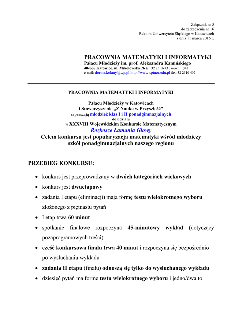 Załącznik nr 5 do zarządzenia nr 16 Rektora Uniwersytetu Śląskiego w Katowicach z dnia 11 marca 2016 r. PRACOWNIA MATEMATYKI I INFORMATYKI Pałacu Młodzieży im. prof. Aleksandra Kamińskiego 40-066 Katowice, ul. Mikołowska 26 tel. 32 25 16 431 wewn. 1343 e-mail: [email protected] http://www.spinor.edu.pl fax: 32 2510 402 PRACOWNIA MATEMATYKI I INFORMATYKI Pałacu Młodzieży w Katowicach i Stowarzyszenie „Z Nauka w Przyszłość” zapraszają młodzież klas I i II ponadgimnazjalnych do udziału w XXXVIII Wojewódzkim Konkursie Matematycznym Rozkosze Łamania Głowy Celem konkursu jest popularyzacja matematyki wśród młodzieży szkół ponadgimnazjalnych naszego regionu PRZEBIEG KONKURSU: konkurs jest przeprowadzany w dwóch kategoriach wiekowych konkurs jest dwuetapowy zadania I etapu (eliminacji) maja formę testu wielokrotnego wyboru złożonego z piętnastu pytań I etap trwa 60 minut spotkanie finałowe rozpoczyna 45-minutowy wykład (dotyczący pozaprogramowych treści) cześć konkursowa finału trwa 40 minut i rozpoczyna się bezpośrednio po wysłuchaniu wykładu zadania II etapu (finału) odnoszą się tylko do wysłuchanego wykładu dziesięć pytań ma formę testu wielokrotnego wyboru i jedno/dwa to zadanie otwarte UDZIAŁ W KONKURSIE JEST DOBROWOLNY!!! Serdecznie zapraszamy . REGULAMIN KONKURSU . Zasady ogólne: Eliminacje konkursu odbywają się jednocześnie w dwóch miejscach o IV LO im. St. Staszica w Sosnowcu, dla uczestników z regionu Zagłębia Dąbrowskiego o Instytut Matematyki UŚ w Katowicach dla pozostałych uczestników konkursu Warunkiem uczestnictwa w konkursie jest pisemne (najlepiej poczta elektroniczna) zgłoszenie uczestnika i uiszczenie opłaty w wysokości 10 zł od osoby Nie ograniczamy liczby uczestników ze szkoły Prosimy o dokonywanie zbiorczych opłat z danej szkoły. W zgłoszeniu należy podać: o imiona, nazwiska oraz klasę (I lub II) uczestników o miejsce przystąpienia do eliminacji o nazwę i adres szkoły oraz telefon, fax, e-mail szkoły o imię i nazwisko nauczyciela matematyki o dołączyć kopie lub skan dowodu wpłaty Konkurs jest konkursem indywidualnym Uczniowie kl. I rozwiązują zadania o numerach od 1 do 15, zaś uczniowie kl. II – zadania o numerach od 6 do 20 Do każdego zadania są trzy warianty odpowiedzi, z których każdą może być prawdziwa lub fałszywa. Otrzymane w dniu eliminacji zestawy zadań uczestnicy zabierają ze sobą. Oddawane są wyłącznie czytelnie wypełnione karty odpowiedzi W dniu eliminacji pół godziny przed rozpoczęciem konkursu będą wywieszone alfabetyczne listy uczestników z ich numerami startowymi w budynku Instytutu Matematyki Uniwersytetu Śląskiego 213 (dla uczestników przystępujących do eliminacji w Katowicach) oraz w IV LO im. Stanisława Staszica w Sosnowcu (dla uczestników przystępujących do eliminacji w Sosnowcu) Jeśli szkoła zgłosi ucznia, który z przyczyn losowych nie może wziąć udziału w eliminacjach konkursu – jego miejsce może zająć inny uczeń tej szkoły Informacje o zakwalifikowaniu się uczestników do finału zostaną opublikowane na naszej stronie internetowej www.spinor.edu.pl najpóźniej w piątek, 5 lutego 2016r.. Kalendarz konkursu: Zgłoszenia do udziału w konkursie prosimy kierować na adres Pracowni Matematyki i Informatyki Pałacu Młodzieży do dnia 13 stycznia 2016r. włącznie Nie przyjmujemy zgłoszeń telefonicznie Każde zgłoszenie otrzymane poczta elektroniczna potwierdzamy rak potwierdzenia oznacza, ze zgłoszenie do nas nie dotarło. Prosimy wówczas o kontakt z nami i ponowne przesłanie zgłoszenia Eliminacje odbędą się 21 stycznia 2016 (czwartek) o godz. 12:30 pod adresem: o Instytut Matematyki ul. Bankowa 14, Katowice o IV LO im. Stanisława Staszica, pl. Zillingera 1, Sosnowiec Prosimy o przybycie z 15-minutowym wyprzedzeniem Finał konkursu odbędzie się w marcu w ramach Święta Liczby Pi (14-15.03.2016) w Instytucie Matematyki Uniwersytetu Śląskiego Uroczyste wręczenie nagród nastąpi podczas uroczystości zakończenia tegorocznego Święta Liczby Pi. Zasady oceniania: W teście wyboru uczestnik powinien stwierdzić, czy każda z trzech podanych odpowiedzi (a, b, c) jest poprawna, czy nie, pisząc odpowiednio TAK lub NIE Za każdą poprawna odpowiedz TAK/NIE uczestnik otrzymuje +1 punkt. Jeśli wszystkie trzy odpowiedzi do danego zadania są poprawne – dodatkowo otrzymuje jeszcze jeden punkt (maksymalnie za zadanie można uzyskać +4 punkty) Za każdą niepoprawna odpowiedz TAK/NIE uczestnik otrzymuje -1 punkt (minimalna punktacja za jedno zadanie wynosi wiec -3 punkty) Jeśli uczestnik przy którymkolwiek podpunkcie a, b, c, nie udzieli odpowiedzi – otrzymuje za ten podpunkt 0 punktów Wynik testu eliminacyjnego jest suma punktów otrzymanych z wszystkich zadań. Jest wiec liczba z przedziału od -45 do 60 Test finałowy oceniany jest w taki sam sposób Za zadania otwarte można uzyskać maksymalnie 10 (nie ma punktów ujemnych) Nasz adres: Pracownia Matematyki i Informatyki Pałac Młodzieży ul. Mikołowska 26 40-066 Katowice tel.: 32 2516 431 wewn. 1343 w godz. 15:30 –18 00 www.spinor.edu.pl mail: [email protected] Dane Stowarzyszenia: Stowarzyszenie „Z Nauką w Przyszłość” mBank 78 1140 2017 0000 4502 1197 1712 koniecznie z dopiskiem Przygoda z Matematyką Zasady przyznawania nagród w konkursie „Rozkosze łamania głowy” 1. Wysłanie zgłoszenia do udziału w konkursie jest równoznaczne z akceptacją jego regulaminu oraz zasad przyznawania nagród. 2. Nagrody w konkursie otrzyma dziesięciu najlepszych uczestników (po pięciu w każdej kategorii wiekowej). 3. Dwóch zwycięzców konkursu otrzyma nagrody rzeczowe o wartości do 100 zł każda. 4. Dwóch zdobywców drugiego miejsca otrzyma nagrody rzeczowe o wartości do 80 zł każda. 5. Dwóch zdobywców trzeciego miejsca otrzyma nagrody rzeczowe o wartości do 40 zł każda. 6. Czterech zdobywców wyróżnienia otrzyma nagrody
