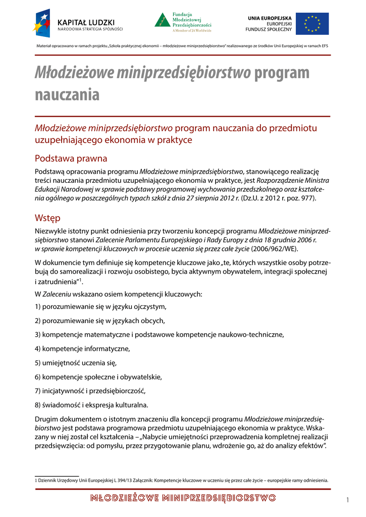 Materiał opracowano w ramach projektu „Szkoła praktycznej ekonomii – młodzieżowe miniprzedsiębiorstwo” realizowanego ze środków Unii Europejskiej w ramach EFS Młodzieżowe miniprzedsiębiorstwo program nauczania Młodzieżowe miniprzedsiębiorstwo program nauczania do przedmiotu uzupełniającego ekonomia w praktyce Podstawa prawna Podstawą opracowania programu Młodzieżowe miniprzedsiębiorstwo, stanowiącego realizację treści nauczania przedmiotu uzupełniającego ekonomia w praktyce, jest Rozporządzenie Ministra Edukacji Narodowej w sprawie podstawy programowej wychowania przedszkolnego oraz kształcenia ogólnego w poszczególnych typach szkół z dnia 27 sierpnia 2012 r. (Dz.U. z 2012 r. poz. 977). Wstęp Niezwykle istotny punkt odniesienia przy tworzeniu koncepcji programu Młodzieżowe miniprzedsiębiorstwo stanowi Zalecenie Parlamentu Europejskiego i Rady Europy z dnia 18 grudnia 2006 r. w sprawie kompetencji kluczowych w procesie uczenia się przez całe życie (2006/962/WE). W dokumencie tym definiuje się kompetencje kluczowe jako „te, których wszystkie osoby potrzebują do samorealizacji i rozwoju osobistego, bycia aktywnym obywatelem, integracji społecznej i zatrudnienia”1. W Zaleceniu wskazano osiem kompetencji kluczowych: 1) porozumiewanie się w języku ojczystym, 2) porozumiewanie się w językach obcych, 3) kompetencje matematyczne i podstawowe kompetencje naukowo-techniczne, 4) kompetencje informatyczne, 5) umiejętność uczenia się, 6) kompetencje społeczne i obywatelskie, 7) inicjatywność i przedsiębiorczość, 8) świadomość i ekspresja kulturalna. Drugim dokumentem o istotnym znaczeniu dla koncepcji programu Młodzieżowe miniprzedsiębiorstwo jest podstawa programowa przedmiotu uzupełniającego ekonomia w praktyce. Wskazany w niej został cel kształcenia – „Nabycie umiejętności przeprowadzenia kompletnej realizacji przedsięwzięcia: od pomysłu, przez przygotowanie planu, wdrożenie go, aż do analizy efektów”. 1 Dziennik Urzędowy Unii Europejskiej L 394/13 Załącznik: Kompetencje kluczowe w uczeniu się przez całe życie – europejskie ramy odniesienia. MŁODZIEŻOWE MINIPRZEDSIĘBIORSTWO 1 Materiał opracowano w ramach projektu „Szkoła praktycznej ekonomii – młodzieżowe miniprzedsiębiorstwo” realizowanego ze środków Unii Europejskiej w ramach EFS Zalecaną metodą realizacji tego celu jest metoda projektu. Te dwie przesłanki – konieczność wyposażania uczniów w kompetencje kluczowe będące podstawą sukcesów życiowych każdego człowieka oraz zalecany w podstawie programowej cel i proponowana metoda – spowodowały, że program koncentruje się na kształtowaniu kompetencji inicjatywność i przedsiębiorczość. Taki wybór otwiera szeroką perspektywę dla realizacji celu „nabycie umiejętności przeprowadzenia kompletnej realizacji przedsięwzięcia” oraz wdrażania do praktyki edukacyjnej metody projektu. Kompetencje inicjatywność i przedsiębiorczość oznaczają zdolność osoby do wcielania pomysłów w czyn. Obejmują one kreatywność, innowacyjność podejmowanie ryzyka, a także zdolność do planowania przedsięwzięć i osiągania zamierzonych celów. Kształtowanie kompetencji rekomendowanych w Zaleceniu – wymaga od szkoły wyjścia poza schemat: zadane, wyuczone, sprawdzone. Uczniowie muszą być stawiani w sytuacjach problemowych. Rozwiązując je samodzielnie, będą doskonalić umiejętności i kształtować oczekiwane postawy. Z tego powodu w programie Młodzieżowe miniprzedsiębiorstwo główny akcent przeniesiono ze zdobywania wiadomości na kształtowanie umiejętności, pobudzanie ucznia do aktywności, a także samodzielnego i kreatywnego myślenia. Nadrzędną rolę przypisano zatem celom kształcenia i wychowania, które w całym procesie edukacyjnym są wyznacznikiem treści nauczania, służących osiąganiu tychże celów. Wynika stąd ważna cecha programu – położenie nacisku na nauczanie przez działanie z zastosowaniem metody projektu. Realizacja zawartych w programie treści nauczania odbywa się w formie gry edukacyjnej Młodzieżowe miniprzedsiębiorstwo. Jej istotą jest założenie i prowadzenie w szkole realnie działającej firmy – młodzieżowego miniprzedsiębiorstwa – zorganizowanego na wzór spółki jawnej, w której uczniowie wytwarzają i sprzedają gotowe produkty lub świadczą usługi. Niniejszy program został tak skonstruowany, aby nauczyciel wykorzystał w pełnym zakresie wiadomości i umiejętności zdobyte przez uczniów na wcześniejszych etapach edukacyjnych, w tym również na zajęciach z podstaw przedsiębiorczości. Konstrukcja programu daje możliwość elastycznego doboru szczegółowych celów edukacyjnych w zależności od różnych warunków realizacji programu oraz zróżnicowanych potrzeb edukacyjnych uczniów. Cele kształcenia i wychowania Podstawa programowa kształcenia ogólnego na III i IV etapie edukacyjnym przewiduje realizację następujących celów: ss „przyswojenie przez uczniów określonego zasobu wiadomości na temat faktów, zasad, teorii i praktyk; ss zdobycie przez uczniów umiejętności wykorzystania posiadanych wiadomości podczas wykonywania zadań i rozwiązywania problemów; ss kształtowanie u uczniów postaw warunkujących sprawne i odpowiedzialne funkcjonowanie we współczesnym świecie”. Program Młodzieżowe miniprzedsiębiorstwo uwzględnia wszystkie wskazane w podstawie programowej obszary wiedzy, umiejętności i postaw, jak również pomaga w zdobyciu wiedzy niezbędnej do podejmowania i prowadzenia samodzielnej działalności gospodarczej. Dobór zagadnień proponowanych w programie umożliwia realizację treści nauczania – wymagań szczegółowych przedmiotu ekonomia w praktyce. Niektóre z zagadnień wykraczają poza podstawę programo2 MŁODZIEŻOWE MINIPRZEDSIĘBIORSTWO Materiał opracowano w ramach projektu „Szkoła praktycznej ekonomii – młodzieżowe minipr