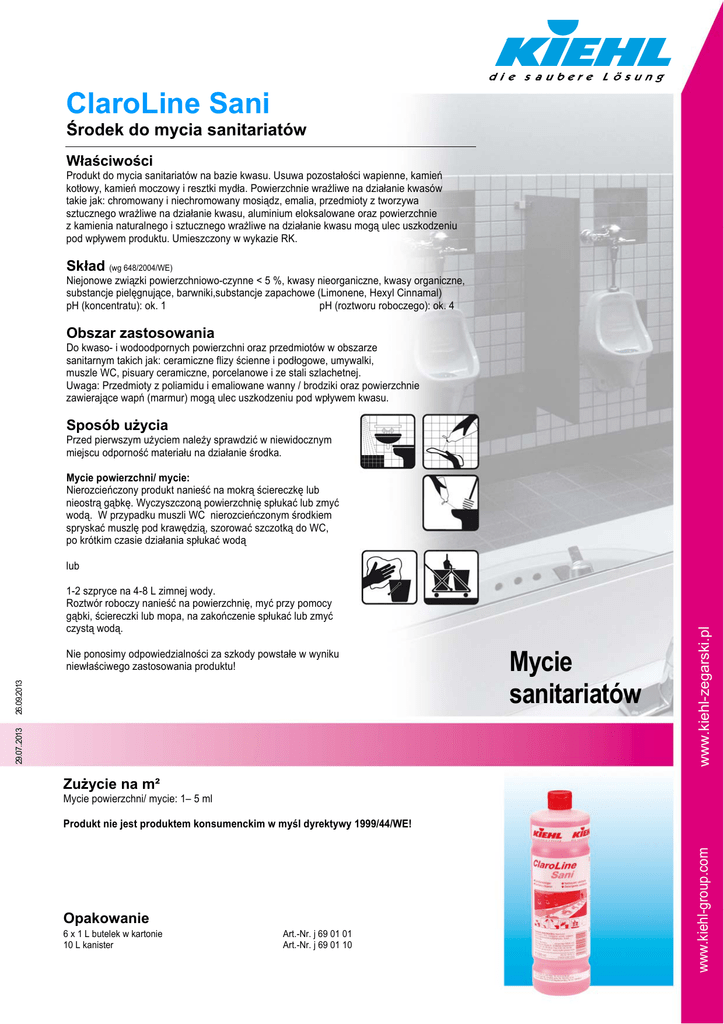ClaroLine Sani Środek do mycia sanitariatów Właściwości Produkt do mycia sanitariatów na bazie kwasu. Usuwa pozostałości wapienne, kamień kotłowy, kamień moczowy i resztki mydła. Powierzchnie wrażliwe na działanie kwasów takie jak: chromowany i niechromowany mosiądz, emalia, przedmioty z tworzywa sztucznego wrażliwe na działanie kwasu, aluminium eloksalowane oraz powierzchnie z kamienia naturalnego i sztucznego wrażliwe na działanie kwasu mogą ulec uszkodzeniu pod wpływem produktu. Umieszczony w wykazie RK. Skład (wg 648/2004/WE) Niejonowe związki powierzchniowo-czynne < 5 %, kwasy nieorganiczne, kwasy organiczne, substancje pielęgnujące, barwniki,substancje zapachowe (Limonene, Hexyl Cinnamal) pH (koncentratu): ok. 1 pH (roztworu roboczego): ok. 4 Obszar zastosowania Do kwaso- i wodoodpornych powierzchni oraz przedmiotów w obszarze sanitarnym takich jak: ceramiczne flizy ścienne i podłogowe, umywalki, muszle WC, pisuary ceramiczne, porcelanowe i ze stali szlachetnej. Uwaga: Przedmioty z poliamidu i emaliowane wanny / brodziki oraz powierzchnie zawierające wapń (marmur) mogą ulec uszkodzeniu pod wpływem kwasu. Sposób użycia Przed pierwszym użyciem należy sprawdzić w niewidocznym miejscu odporność materiału na działanie środka. Mycie powierzchni/ mycie: Nierozcieńczony produkt nanieść na mokrą ściereczkę lub nieostrą gąbkę. Wyczyszczoną powierzchnię spłukać lub zmyć wodą. W przypadku muszli WC nierozcieńczonym środkiem spryskać muszlę pod krawędzią, szorować szczotką do WC, po krótkim czasie działania spłukać wodą 1-2 szpryce na 4-8 L zimnej wody. Roztwór roboczy nanieść na powierzchnię, myć przy pomocy gąbki, ściereczki lub mopa, na zakończenie spłukać lub zmyć czystą wodą. 29.07..2013 26.09.2013 Nie ponosimy odpowiedzialności za szkody powstałe w wyniku niewłaściwego zastosowania produktu! Mycie sanitariatów www.kiehl-zegarski.pl lub Zużycie na m² Mycie powierzchni/ mycie: 1– 5 ml Opakowanie 6 x 1 L butelek w kartonie 10 L kanister Art.-Nr. j 69 01 01 Art.-Nr. j 69 01 10 www.kiehl-group.com Produkt nie jest produktem konsumenckim w myśl dyrektywy 1999/44/WE!