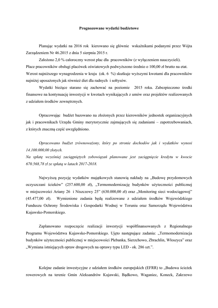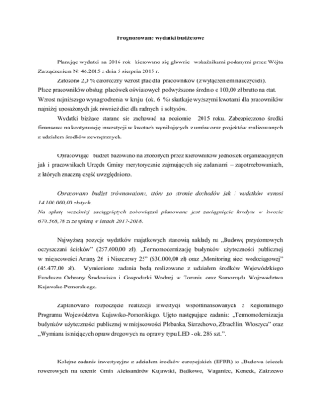 Prognozowane wydatki budżetowe Planując wydatki na 2016 rok kierowano się głównie wskaźnikami podanymi przez Wójta Zarządzeniem Nr 46.2015 z dnia 5 sierpnia 2015 r. Założono 2,0 % całoroczny wzrost płac dla pracowników (z wyłączeniem nauczycieli). Płace pracowników obsługi placówek oświatowych podwyższono średnio o 100,00 zł brutto na etat. Wzrost najniższego wynagrodzenia w kraju (ok. 6 %) skutkuje wyższymi kwotami dla pracowników najniżej uposażonych jak również diet dla radnych i sołtysów. Wydatki bieżące starano się zachować na poziomie 2015 roku. Zabezpieczono środki finansowe na kontynuację inwestycji w kwotach wynikających z umów oraz projektów realizowanych z udziałem środków zewnętrznych. Opracowując budżet bazowano na złożonych przez kierowników jednostek organizacyjnych jak i pracownikach Urzędu Gminy merytorycznie zajmujących się zadaniami – zapotrzebowaniach, z których znaczną część uwzględniono. Opracowano budżet zrównoważony, który po stronie dochodów jak i wydatków wynosi 14.100.000,00 złotych. Na spłatę wcześniej zaciągniętych zobowiązań planowane jest zaciągnięcie kredytu w kwocie 670.568,78 zł ze spłatą w latach 2017-2018. Najwyższą pozycję wydatków majątkowych stanowią nakłady na „Budowę przydomowych oczyszczani ścieków” (257.600,00 zł), „Termomodernizację budynków użyteczności publicznej w miejscowości Ariany 26 i Niszczewy 25” (630.000,00 zł) oraz „Monitoring sieci wodociągowej” (45.477,00 zł). Wymienione zadania będą realizowane z udziałem środków Wojewódzkiego Funduszu Ochrony Środowiska i Gospodarki Wodnej w Toruniu oraz Samorządu Województwa Kujawsko-Pomorskiego. Zaplanowano rozpoczęcie realizacji inwestycji współfinansowanych z Regionalnego Programu Województwa Kujawsko-Pomorskiego. Ujęto następujące zadania: „Termomodernizacja budynków użyteczności publicznej w miejscowości Plebanka, Sierzchowo, Zbrachlin, Włoszyca” oraz „Wymiana istniejących opraw drogowych na oprawy typu LED - ok. 286 szt.”. Kolejne zadanie inwestycyjne z udziałem środków europejskich (EFRR) to „Budowa ścieżek rowerowych na terenie Gmin Aleksandrów Kujawski, Bądkowo, Waganiec, Koneck, Zakrzewo i Raciążek”. Realizującym zadanie będzie Związek Gmin Ziemi Kujawskiej zs. w Aleksandrowie Kujawskim. W budżecie Gminy Waganiec zaplanowano 15,0 % udział własny gminy w wysokości 147.060,00 zł. Ujęto kwotę na kontynuację adaptacji i rozbudowy budynku na Centrum Rozwoju Lokalnego i Ekologicznego w Wólnem, budowę placów zabaw w Niszczewach i Sierzchowie; budowę linii oświetleniowych w m. Nowy Zbrachlin, Konstantynowo, Brudnowo, Siutkowo, Przypust i Waganiec Osiedle. Zaplanowano remont budynku oczyszczalni ścieków w Wójtówce oraz zakup urządzeń, jak również sprzętu do utrzymania dróg gminnych. Będą kontynuowane prace związanych z budową odcinków sieci wodociągowej jak również budową chodnika w m. Zbrachlin i rozgraniczaniem dróg gminnych, jako punktu wyjścia do dalszych prac inwestycyjnych. Ujęto kwoty na sporządzenie projektu świetlicy oraz projektu boiska wielofunkcyjnego. Zaplanowano kwotę 120.000,00 zł jako „Dofinansowanie wykonania nawierzchni drogi powiatowej Nr 2615C Waganiec-Zbrachlin na dł. ok. 1800 mb” oraz 21.700,00 zł również jako „Dofinansowanie utwardzenia ciągu pieszego w ciągu drogi powiatowej Nr 2618C SpoczynekZbrachlin w miejscowości Zbrachlin na dł. ok. 350 mb”. Kwoty zostaną przekazane do Starostwa Powiatowego w Aleksandrowie Kujawskim w formie pomocy finansowej, po podjęciu przez Radę Gminy stosownych uchwał. Zgodnie z decyzją Rady Gminy zaplanowano kwoty na realizację przedsięwzięć w ramach Funduszu Sołeckiego na łączną kwotę 290.165,88 zł (załącznik nr 8 do zarządzenia). W ramach wydatków bieżących uwzględniono opłaty za umieszczenie urządzeń kanalizacyjnych w pasie dróg powiatowych. Zaplanowano środki na remonty dróg gminnych, chodników w m. Waganiec i Plebanka, profilowanie, oświetlenie uliczne oraz remont sprzętu komunalnego, eksploatację kompleksu na boisku sportowym w Zbrachlinie, terenów zielonych w Zbrachlinie, Wagańcu i Plebance. Zagwarantowano kwoty na drobne remonty budynków komunalnych jak również środki na pokrycie kosztów utrzymania zwierząt w schronisku. Zabezpieczono kwoty na rozpoczęcie opracowywania studium i kierunków zagospodarowania przestrzennego gminy. Przewidziano również kwotę na opracowanie studium uwarunkowań i kierunków zagospodarowania przestrzennego gminy oraz na opracowanie Strategii Rozwoju Gminy Waganiec na lata 2016-2023. Zagwarantowano udział własny gminy w realizacji zadania obejmującego stypendia dla uczniów oraz Rządowego programu dożywiania uczniów w szkołach. Realizując ustawowy obowiązek ujęto środki na zatrudnienie asystenta rodziny. W związku z realizacją ustawy o utrzymaniu czystości i porządku w gminach uwzględniono w budżecie 2016 roku kwoty za wywóz odpadów komunalnych pozyskanych od mieszkańców wraz z kosztami wynagrodzeń i pochodnych pracowników obsługujących ten system. Zrealizowano w części wniosek złożony przez proboszcza Parafii z Nieszawy, przeznaczając kwotę 15.000,00 zł na dofinansowanie remontu Kościoła w Przypuście. W ramach Funduszu Wsparcia Policji zaplanowano kwotę 5.000,00 zł jako dofinansowanie zakupu miernika prędkości oraz latarek. Zaplanowano do realizacji kolejne zadania z udziałem środków europejskich (EFS). Złożono kilka wniosków z zakresu pomocy społecznej oraz oświaty i wychowania. W celu zapewnienia udziału własnego gminy zabezpieczono w projekcie budżetu kwotę 196.500,00 zł (ujmując w rezerwie celowej). Ustawą z dnia 26 kwietnia 2007 r. o zarządzaniu kryzysowym wprowadzono obowiązek zabezpieczenia w budżetach jednostek samorządu terytorialnego środków na realizację zadań z zakresu zarządzania kr