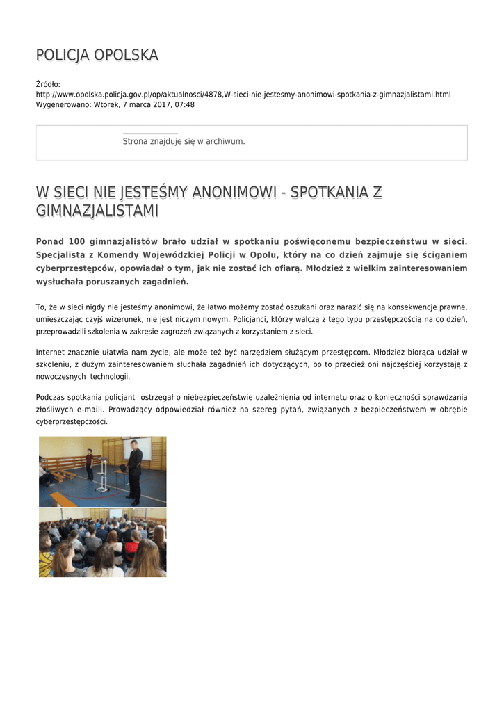 POLICJA OPOLSKA Źródło: http://www.opolska.policja.gov.pl/op/aktualnosci/4878,W-sieci-nie-jestesmy-anonimowi-spotkania-z-gimnazjalistami.html Wygenerowano: Wtorek, 7 marca 2017, 07:48 Strona znajduje się w archiwum. W SIECI NIE JESTEŚMY ANONIMOWI - SPOTKANIA Z GIMNAZJALISTAMI Ponad 100 gimnazjalistów brało udział w spotkaniu poświęconemu bezpieczeństwu w sieci. Specjalista z Komendy Wojewódzkiej Policji w Opolu, który na co dzień zajmuje się ściganiem cyberprzestępców, opowiadał o tym, jak nie zostać ich ofiarą. Młodzież z wielkim zainteresowaniem wysłuchała poruszanych zagadnień. To, że w sieci nigdy nie jesteśmy anonimowi, że łatwo możemy zostać oszukani oraz narazić się na konsekwencje prawne, umieszczając czyjś wizerunek, nie jest niczym nowym. Policjanci, którzy walczą z tego typu przestępczością na co dzień, przeprowadzili szkolenia w zakresie zagrożeń związanych z korzystaniem z sieci. Internet znacznie ułatwia nam życie, ale może też być narzędziem służącym przestępcom. Młodzież biorąca udział w szkoleniu, z dużym zainteresowaniem słuchała zagadnień ich dotyczących, bo to przecież oni najczęściej korzystają z nowoczesnych technologii. Podczas spotkania policjant ostrzegał o niebezpieczeństwie uzależnienia od internetu oraz o konieczności sprawdzania złośliwych e-maili. Prowadzący odpowiedział również na szereg pytań, związanych z bezpieczeństwem w obrębie cyberprzestępczości. Ocena: 0/5 (0) Tweetnij cyberprzestępczość, szkolenie, gimnazjaliści