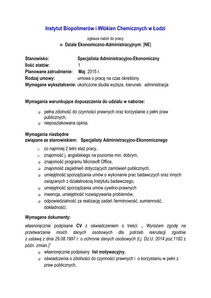 Instytut Biopolimerów i Włókien Chemicznych w Łodzi ogłasza nabór do pracy w Dziale Ekonomiczno-Administracyjnym: [NE] Stanowisko: Specjalista Administracyjno-Ekonomiczny Ilość etatów: 1 Planowane zatrudnienie: Maj 2015 r. Rodzaj umowy: umowa o pracę na czas określony Wymagane wykształcenie: ukończone studia wyższe, kierunek: administracja Wymagania warunkujące dopuszczenia do udziału w naborze:   pełna zdolność do czynności prawnych oraz korzystanie z pełni praw publicznych, nieposzlakowana opinia. Wymagania niezbędne związane ze stanowiskiem: Specjalisty Administracyjno-Ekonomicznego         co najmniej 2 letni staż pracy, znajomość j. angielskiego na poziomie min. dobrym, znajomość programu Microsoft Office, znajomość zagadnień dotyczących zamówień publicznych, umiejętność sporządzania umów o wykonanie prac badawczych oraz innych związanych z działalnością Instytutu badawczego, umiejętność sporządzania umów cywilno-prawnych inwencja, umiejętność rozwiązywania problemów, odpowiedzialność za realizację zadań /terminowość, sumienność, dokładność/, Wymagane dokumenty: własnoręcznie podpisane CV z oświadczeniem o treści: „ Wyrażam zgodę na przetwarzanie moich danych osobowych dla potrzeb rekrutacji zgodnie z ustawą z dnia 29.08.1997 r. o ochronie danych osobowych (t.j. Dz.U. 2014 poz.1182 z późn. zmian.)”  własnoręcznie podpisany list motywacyjny,  oświadczenia o zdolności do czynności prawnych i o korzystaniu w pełni z praw publicznych,     kopie dokumentów potwierdzających wykształcenie, dokumenty potwierdzające kwalifikacje zawodowe, świadectwa pracy, własnoręcznie podpisane oświadczenie o treści: „Wyrażam zgodę na objęcie mnie w procesie rekrutacji badaniem wiarygodności zawodowej” Osoby zainteresowane proszone są o składanie swoich aplikacji (Cv, List motywacyjny) do dnia 26-04-2015 r. w sekretariacie Instytutu lub nadesłanie pocztą na adres: Instytut Biopolimerów i Włókien Chemicznych ul. M. Skłodowskie-Curie 19/27 90-570 Łódź Instytut zatrudnia osoby z orzeczoną niepełnosprawnością UWAGA: Dokumenty powinny znajdować się w zamkniętej kopercie oznaczonej imieniem i nazwiskiem kandydata z dopiskiem ,,Dotyczy naboru na stanowisko: Specjalista Administracyjno-Ekonomiczny; znak referencyjny: NE. Wybrani kandydaci zostaną telefonicznie powiadomieni o terminie rozmowy kwalifikacyjnej. Dokumenty aplikacyjne pozostałych kandydatów nie zaproszonych będą przechowywane w Dziale Personalnym Instytutu do dnia 31-05-2015 r. Po upływie tego terminu nieodebrane przez kandydatów dokumenty zostaną komisyjnie zniszczone. Dokumenty doręczone po terminie, w innej formie niż osobiście lub pocztą, bez dopisku lub niekompletne nie będą rozpatrywane. Instytut nie odsyła dokumentów kandydatów. DYREKTOR